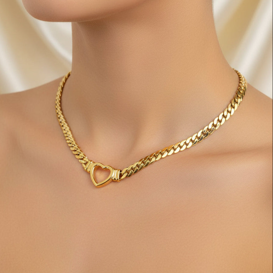 This stunning statement chain features a beautiful heart pendant as its centrepiece, set on a sleek flattened snake chain. Bold yet feminine, this chunky necklace is the perfect accessory to elevate any outfit and add an effortless touch of glamour and cool.