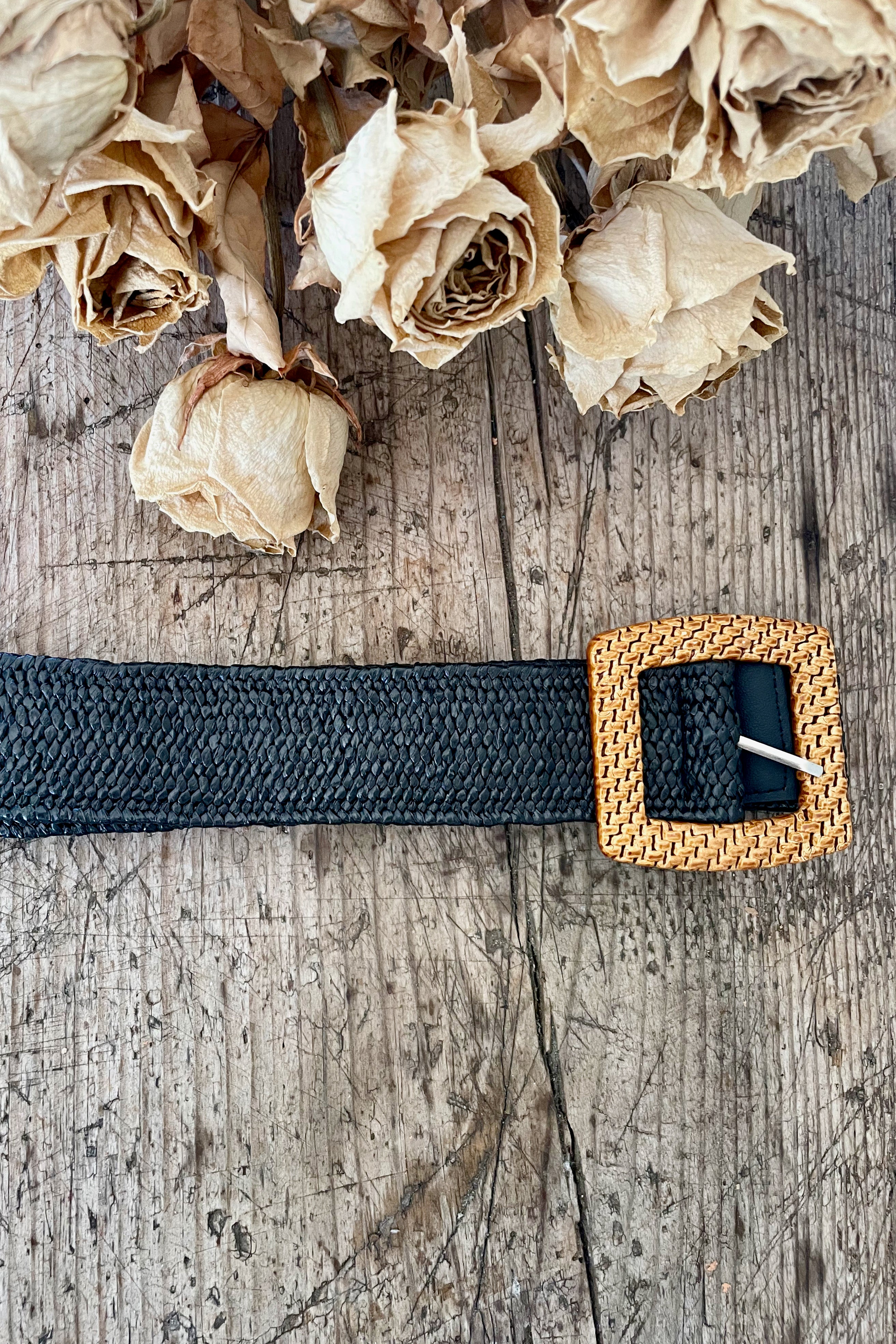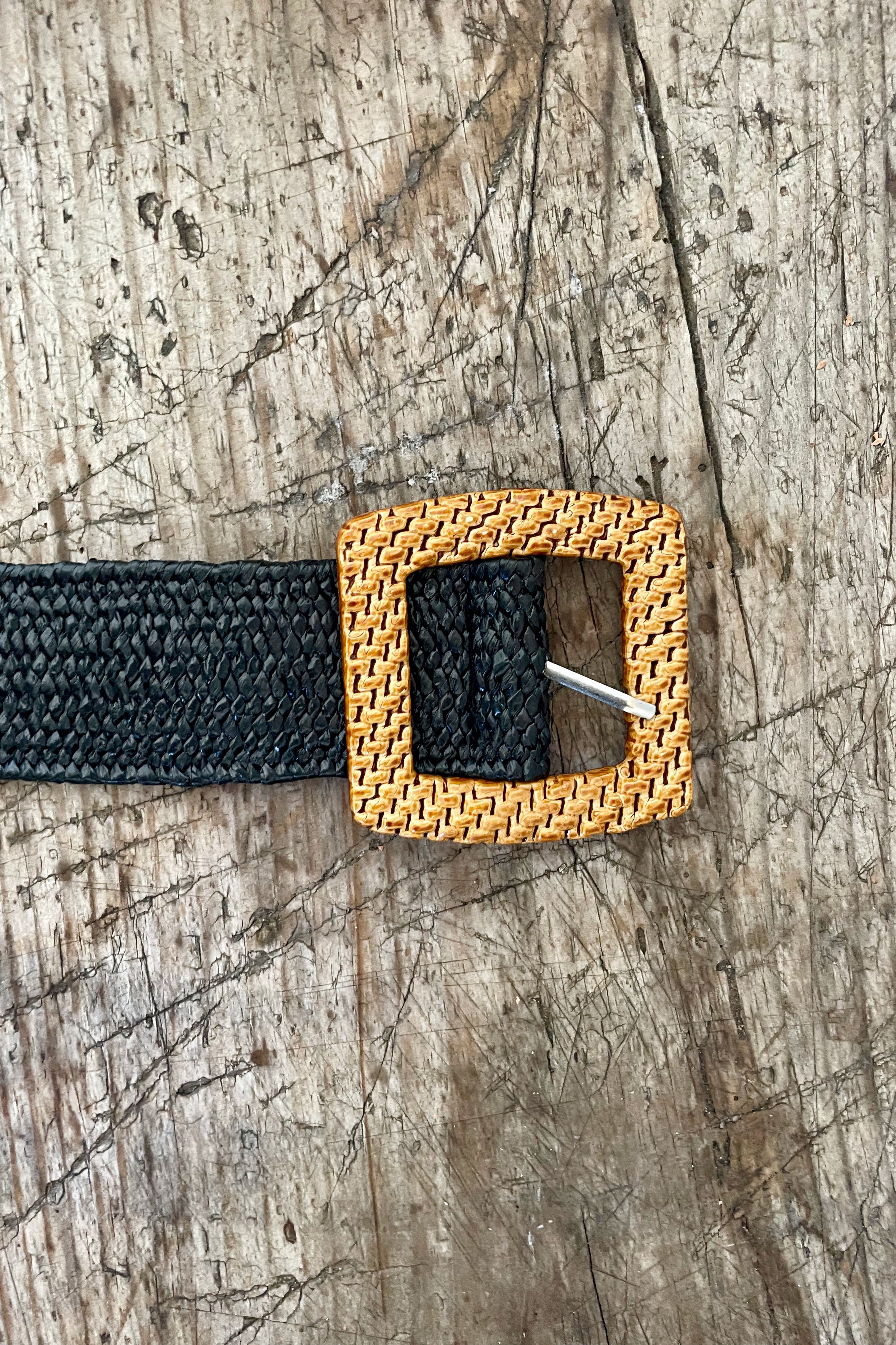 This belt is an elasticated weave material with a ratan inspired buckle. We love this belt as there are no holes and you just poke the prong through the elastic weave.