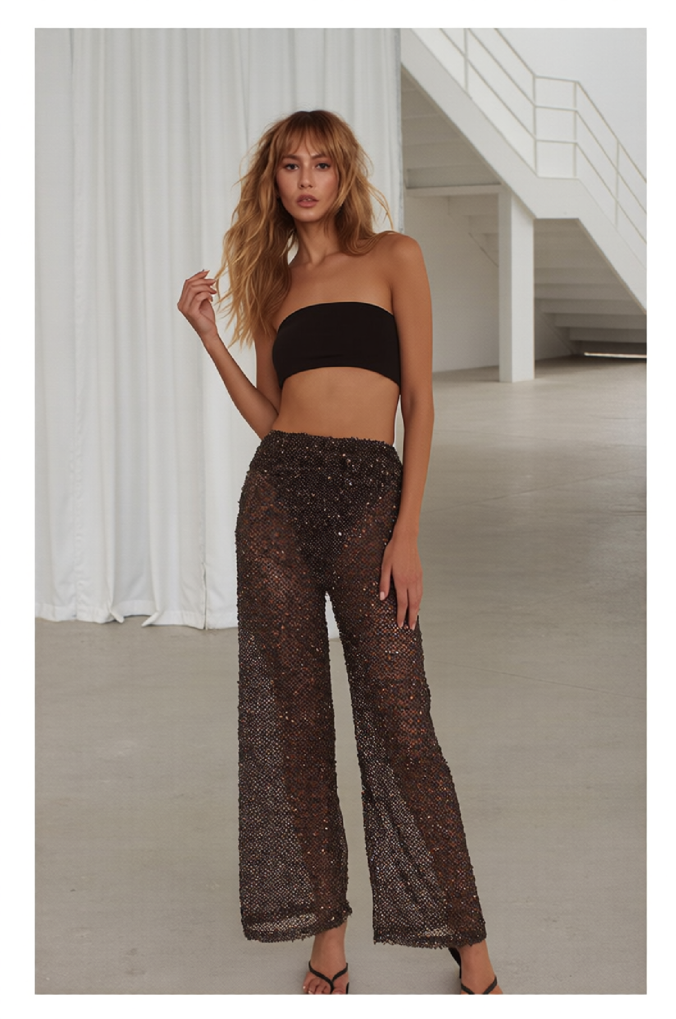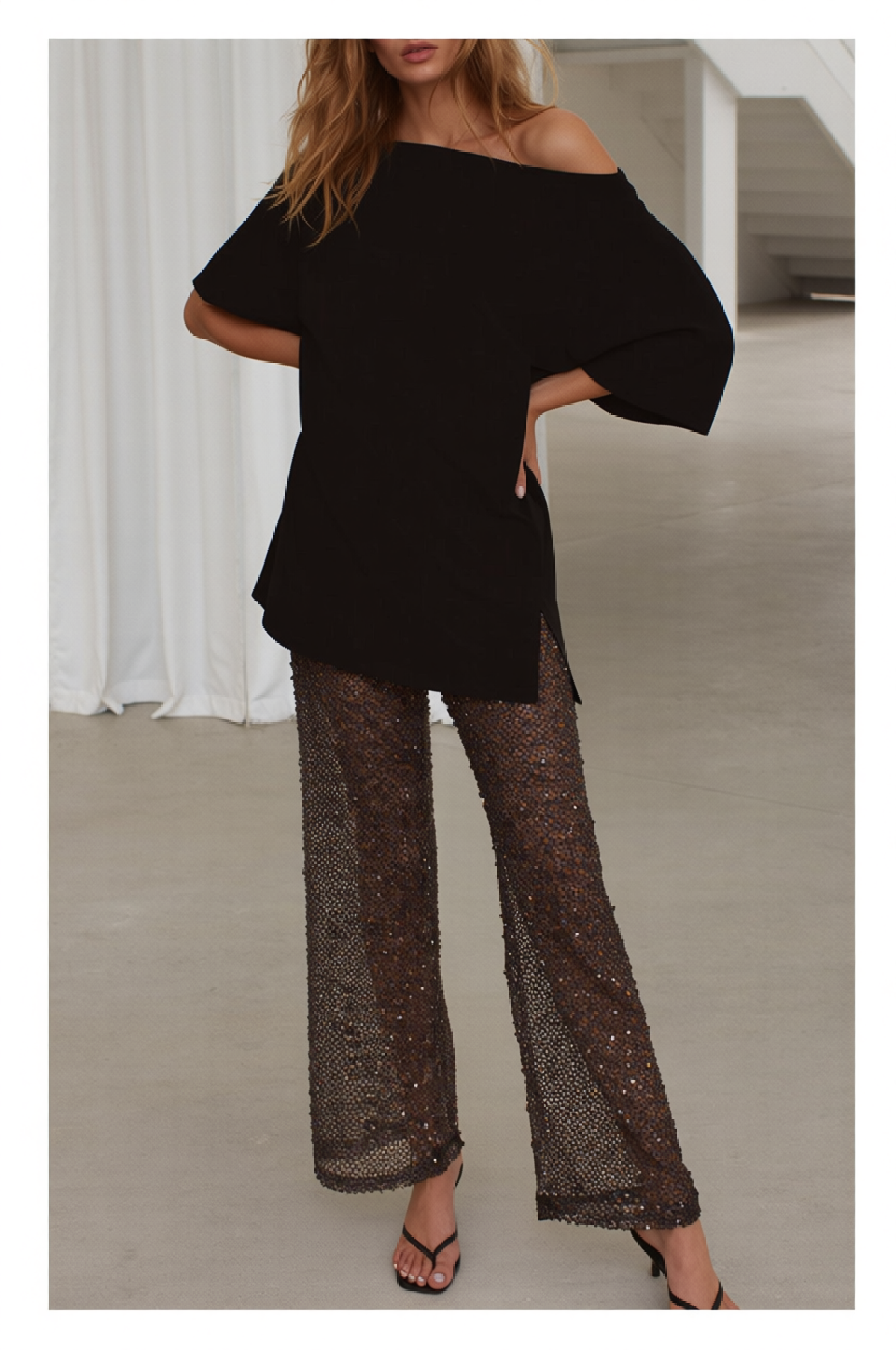 Crafted from sheer mesh with delicate sequins woven throughout, they bring the perfect touch of subtle sparkle and effortless glam. Designed with a relaxed, wide-leg fit, they’re as comfortable as they are eye-catching.