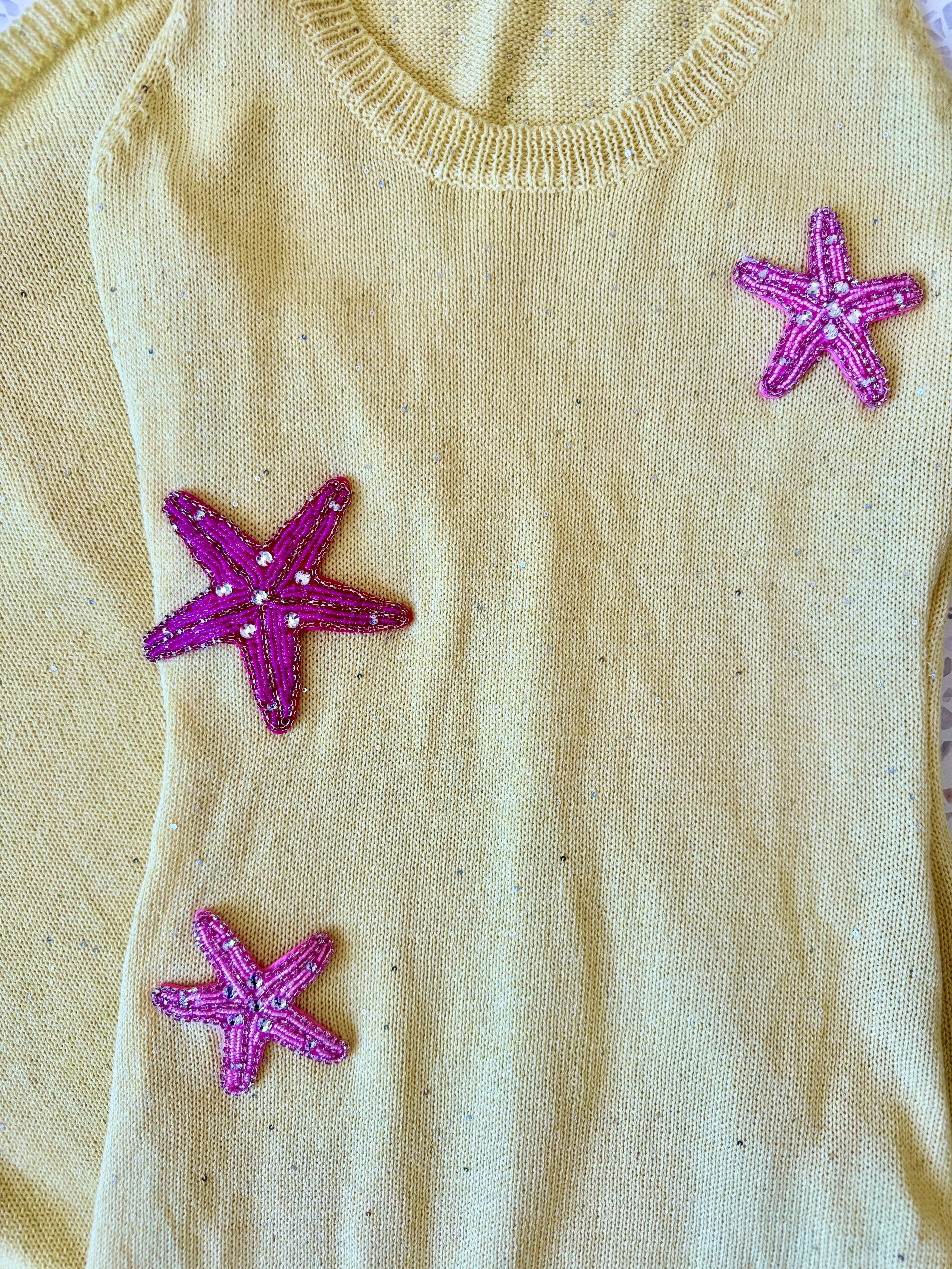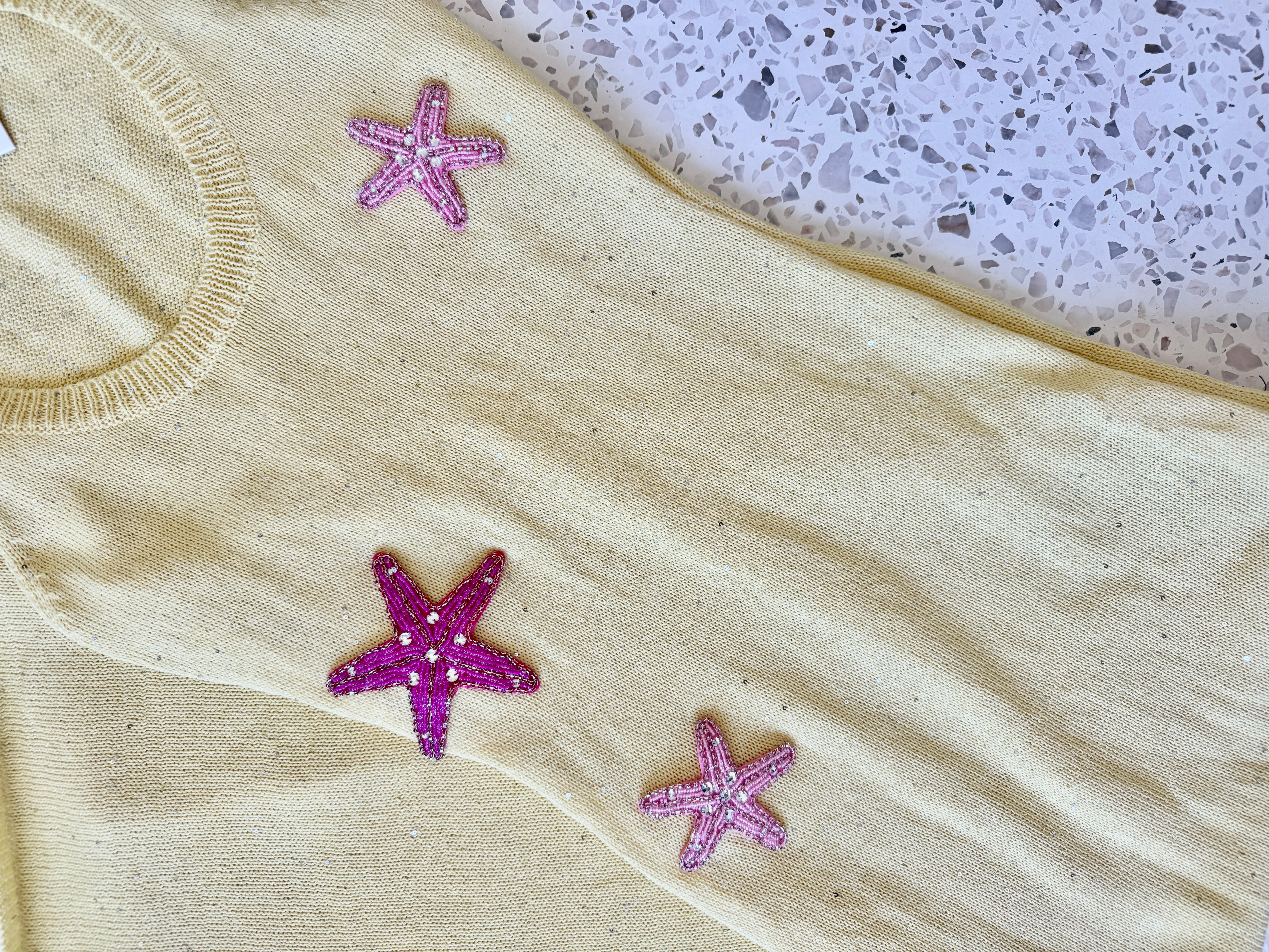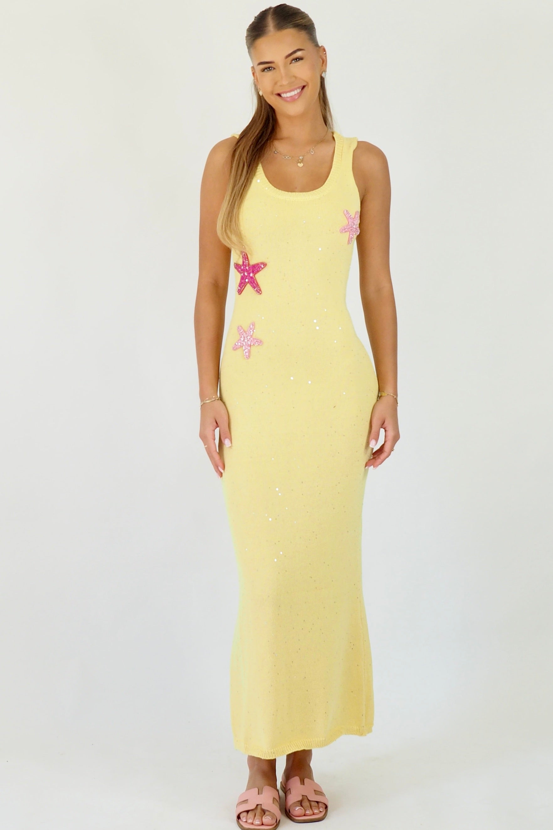 This gorgeous yellow knitted maxi dress is a soft kn it with tiny sequins sewn into the facbric to give it a shibne. It also feature some bright and fun contrasting seashells sewn on that are inticately made from beads and sequins.