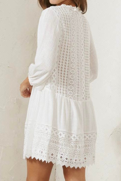 Femme and flowy lace detail mini dress featuring a mid lantern sleeves and lace inserting for added dimension.