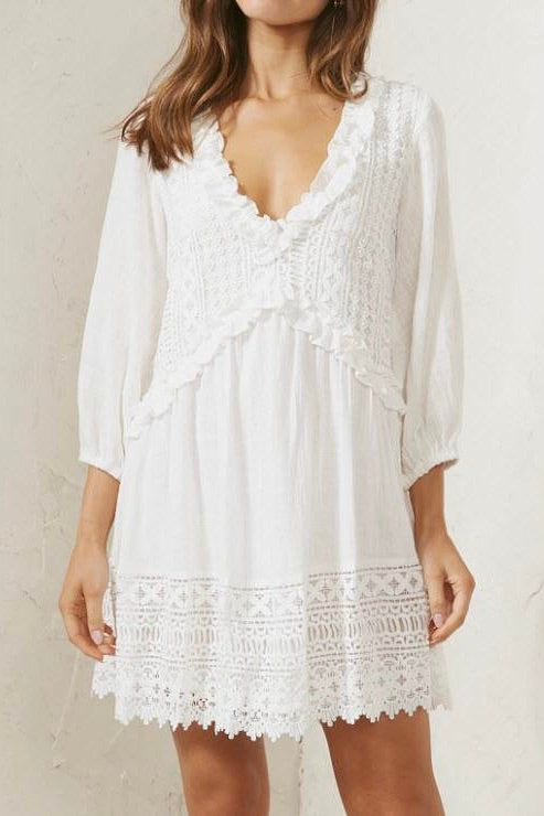 This gorgeous mini dress features a V ruffle neckline, lace bust and lace trim on the bottom hem, and a lace insert on the back.