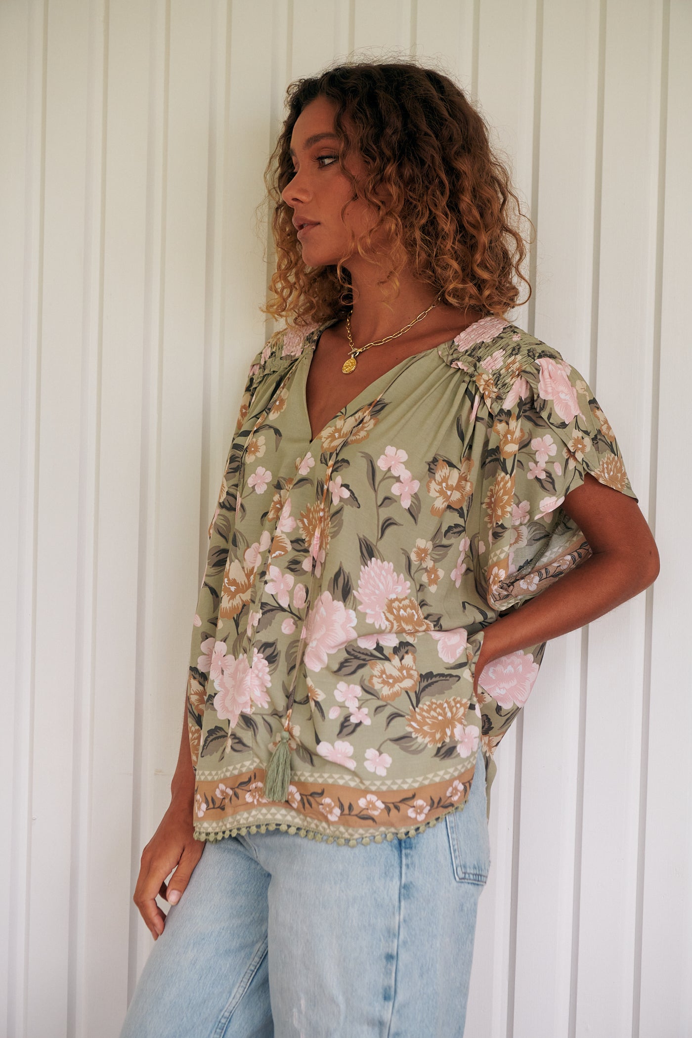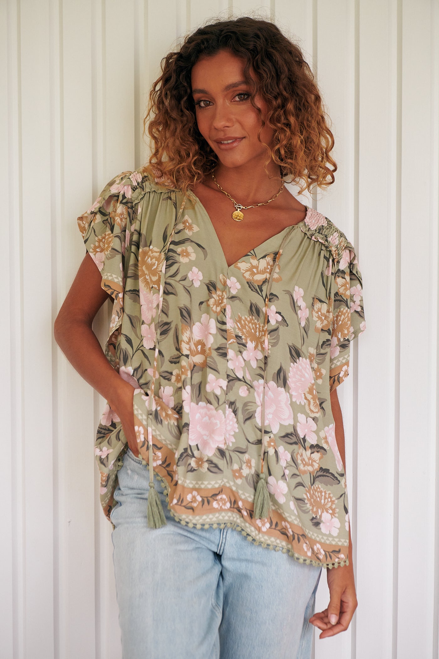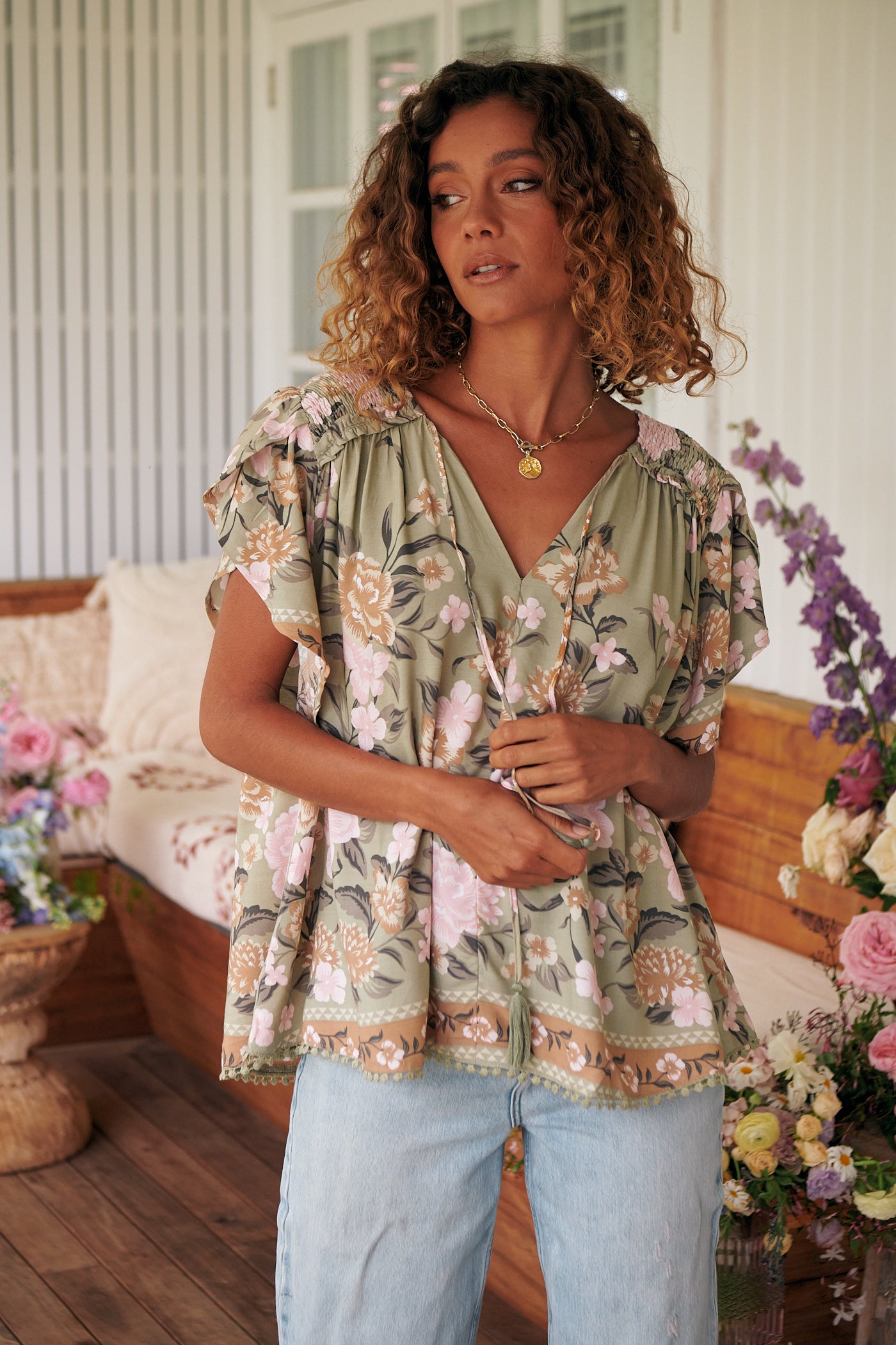 The lovely Delilah Blouse has a beautiful khaki and pink floral pattern and is so unique and pretty.