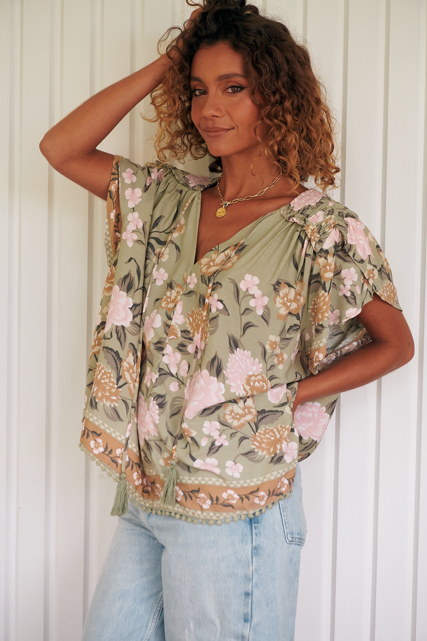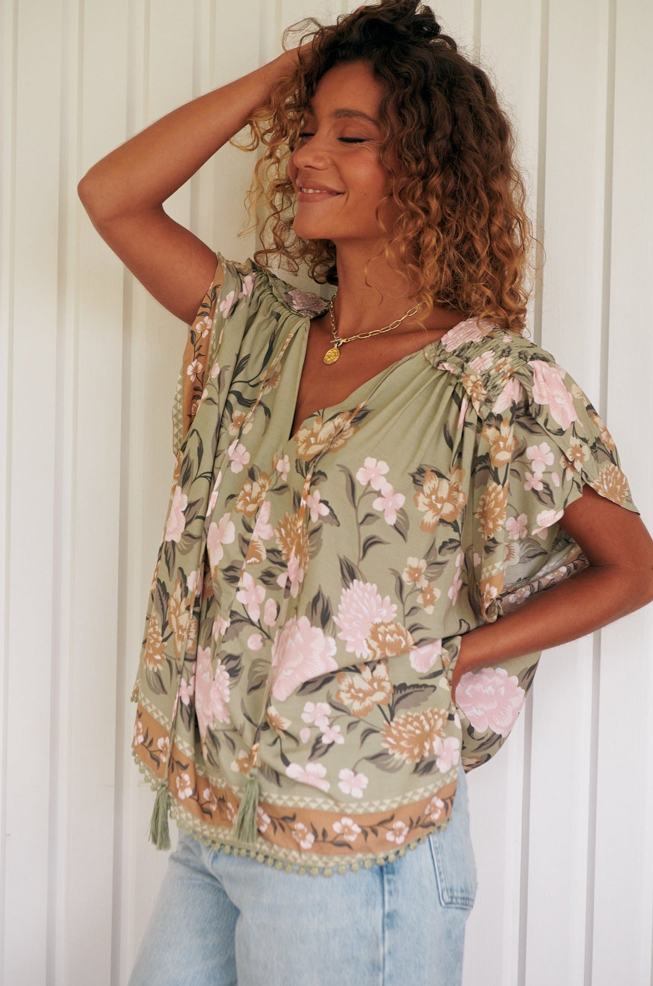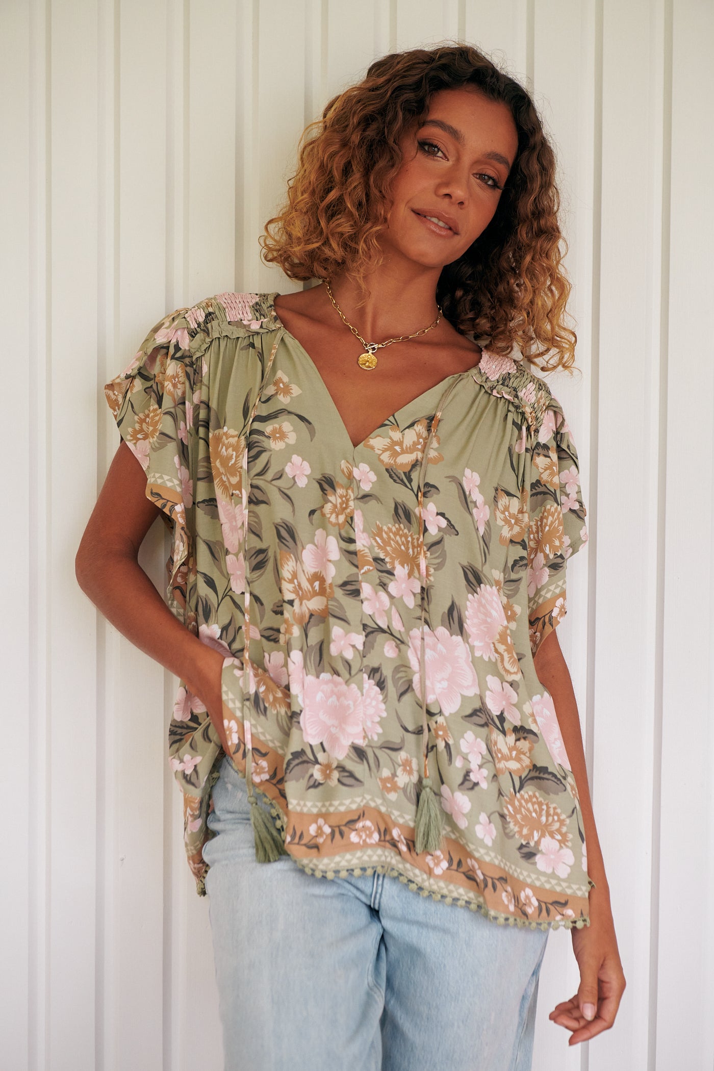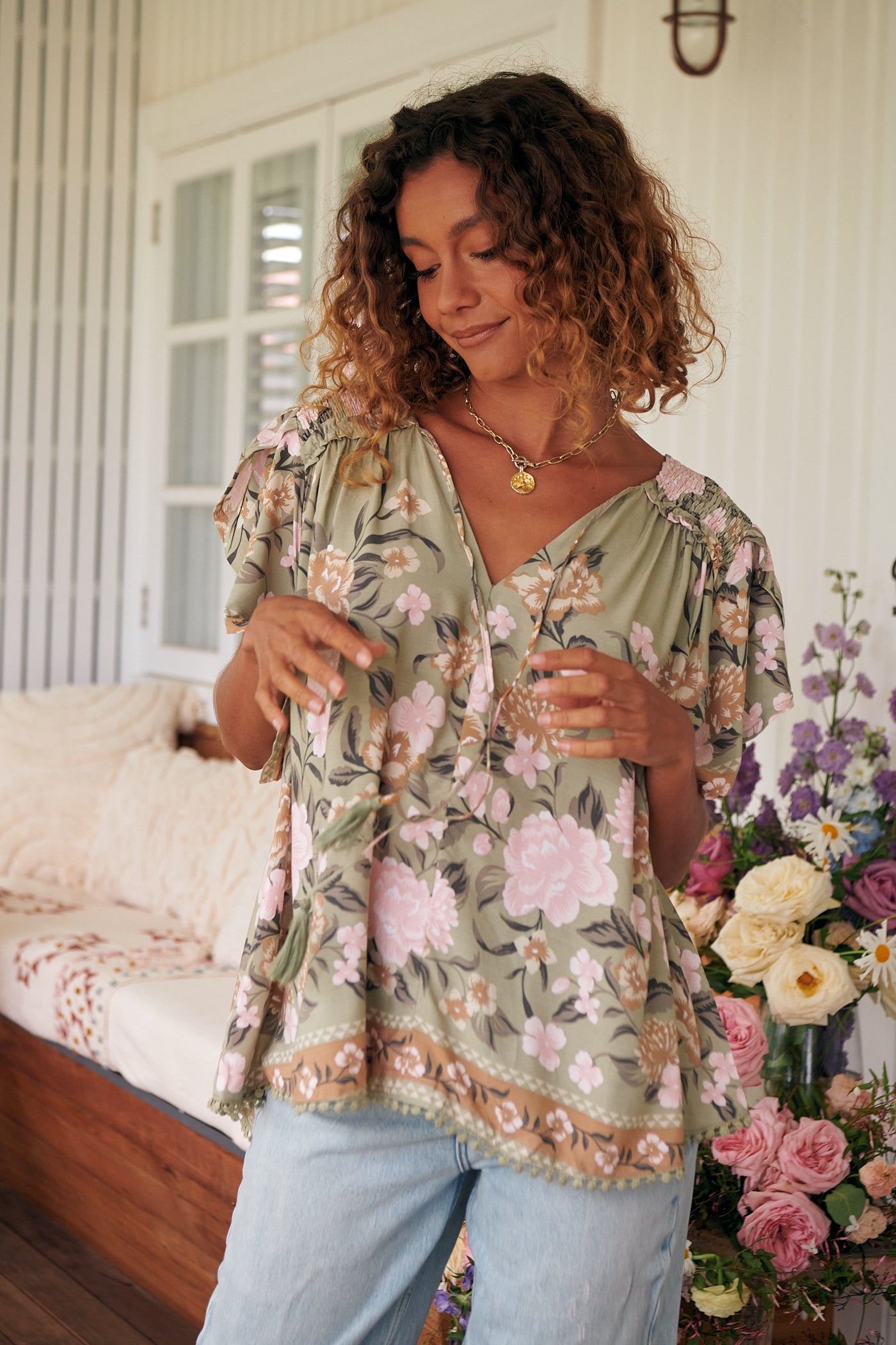 The lovely Delilah Blouse has a beautiful khaki and pink floral pattern and is so unique and pretty.