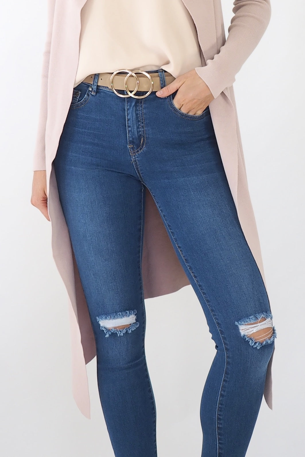 This seasons Must Have Ripped jeans in Blue with yellow/orange stitching.