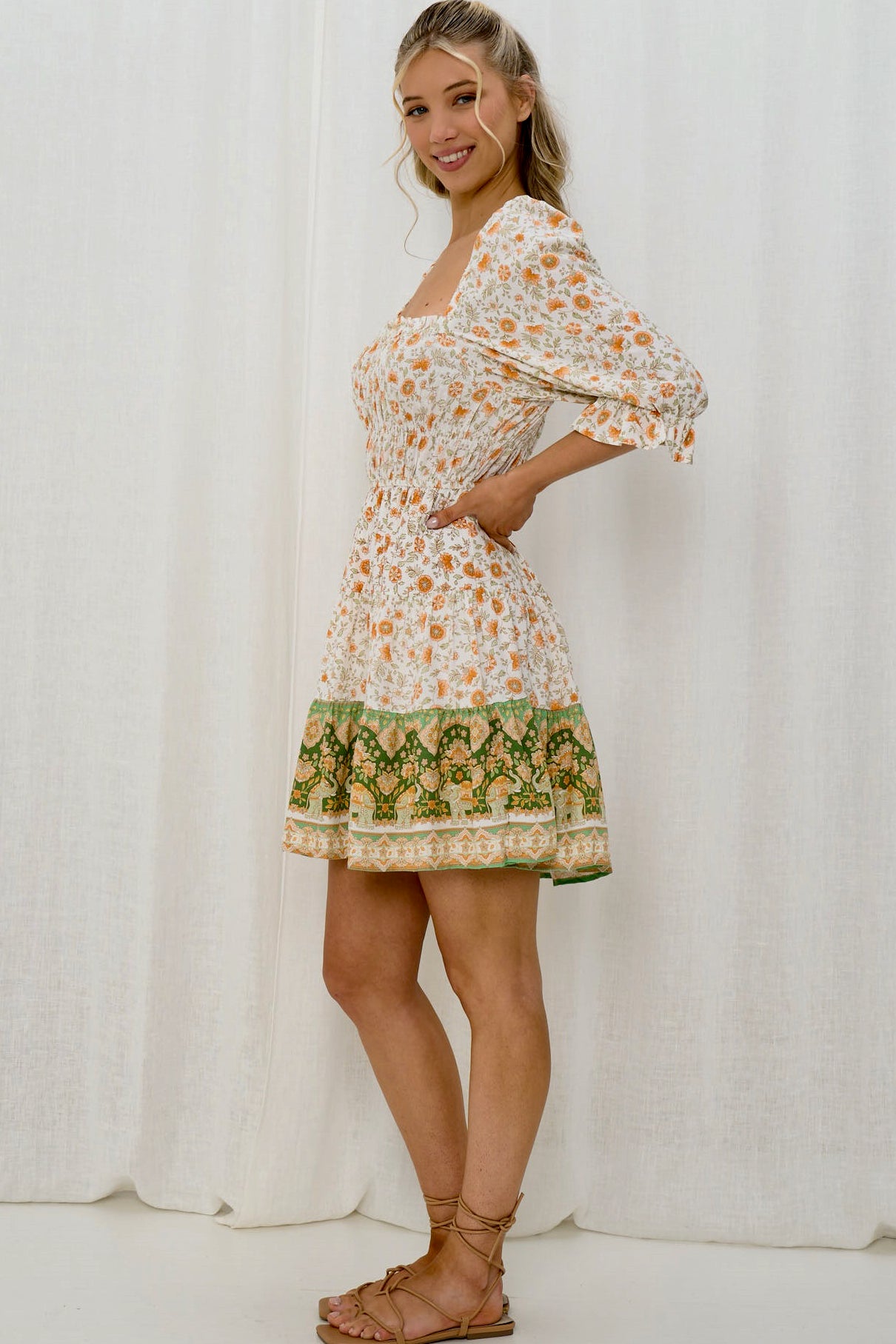 This mini features a gorgeous floral fabrication with a shirred bust for a perfect fit around the bust.
