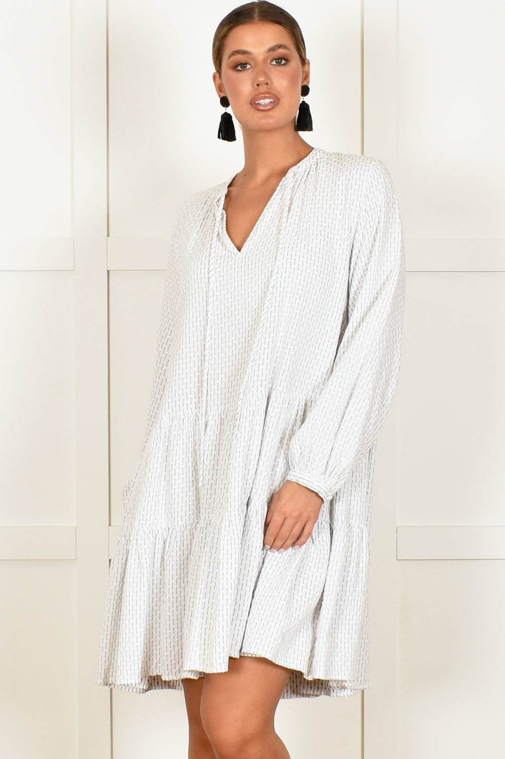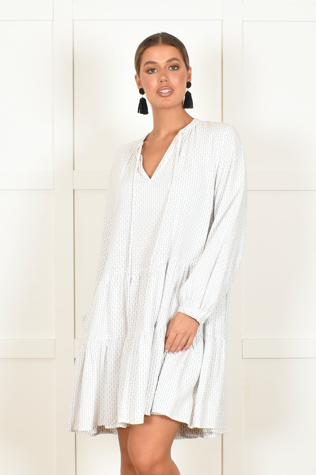 The Stephanie Mini is a stunning tunic dress mini style featuring a mandarin collar that forms a V neck. It is a relaxed fit with a relaxed sleeve.