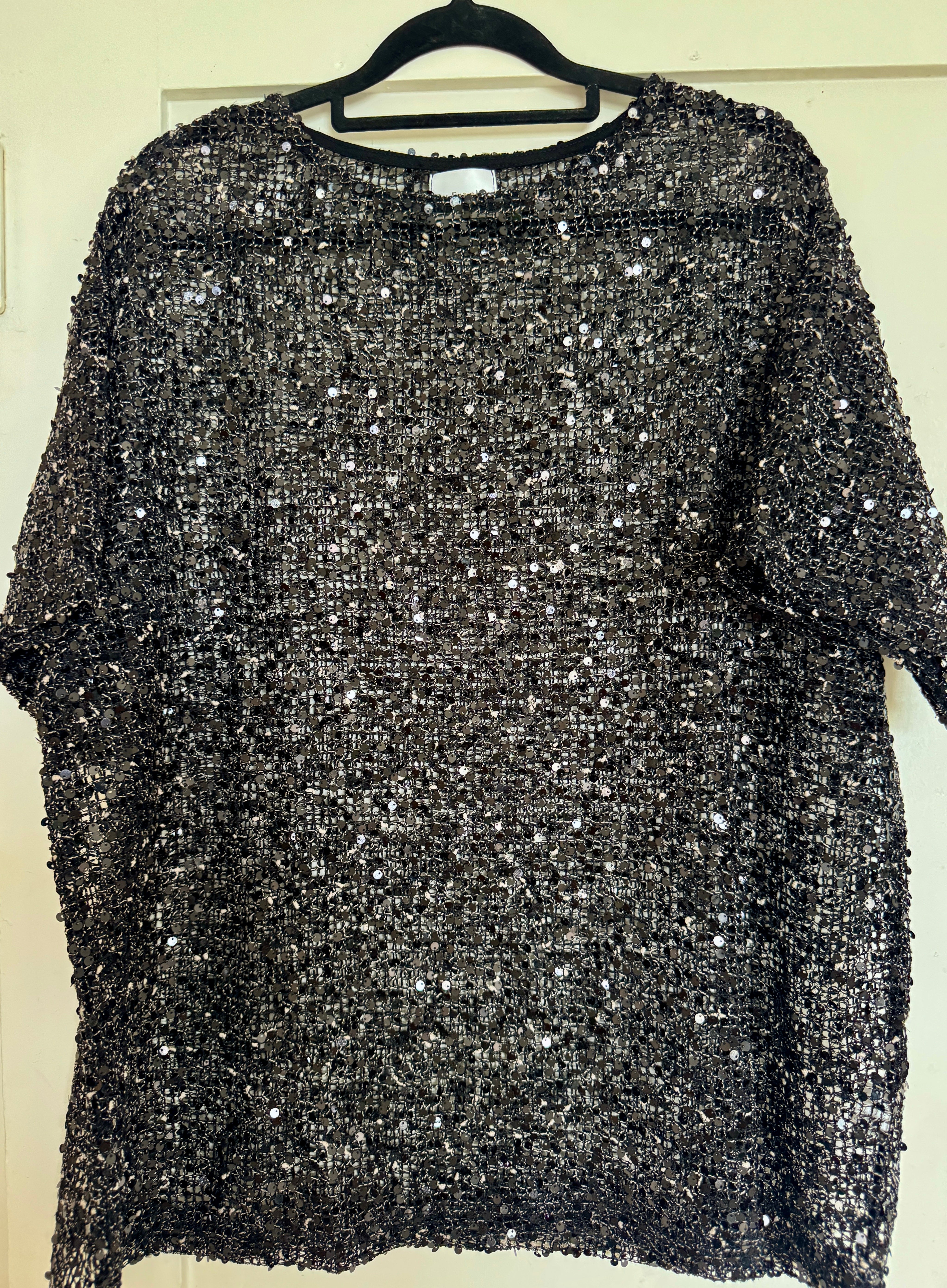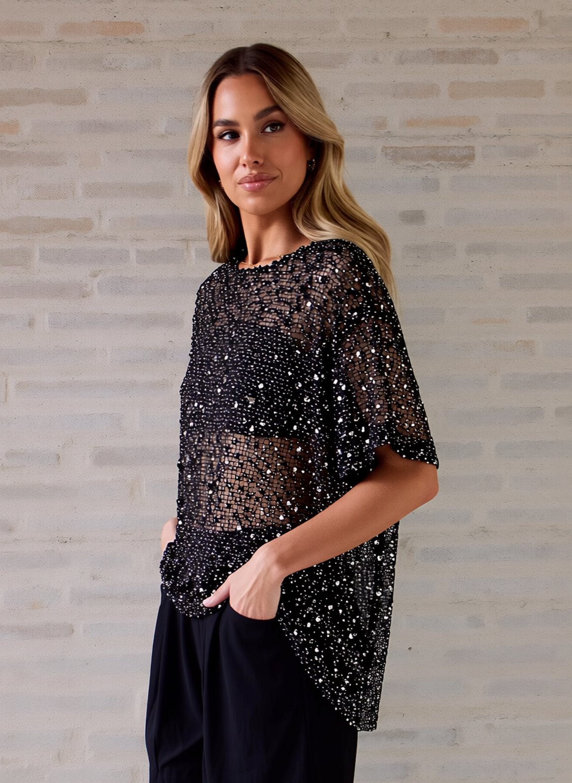The perfect mesh top, featuring sparkles and sequins delicately sewn into the fabric. This effortless piece is designed with an oversized fit that’s relaxed, comfortable, and easy to wear.