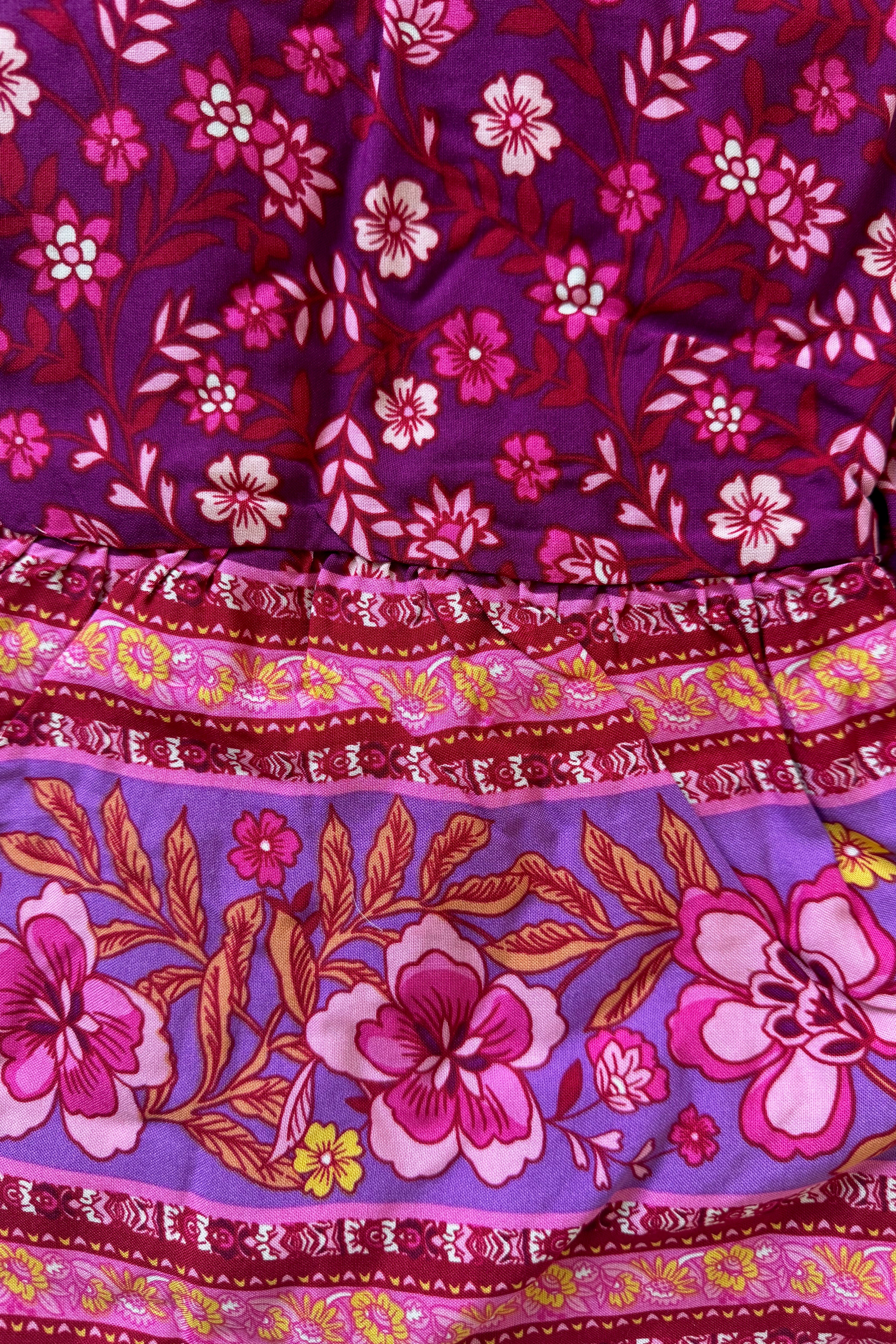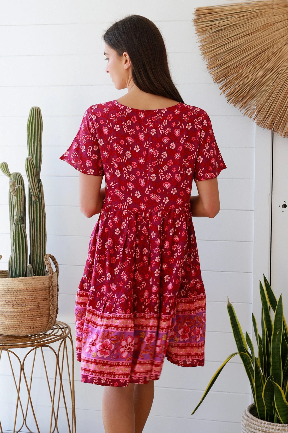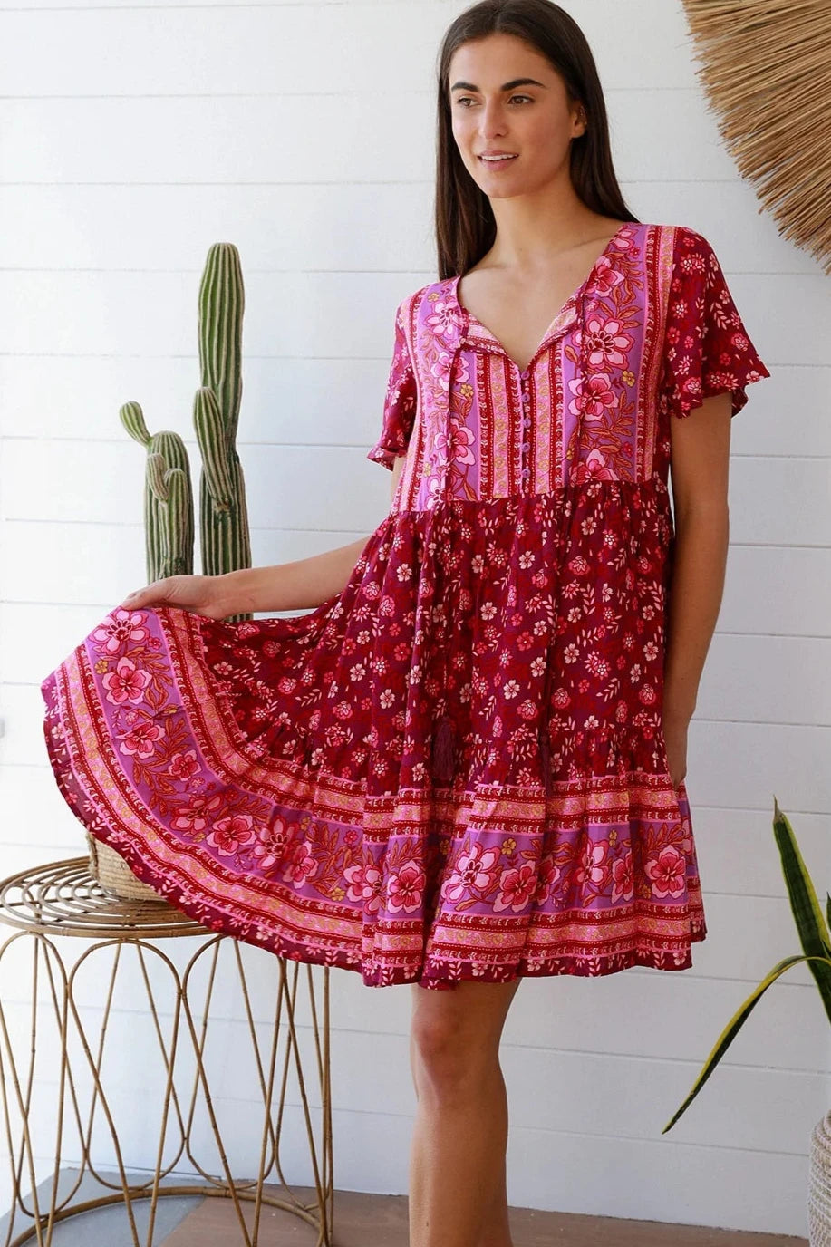 The stunning Nalini mini dress is a vibrant pink/purple and red colour, and the mini is relaxed and flowey and offers both style and comfort.