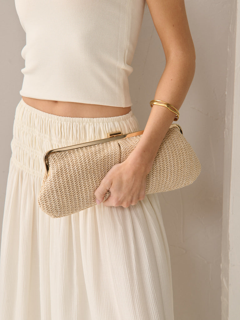 Chic, minimal, and effortlessly polished, this straw clutch is your go-to for both day and night. Featuring a sleek metal closure, and a fully lined interior, it's designed to hold your essentials in style.