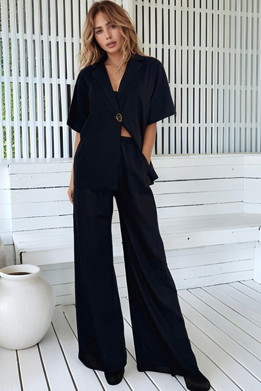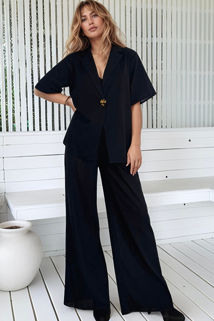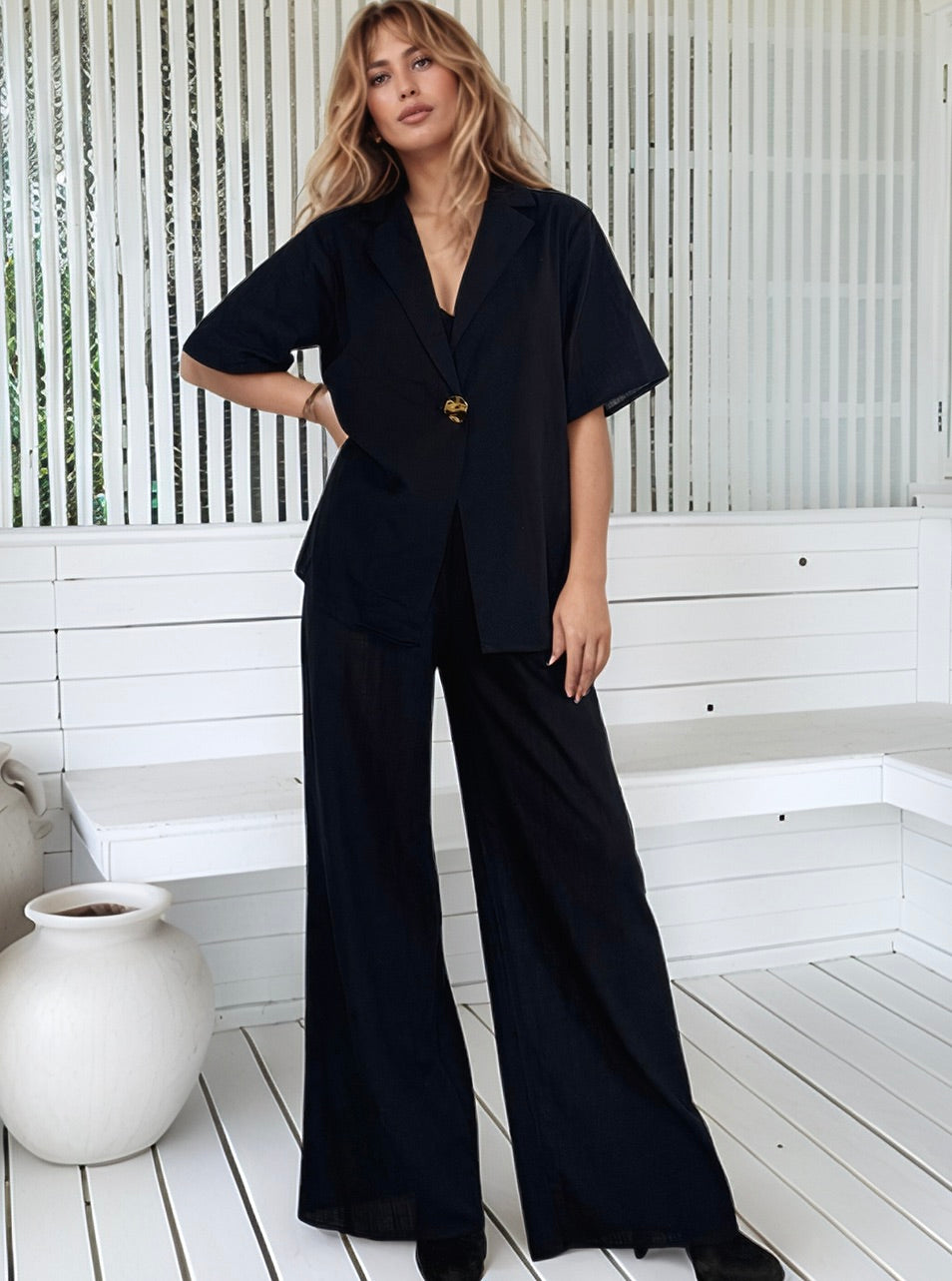 This versatile two-piece can be worn together as a set or styled separately. It features a relaxed cotton-linen look shirt with a classic collar and statement gold buttons, paired with matching relaxed-fit pants for all-day comfort and style.