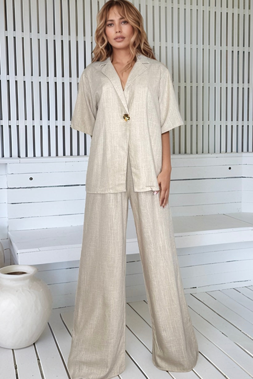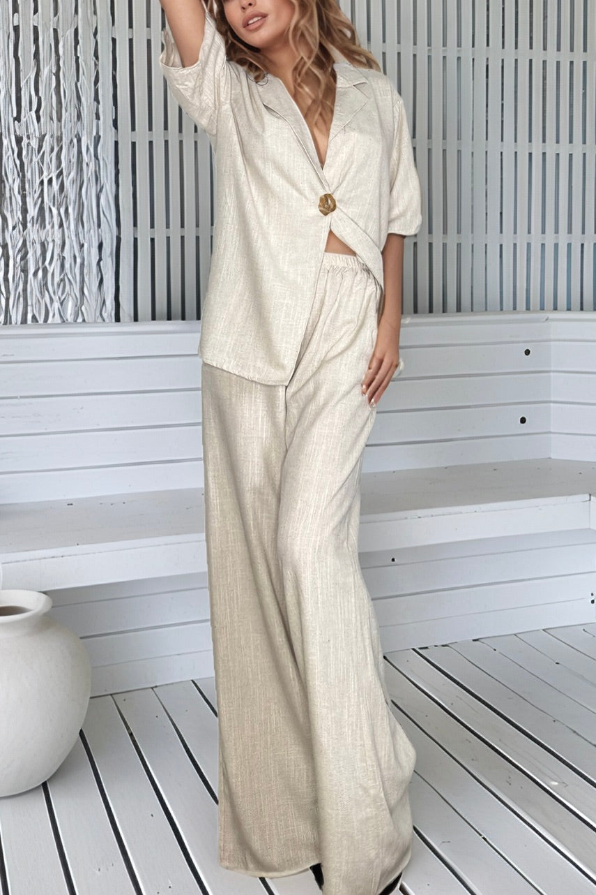 This versatile two-piece can be worn together as a set or styled separately. It features a relaxed cotton-linen look shirt with a classic collar and statement gold buttons, paired with matching relaxed-fit pants for all-day comfort and style.