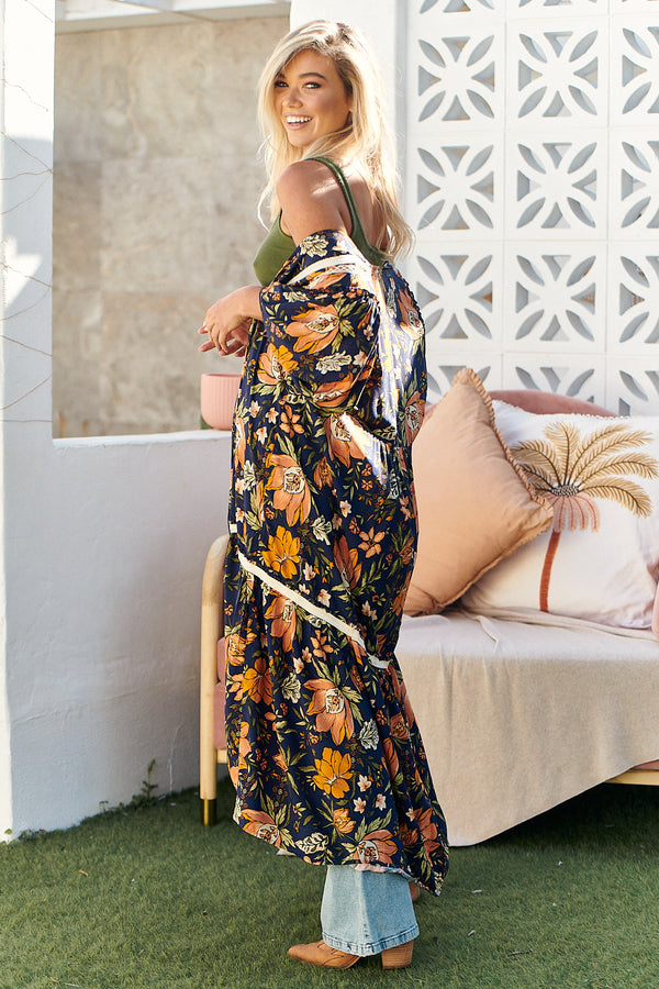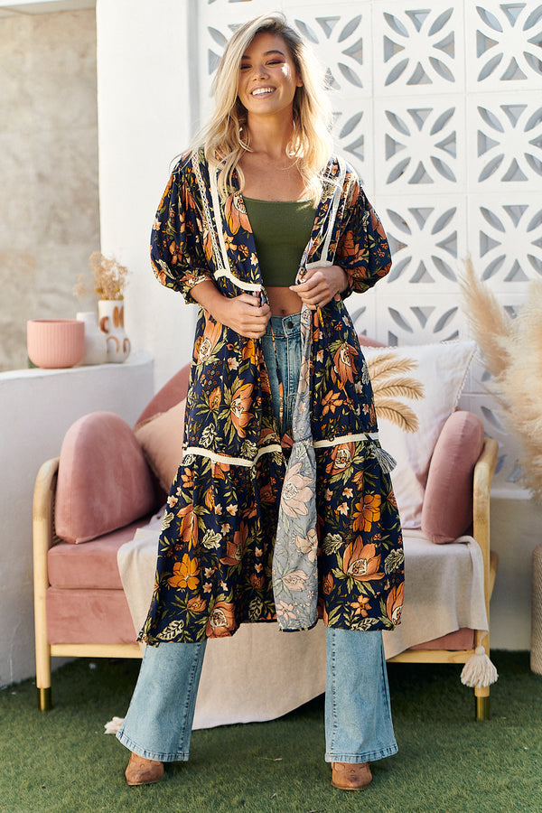 The Mali Kimono features a unique floral fabrication with cream crochet trims for added style. Perfect for layering or wear basic colours under this gorgeous kimono. Throw over jeans and a top, or belt it to really dress the kimono up.
