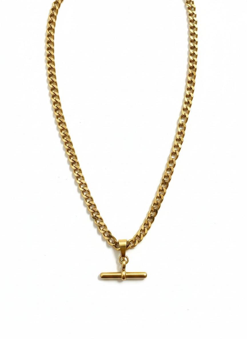 Crafted from tarnish-free 18K gold-plated stainless steel, the necklace showcases a simple vintage toggle-bar design that adds effortless elegance to any outfit.
