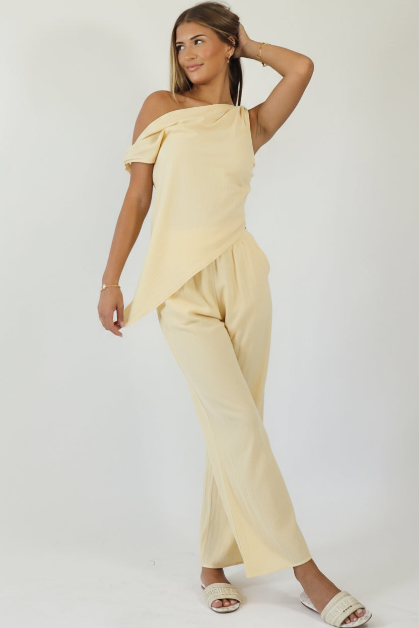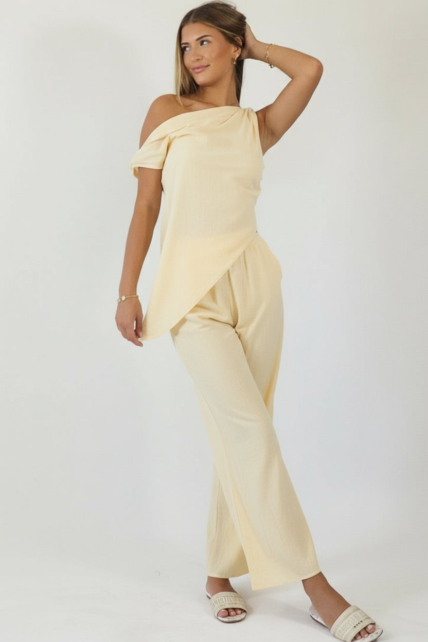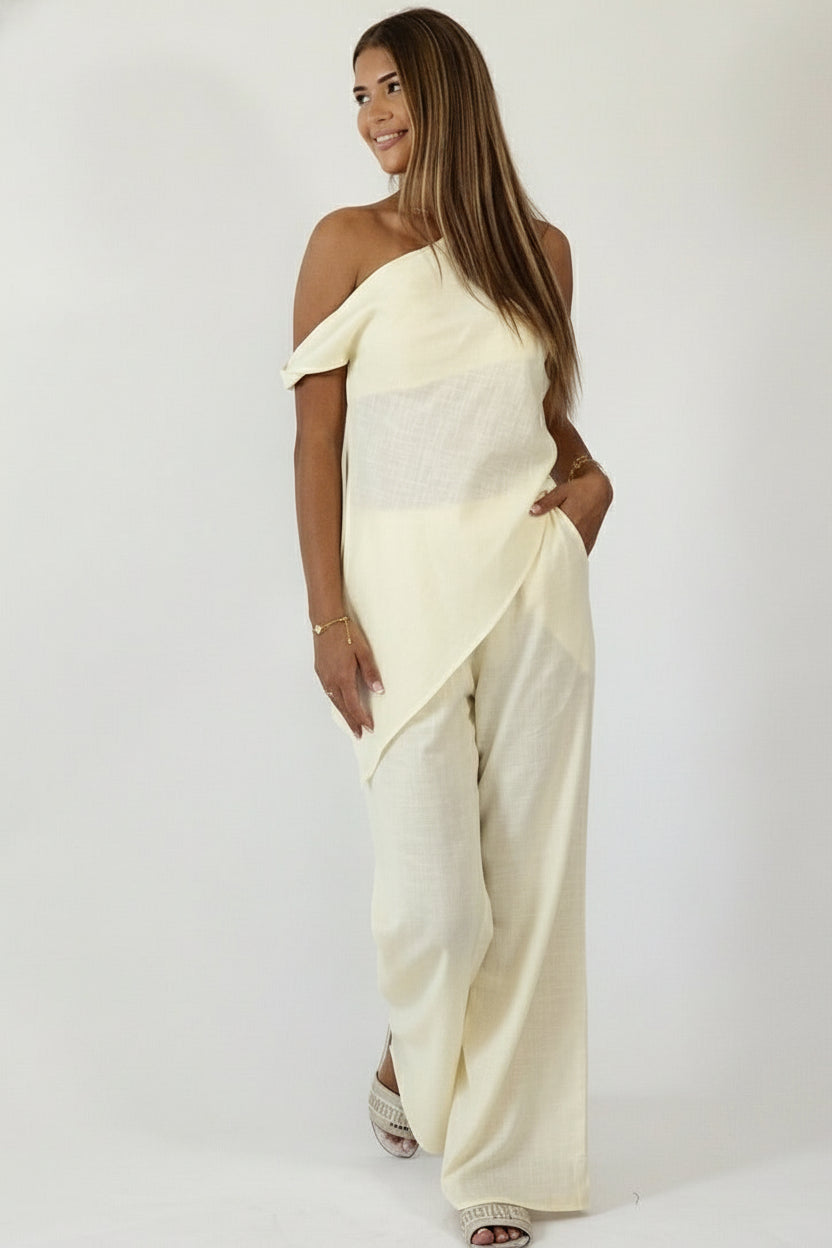 This stunning two-piece can be worn together or styled separately. It features a light yellow asymmetrical off-the-shoulder top with a unique angled cut and lined bust, paired with relaxed white pants for the ultimate blend of comfort and style.
