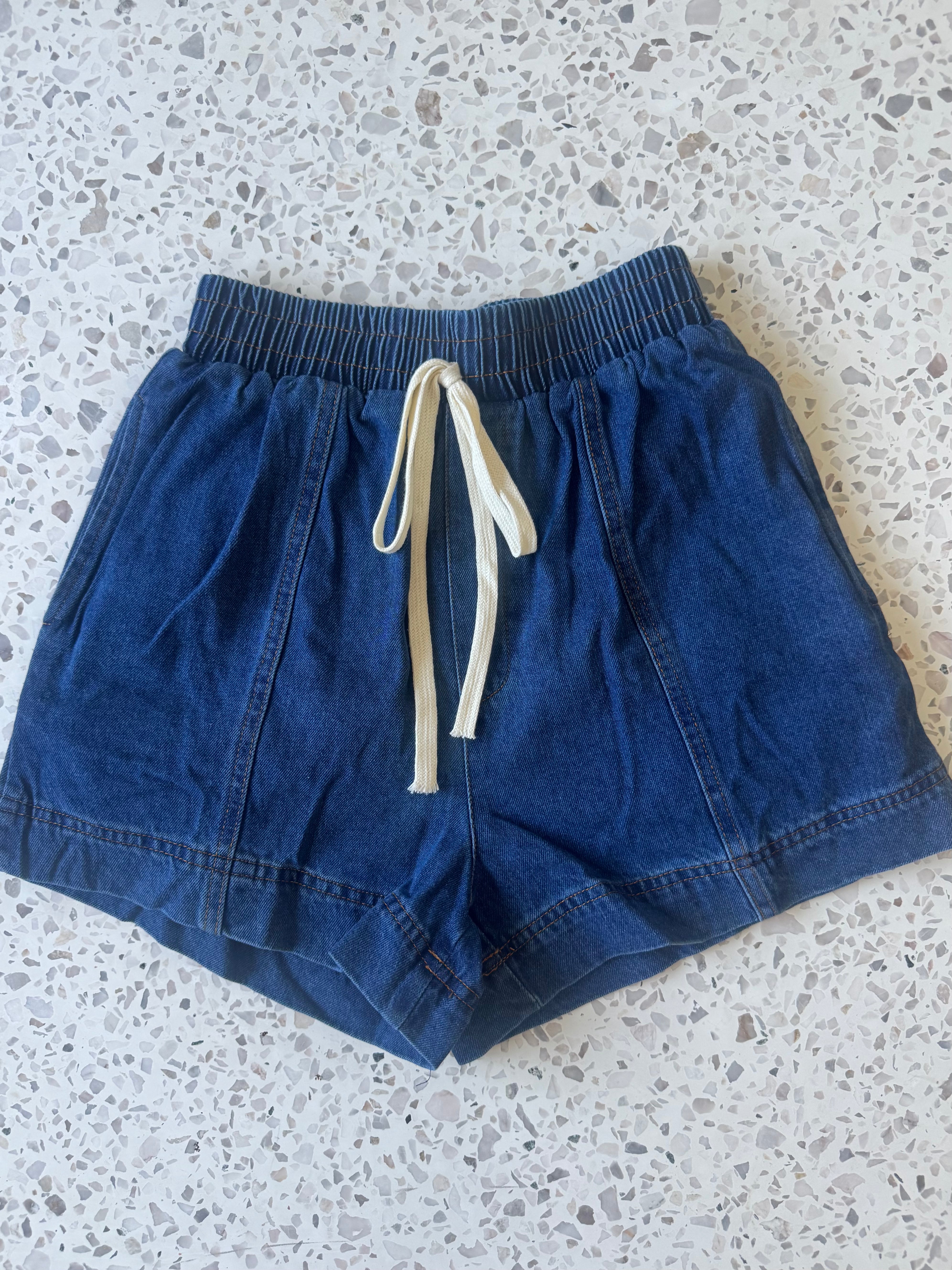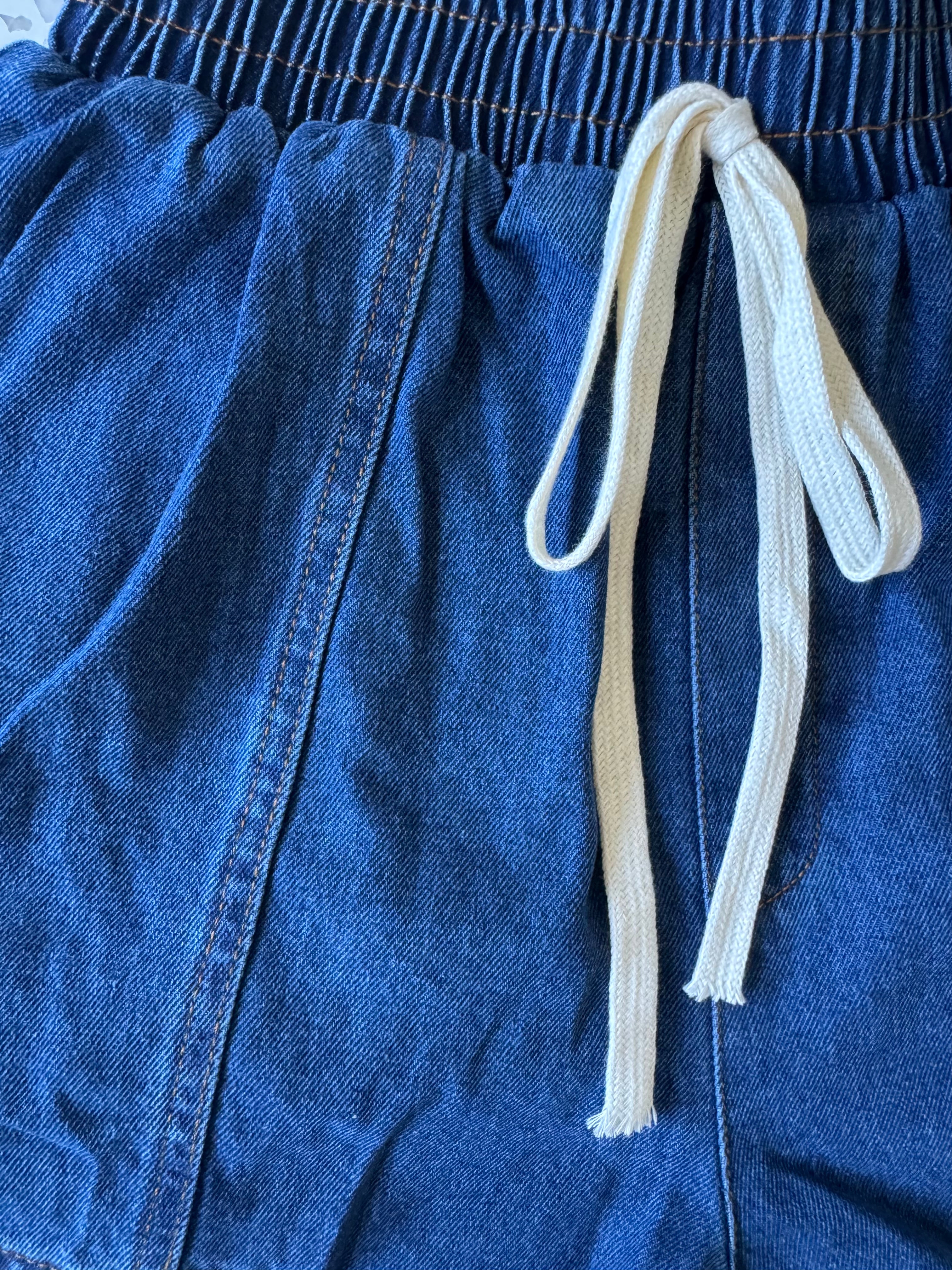 Made from dark denim with contrasting brown stitching, these high-waisted shorts feature an elasticated waistband, practical pockets, and a faux cream tie for a relaxed yet stylish finish.