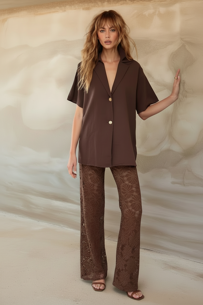 This two piece can be worn as a set or separate. This gorgeous set includes a flattering relaxed cotton linen look shirt with a collar and gold buttons, and a pair of sheer lace pants.
