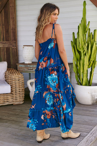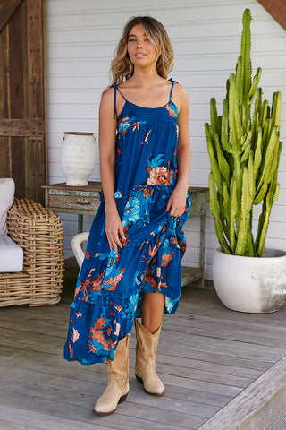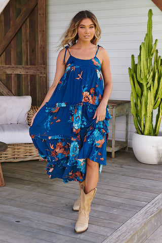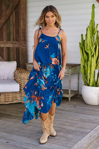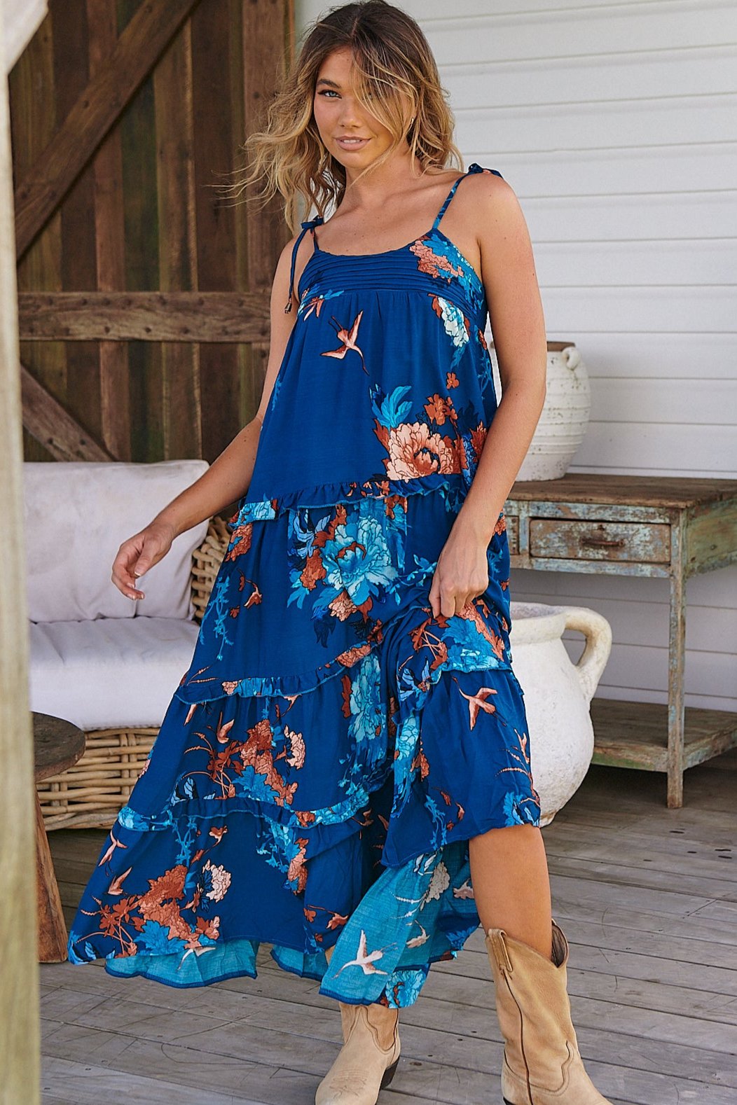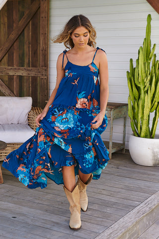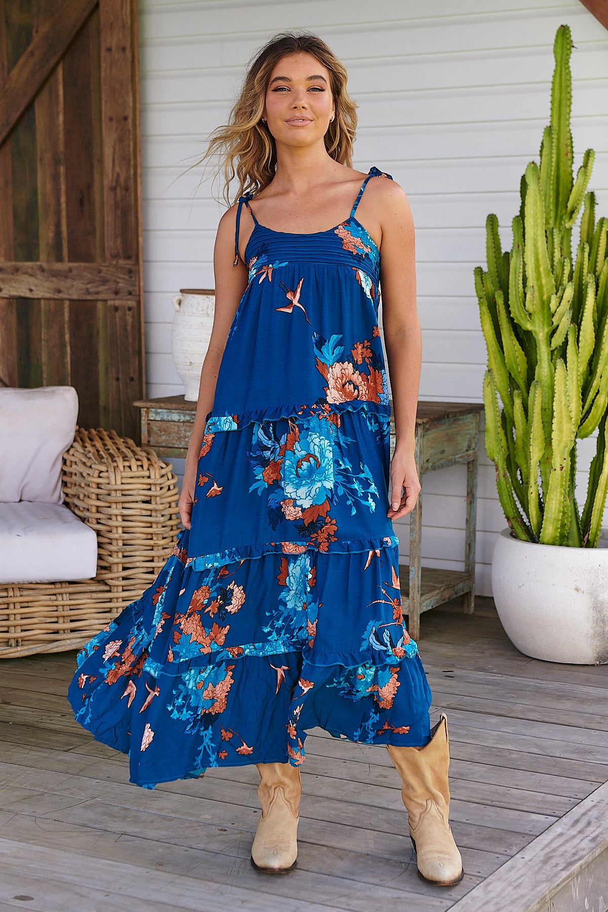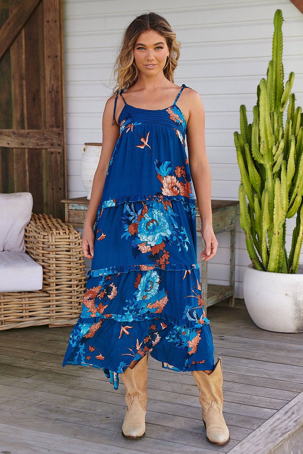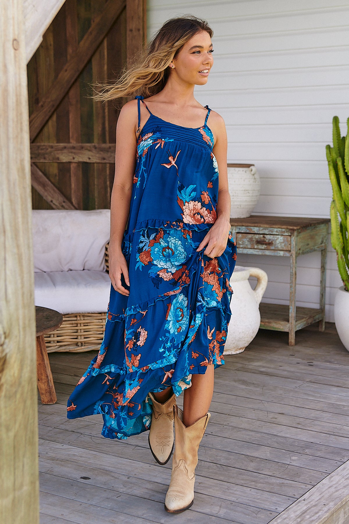The Abigail dress is the most stunning blue patterns that falls nicely, with its ruffles and relaxed fit. The back is slightly shirred and it has adjustable tie straps.