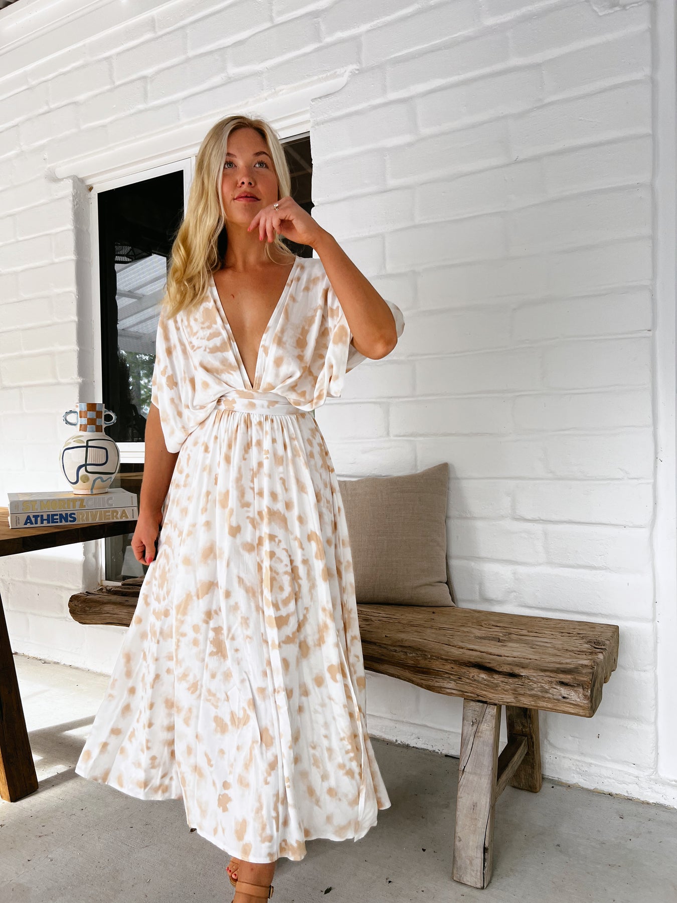 The Bailey maxi also features a leg split, deep v neckline, wide waistband feature.