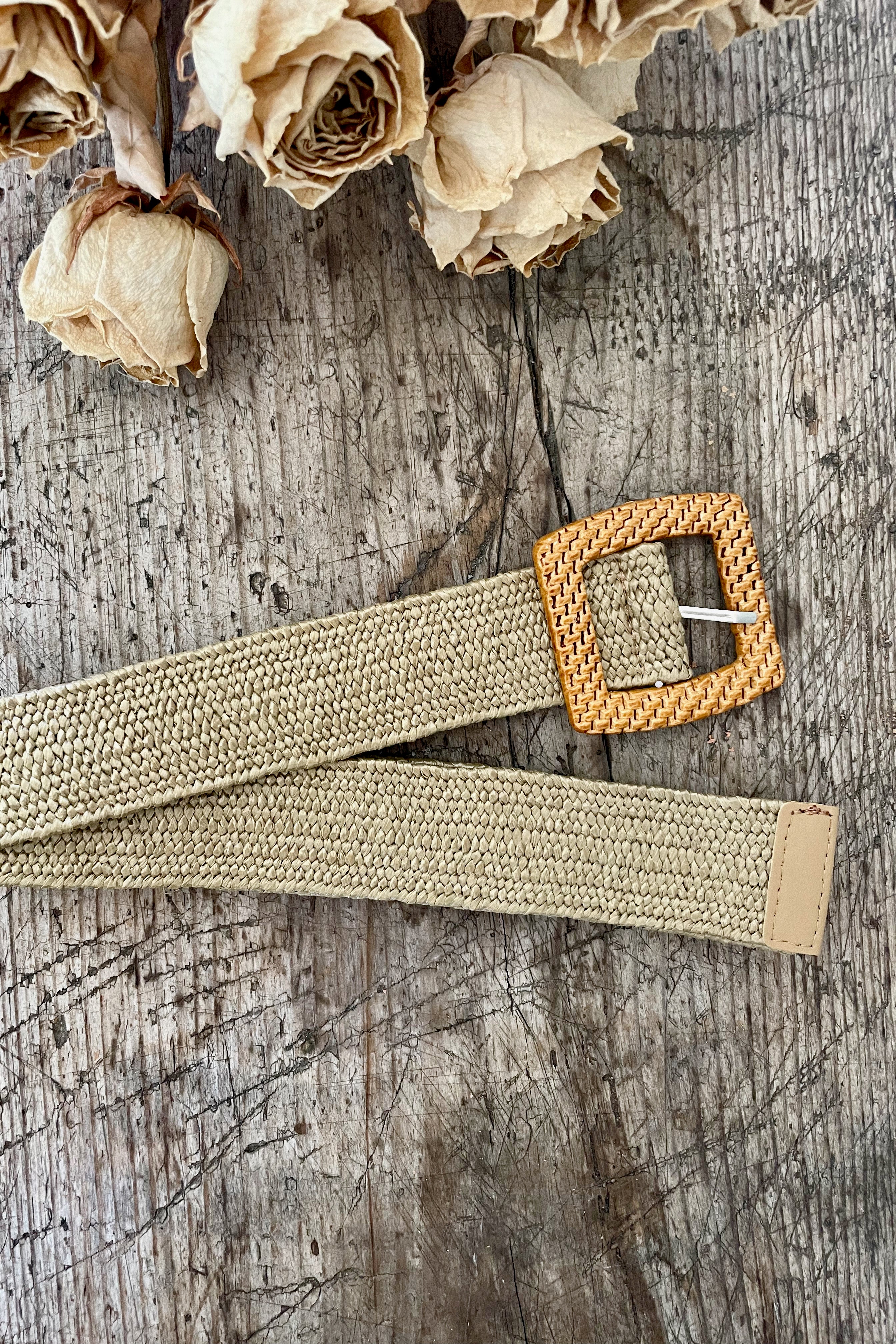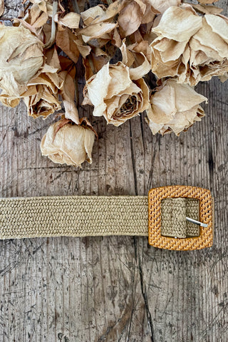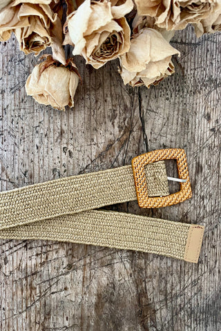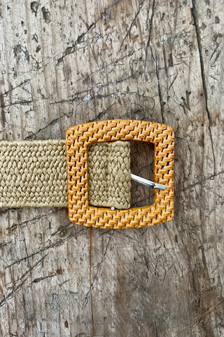 This belt is an elasticated weave material with a ratan inspired buckle. We love this belt as there are no holes and you just poke the prong through the elastic weave.