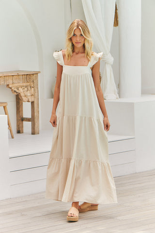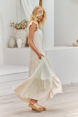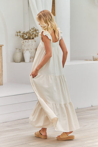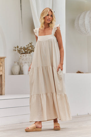 You will turn heads in the stunning maxi dress featuring a frill shoulder strap and a straight bustline with a floaty and relaxed skirt.
