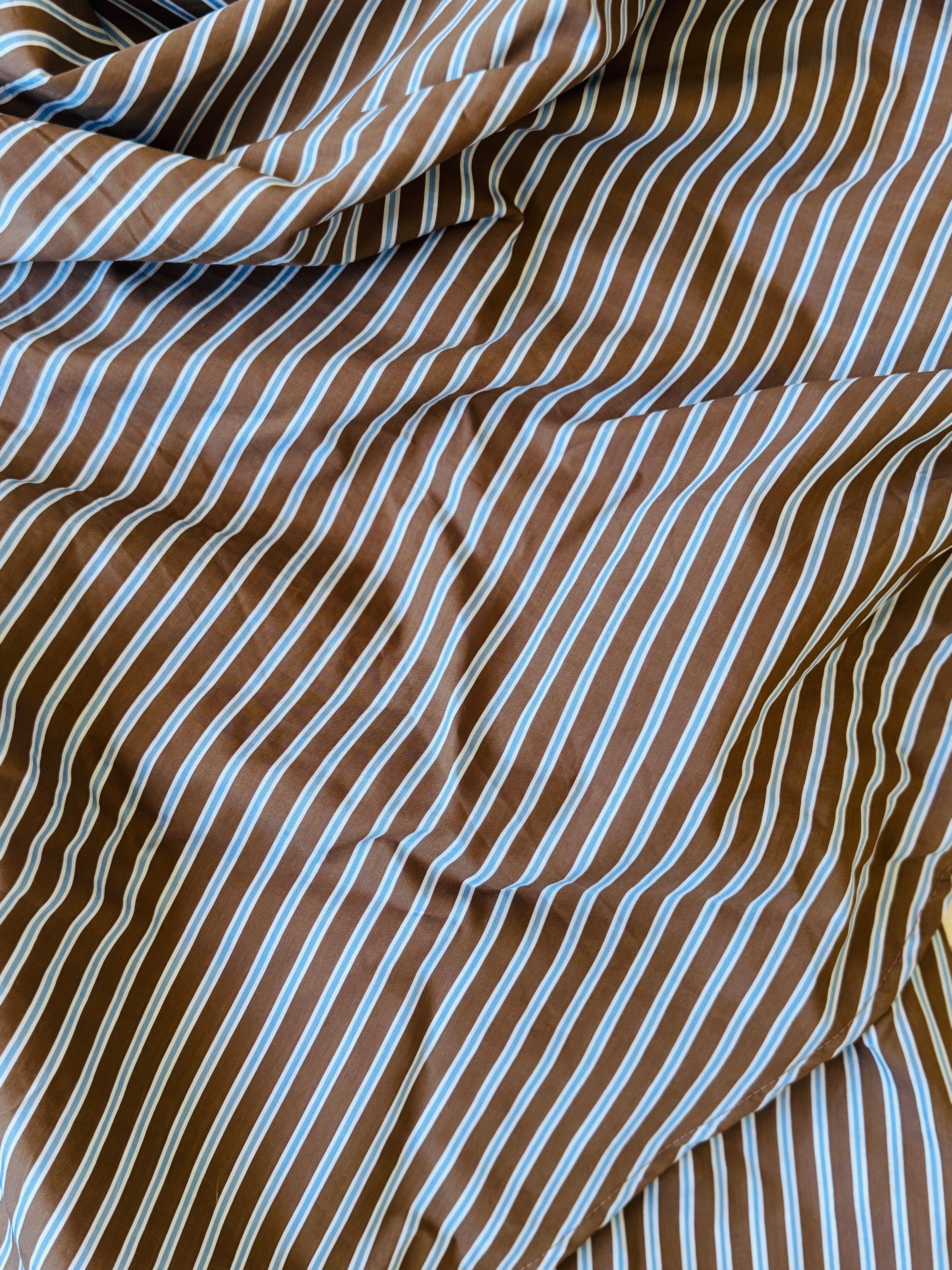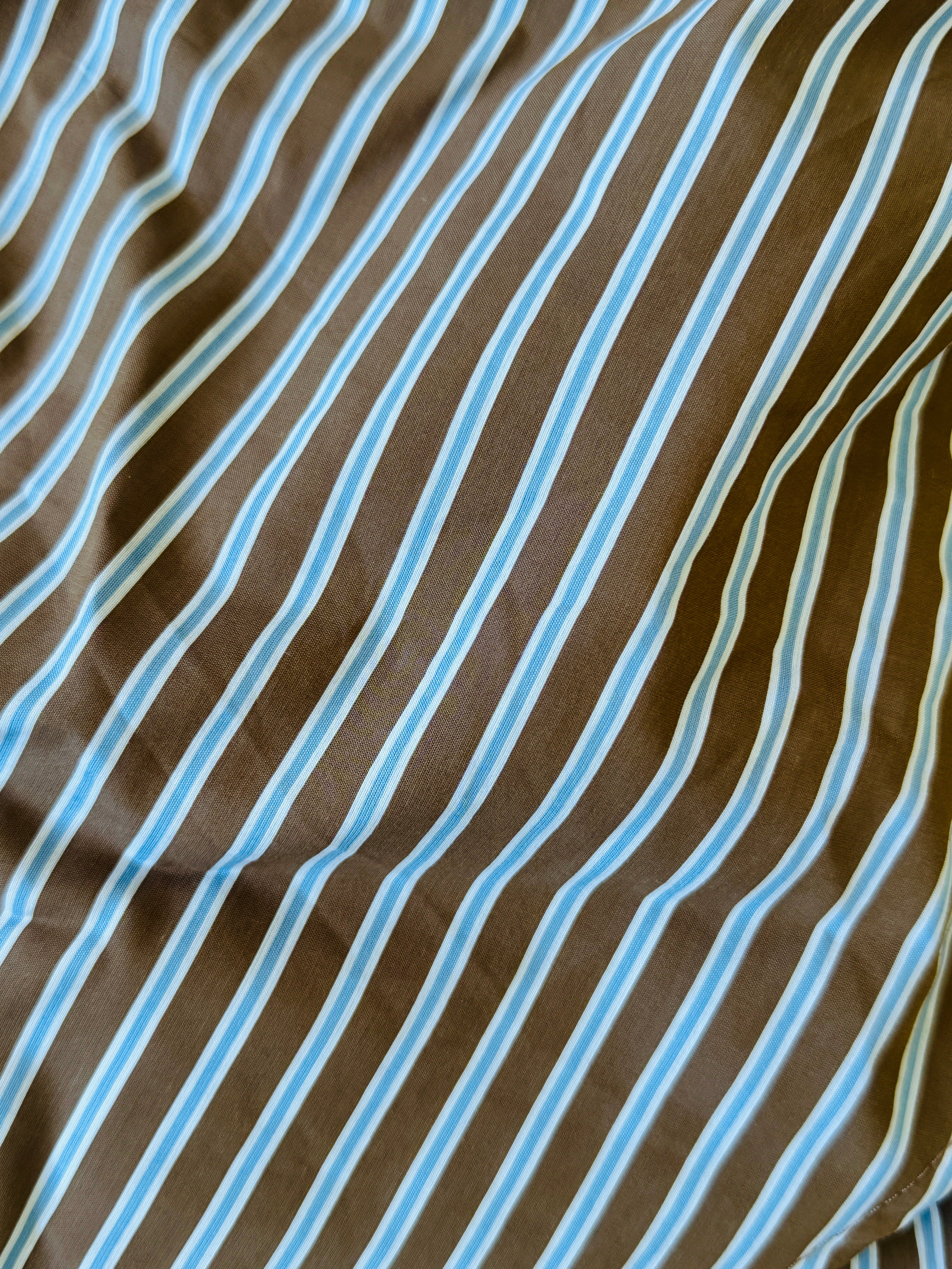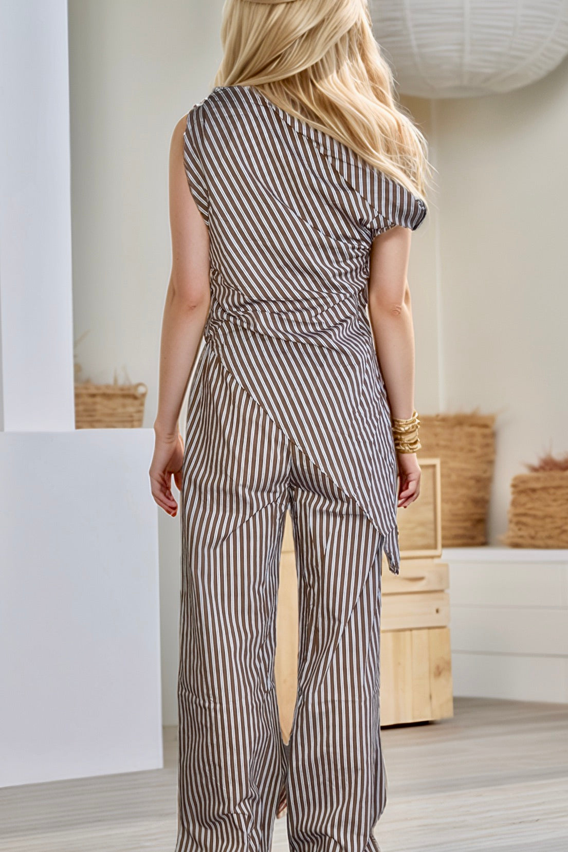 This stunning two-piece can be worn together or styled separately. It features a brown and blue stripe asymmetrical off-the-shoulder top with a unique angled cut and is paired with relaxed matching pants for the ultimate blend of comfort and style.