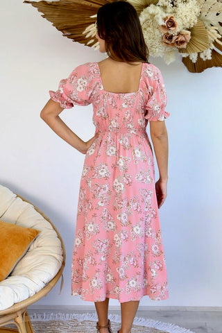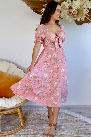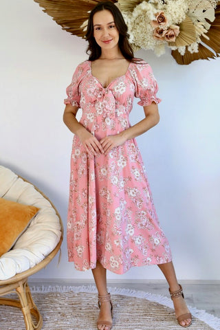 The midi of our dreams! We are loving the 'Charlotte Midi Dress'. This stunner features a pink toned floral print, sweet-heart tie neckline to complement the chest and a cute sleeve.