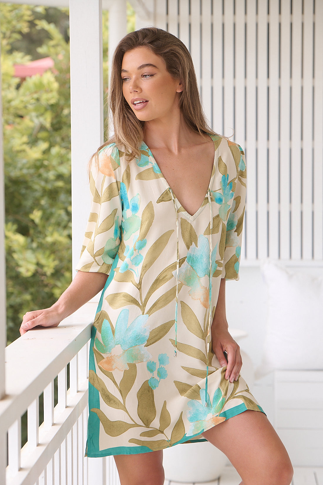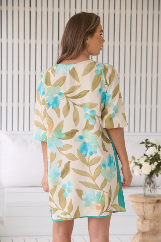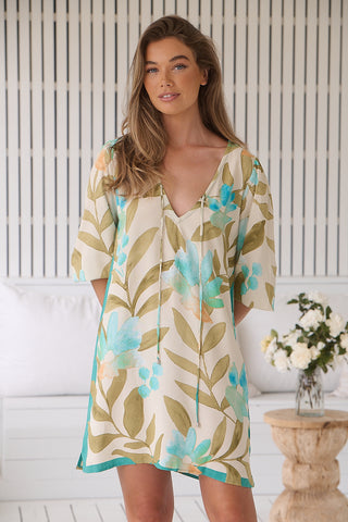 The Christie mini dress features a V-neckline, a relaxed cut and the colours are the perfect mix of aqua with an earthy undertone.