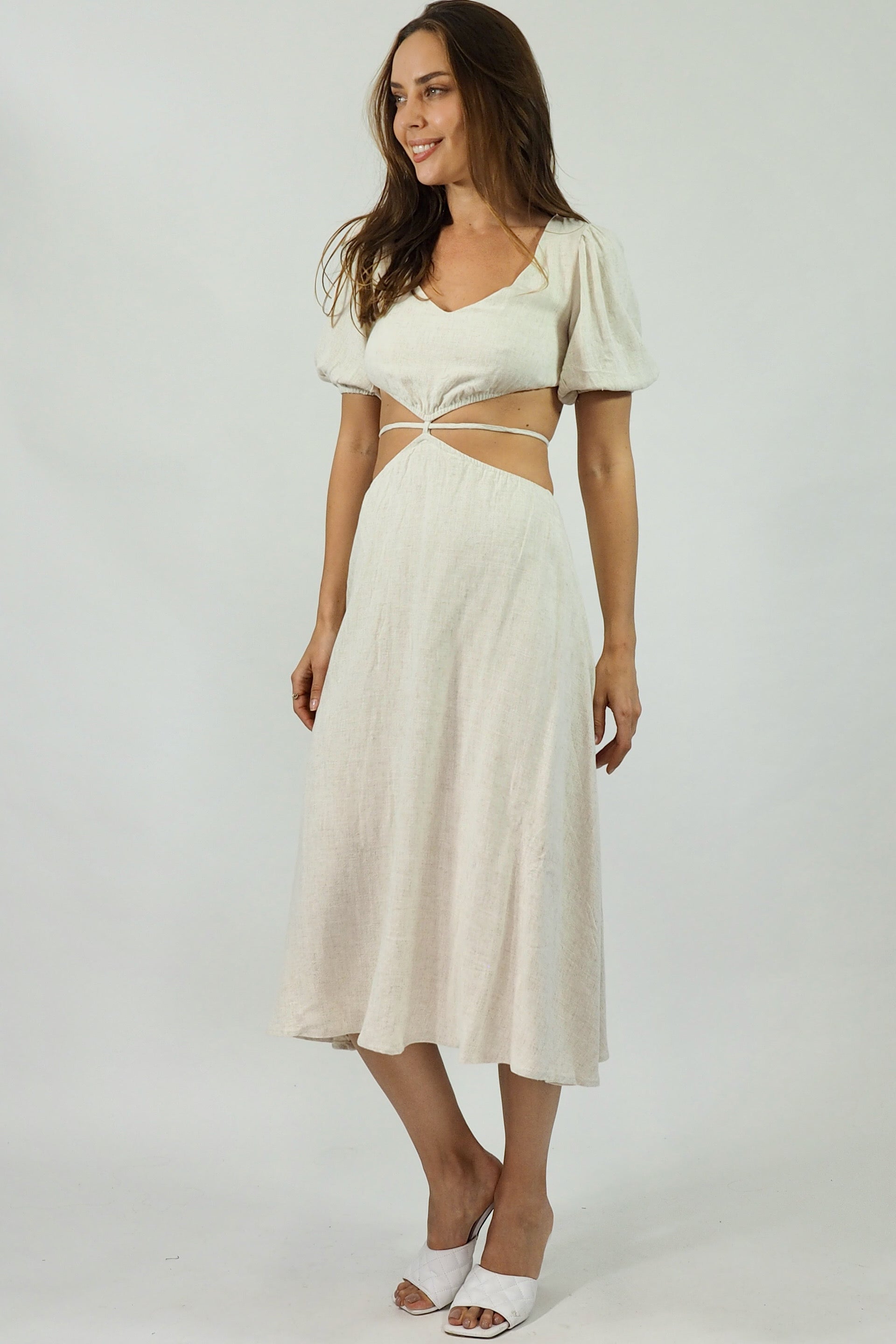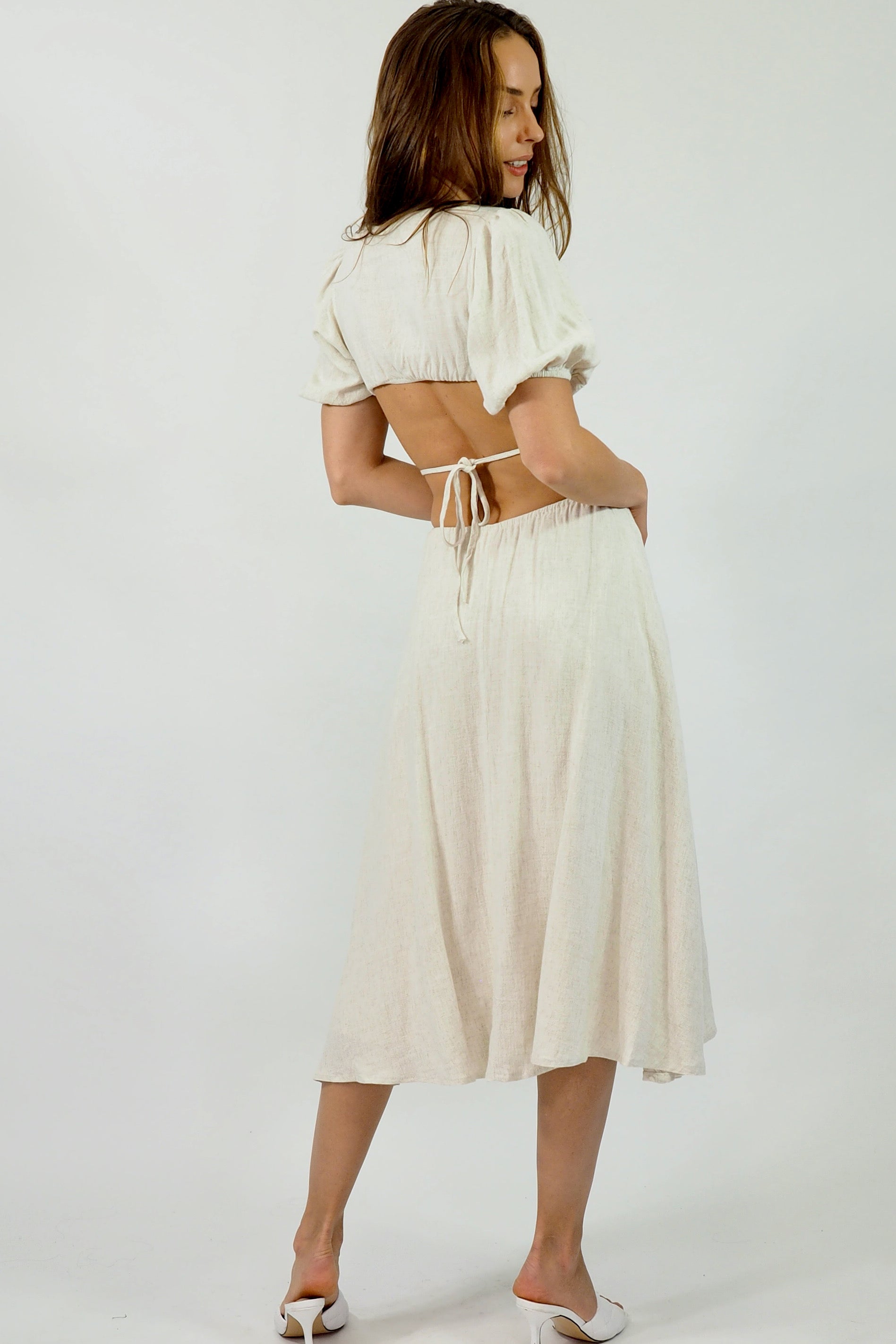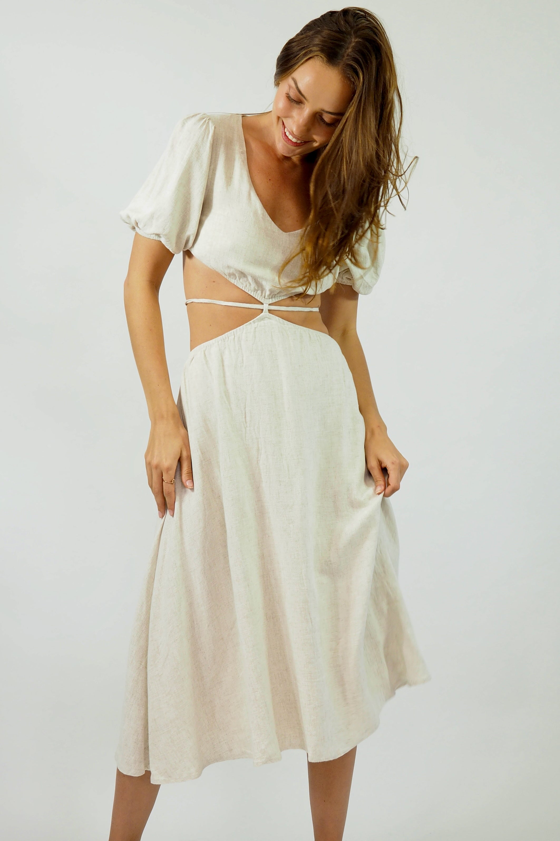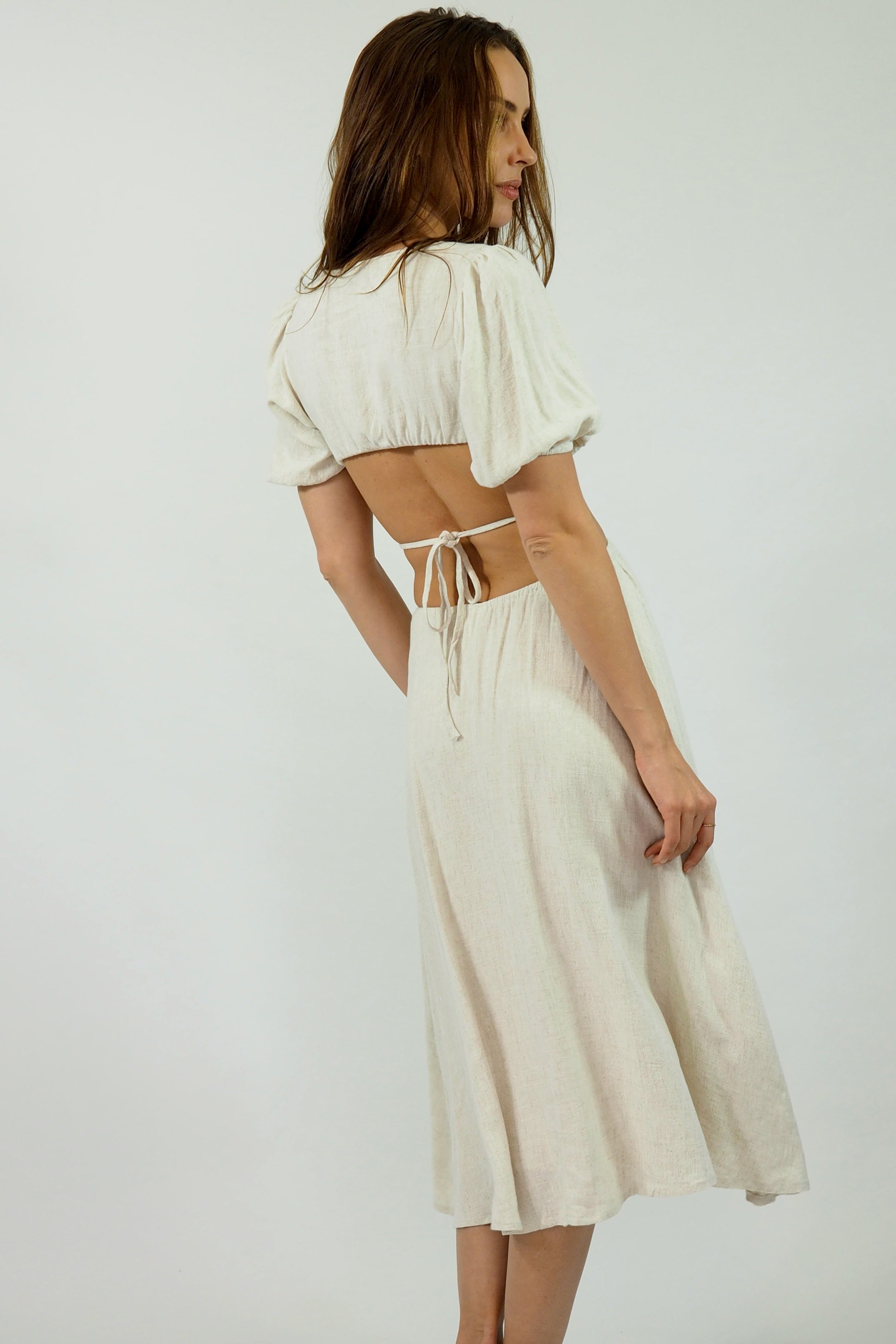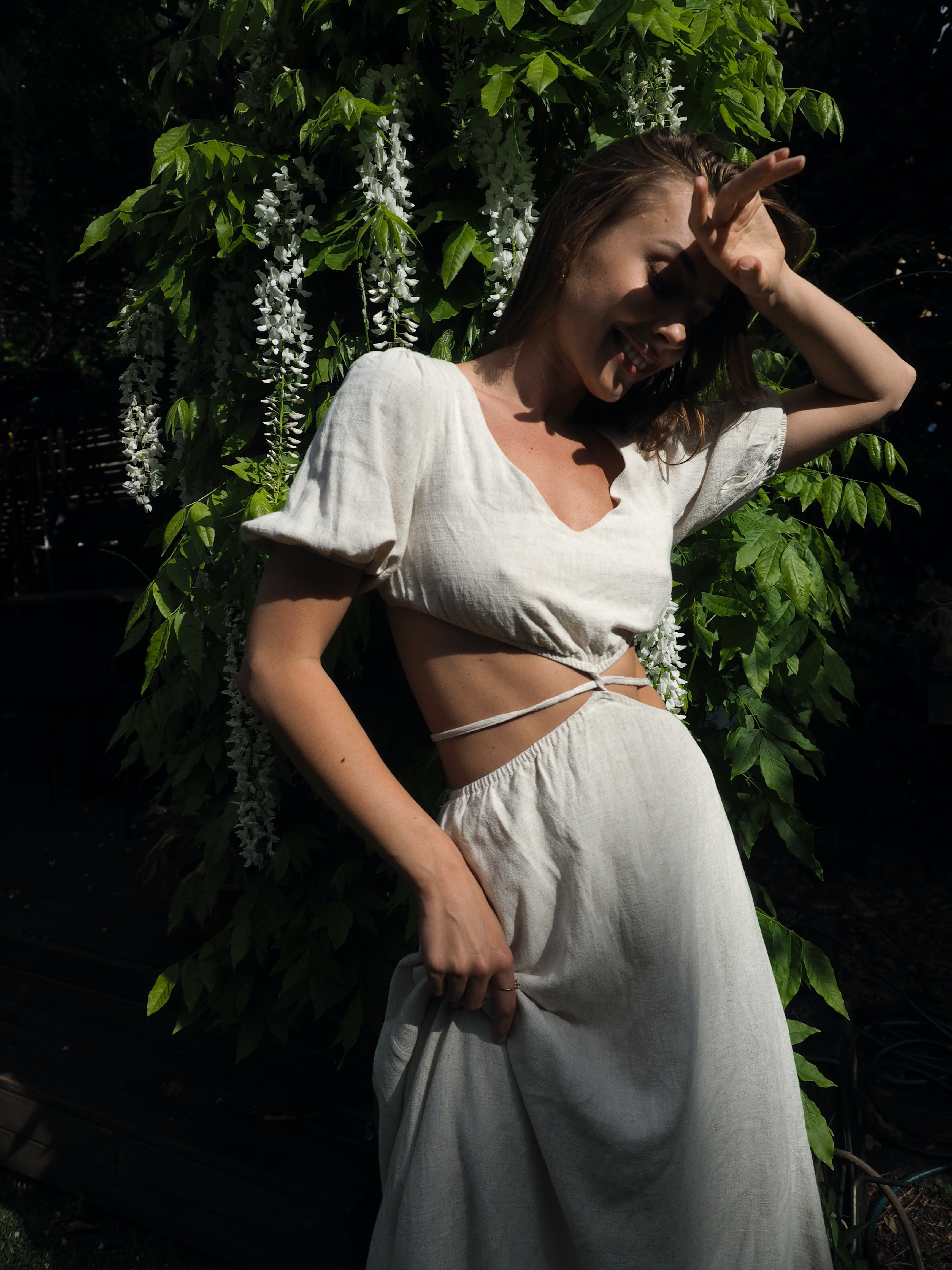 This beautiful linen dress is features a a slight puff sleeve, cut out on the side and a tie that you tie at the front or around the waist.