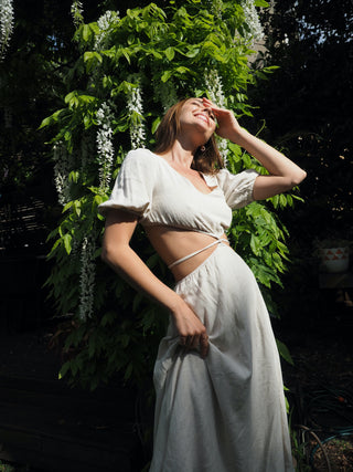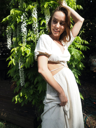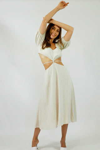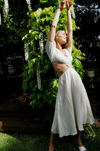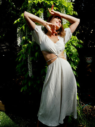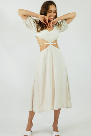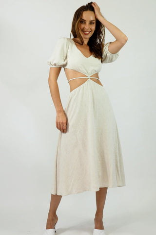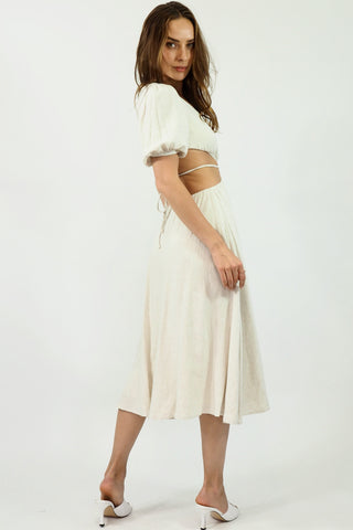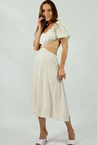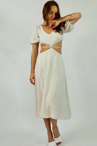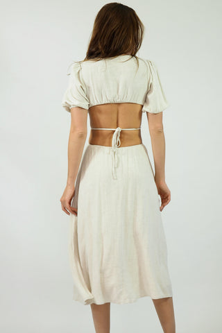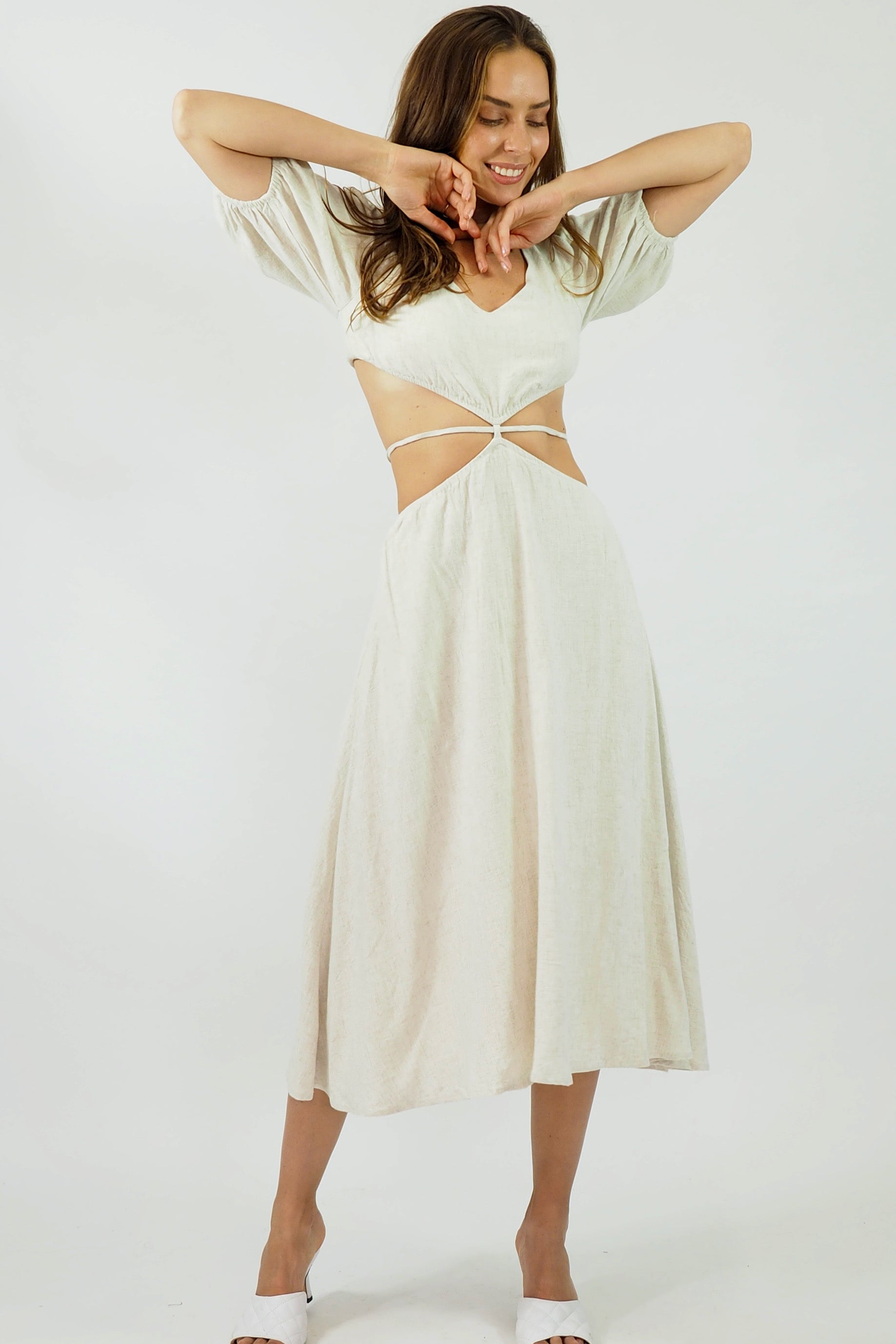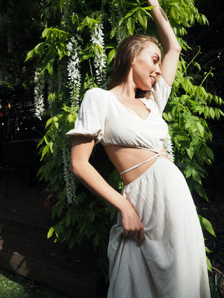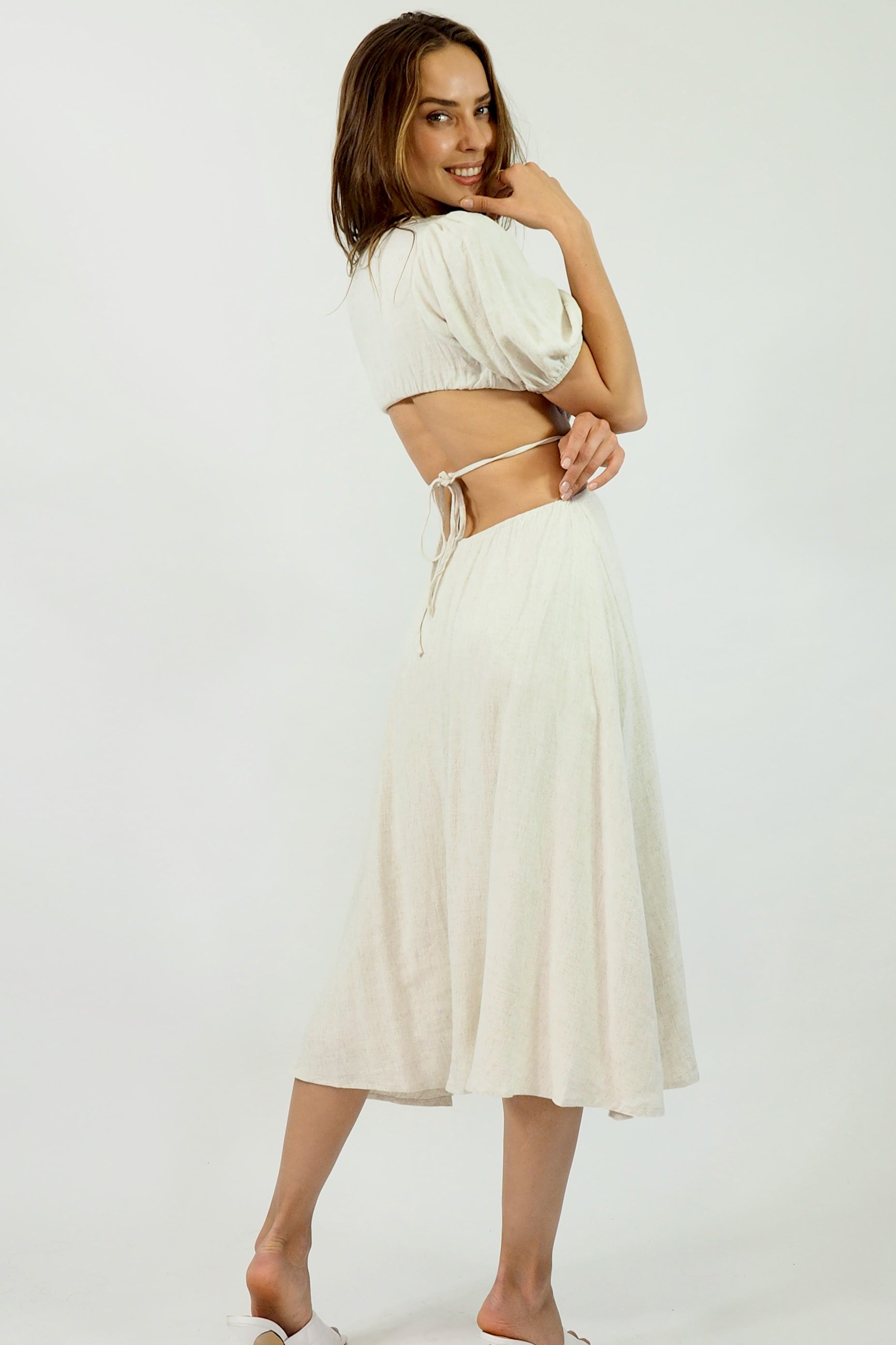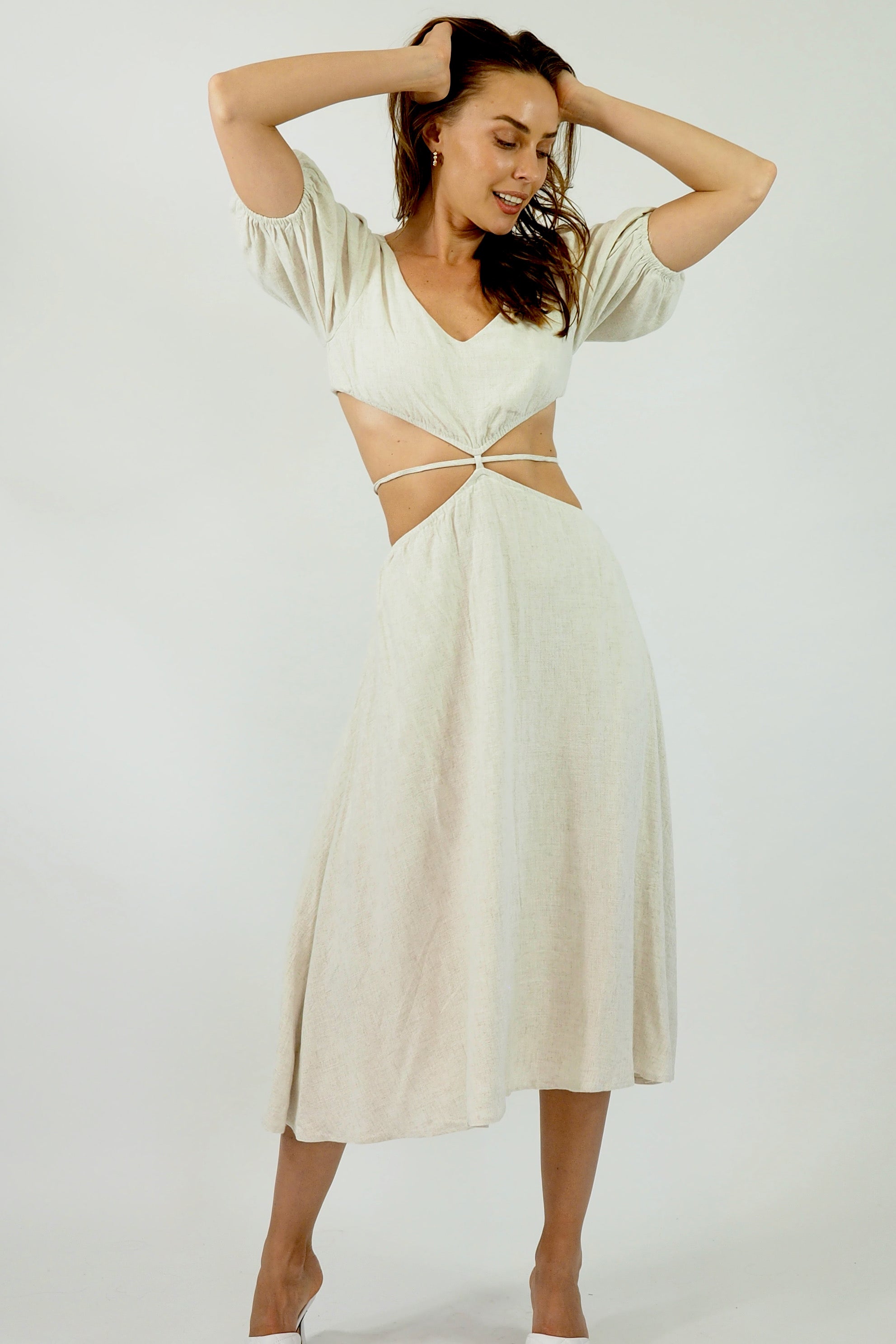 This beautiful linen dress is features a a slight puff sleeve, cut out on the side and a tie that you tie at the front or around the waist.