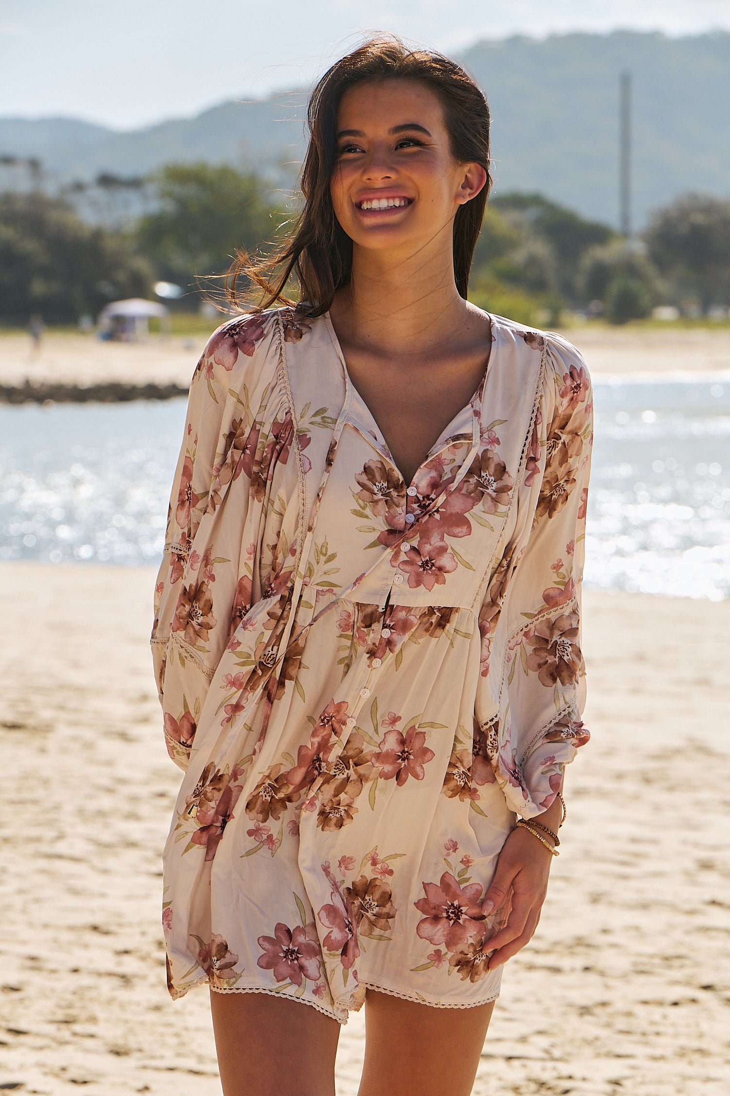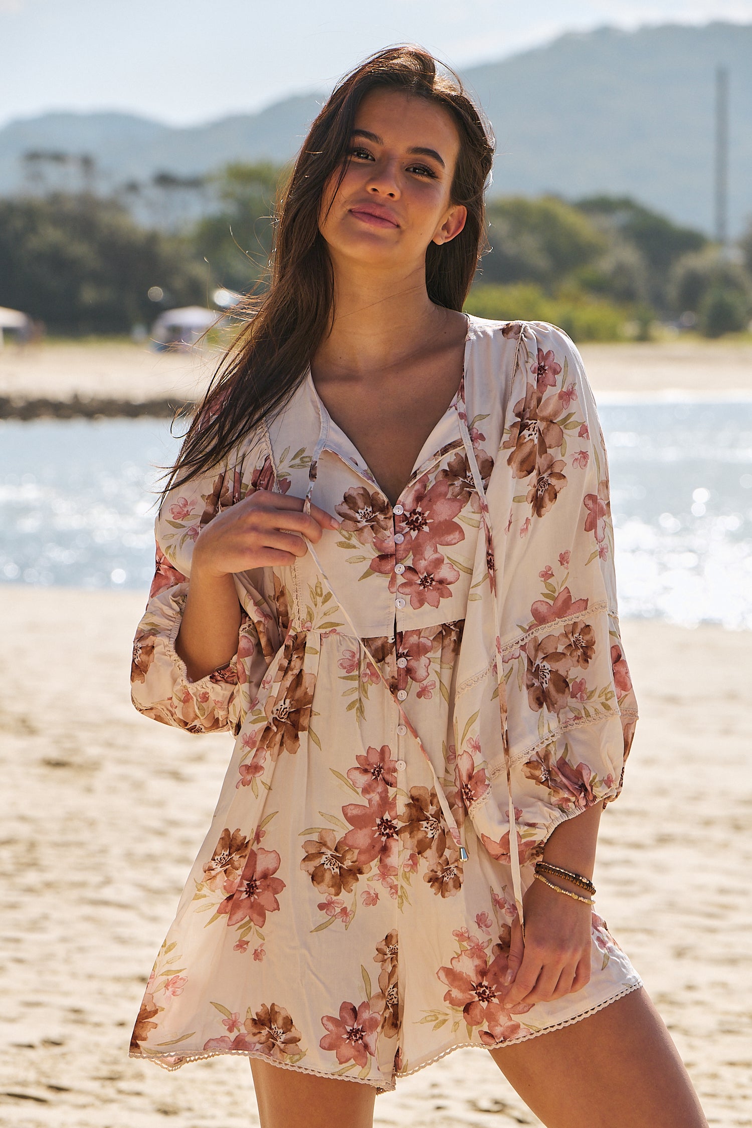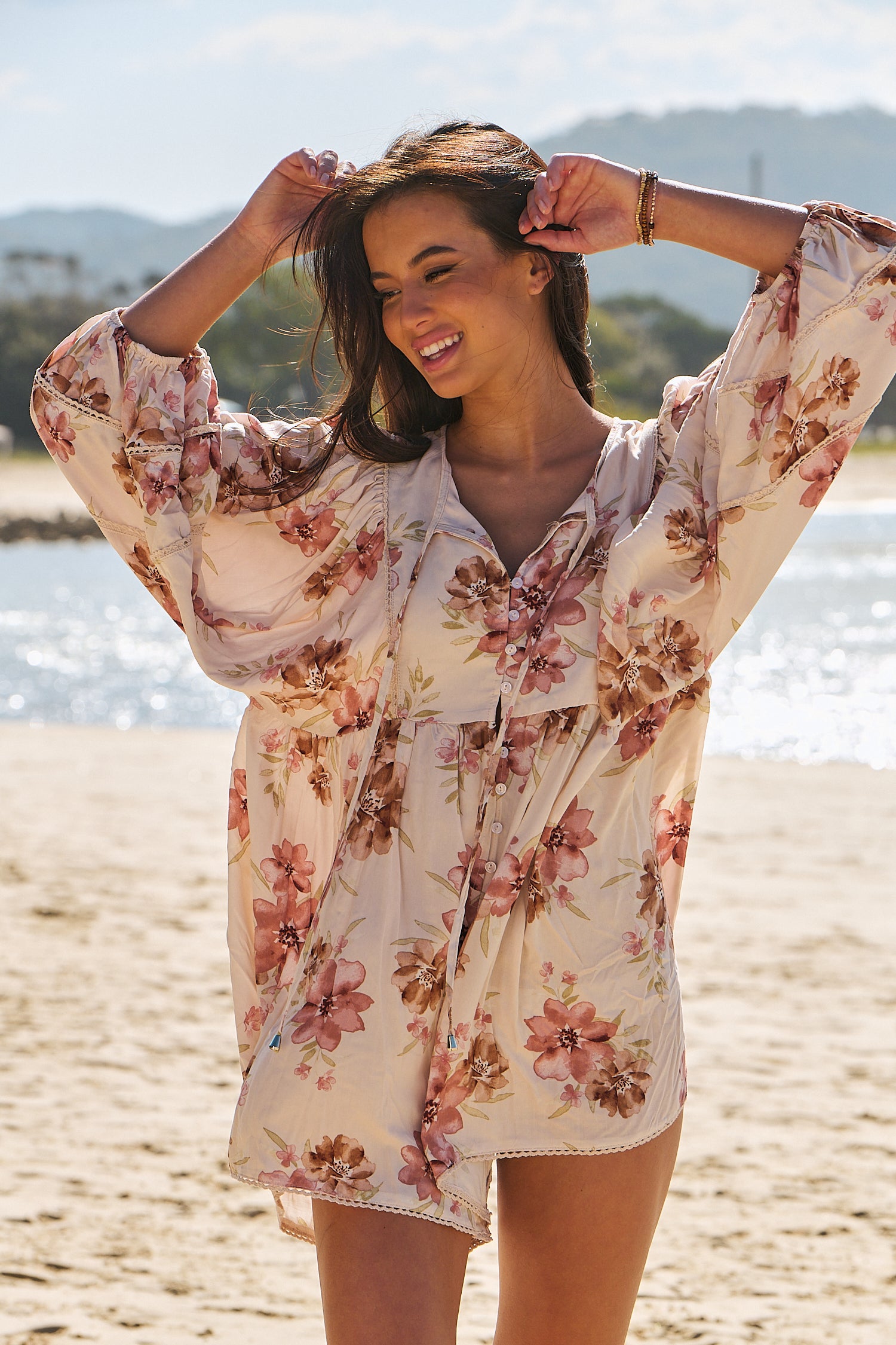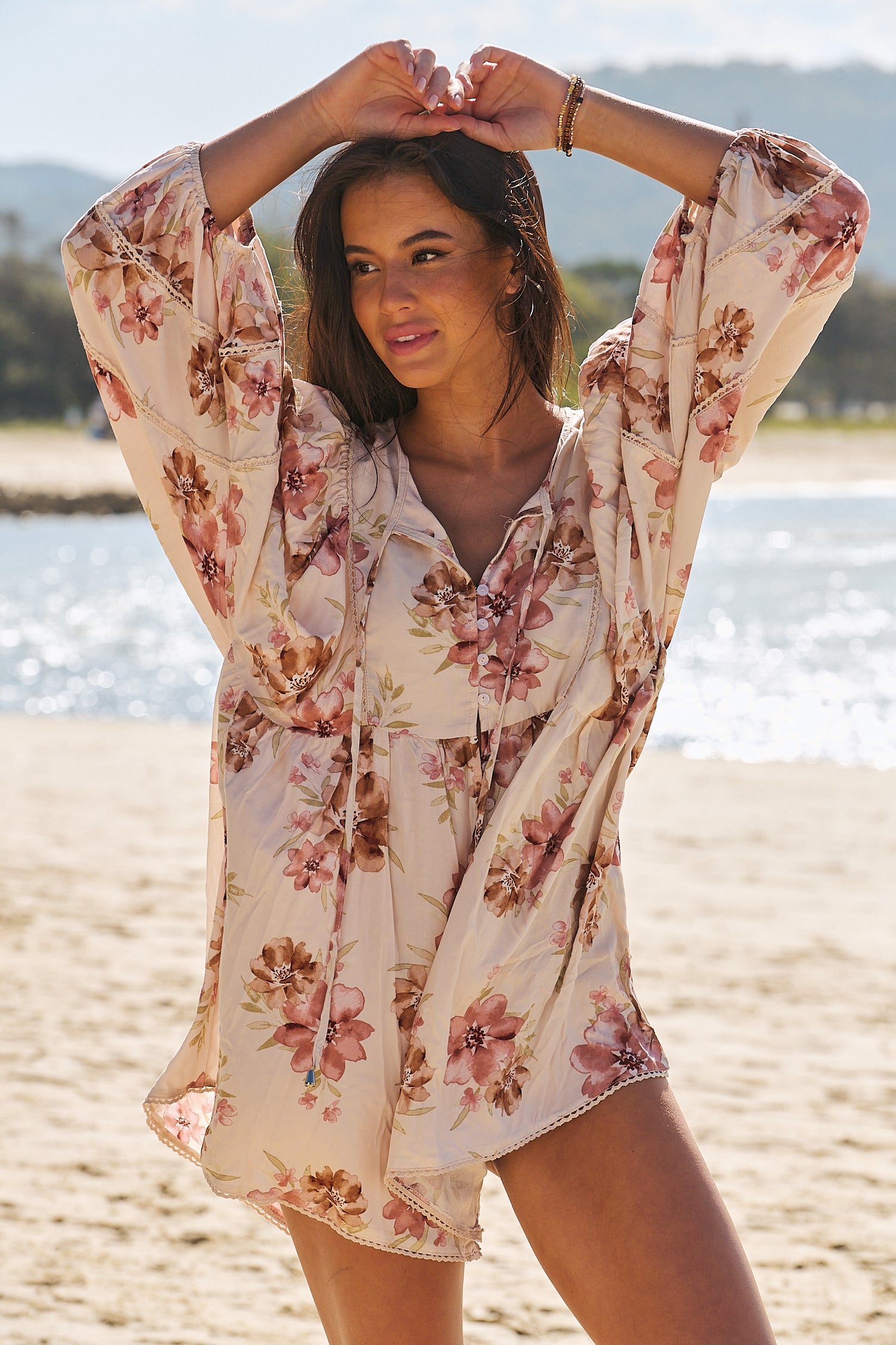 The sweet dusty pink base perfectly matches the dusty and dark pink floral pattern. This playsuit features a relaxed cut, oversized sleeve, and lace detailing throughout.