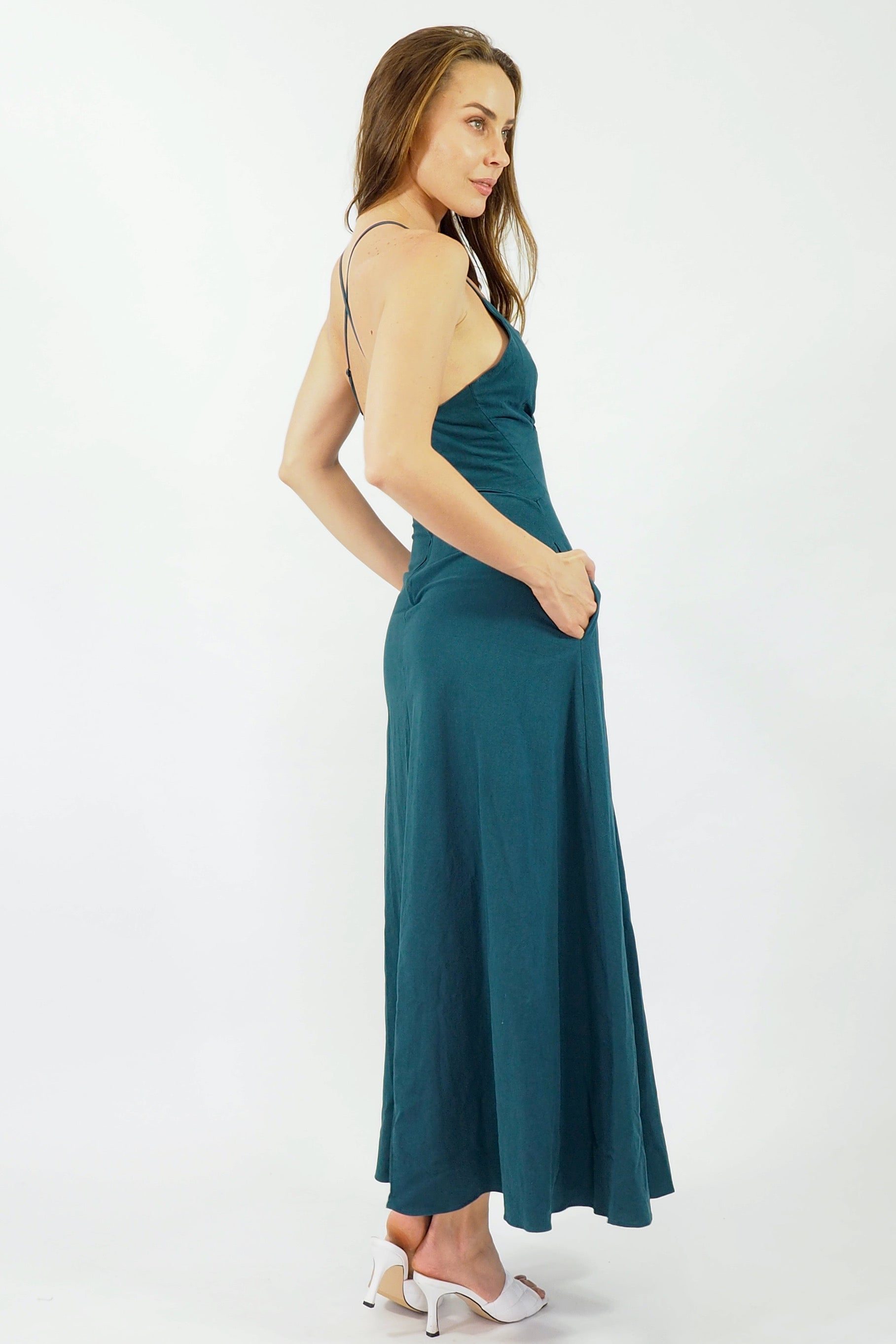 Look no further! The Emma dress is such a versatile dress! It features an adjustable spaghetti strap that crosses on the back, a small cut out under the bust, a full skirt with a split and a V detail on the lower back.