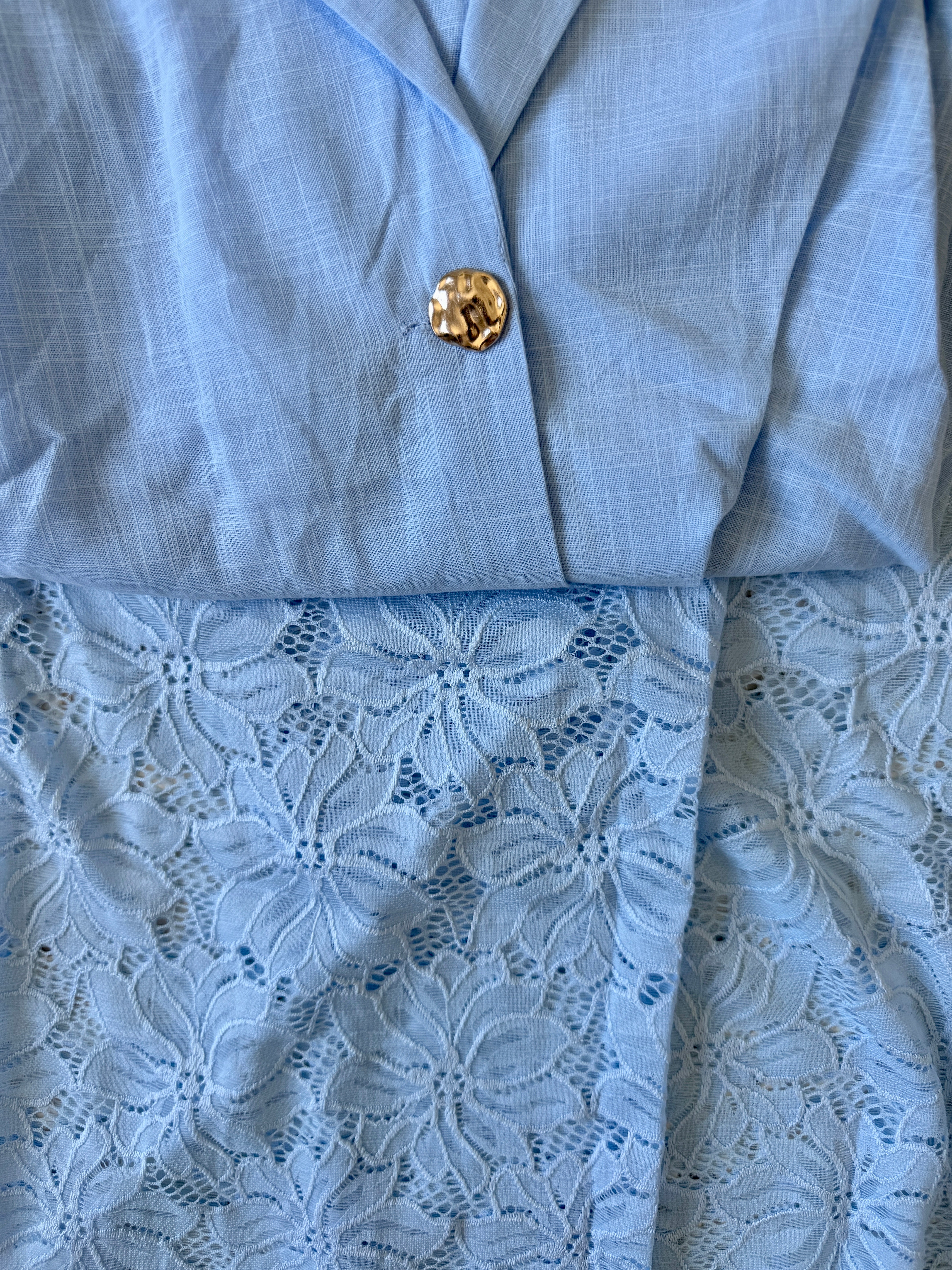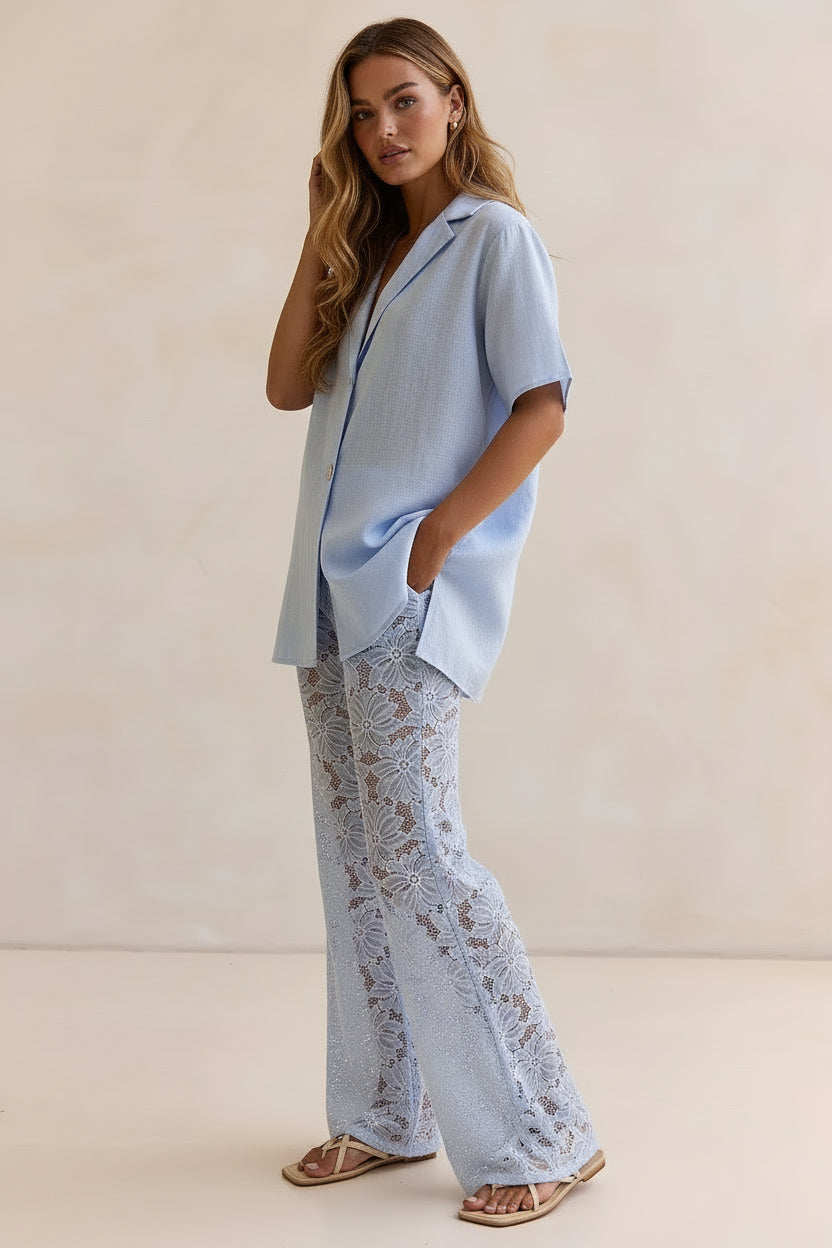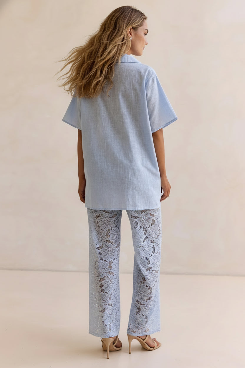 This two piece can be worn as a set or separate. This gorgeous set includes a flattering relaxed cotton linen look shirt with a collar and gold buttons, and a pair of sheer lace pants.