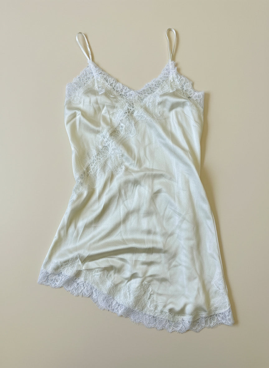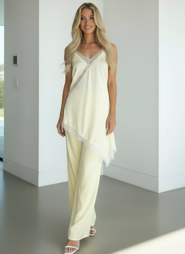 Style it over pants, jeans, or layer it with a cute mini skirt underneath. Crafted from a light, silky-feel ivory fabric with delicate white lace trim, it brings an effortlessly feminine touch to any outfit.