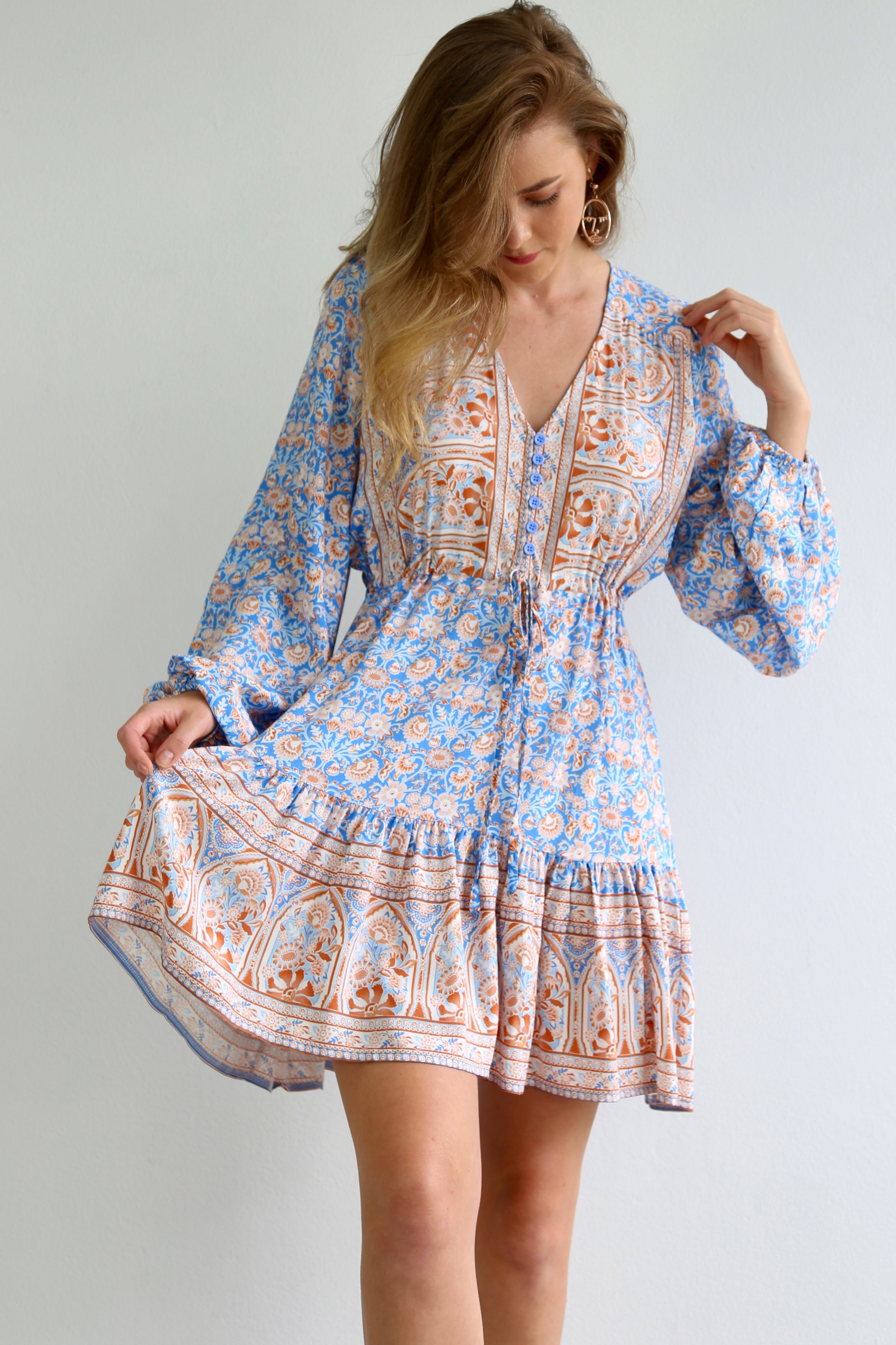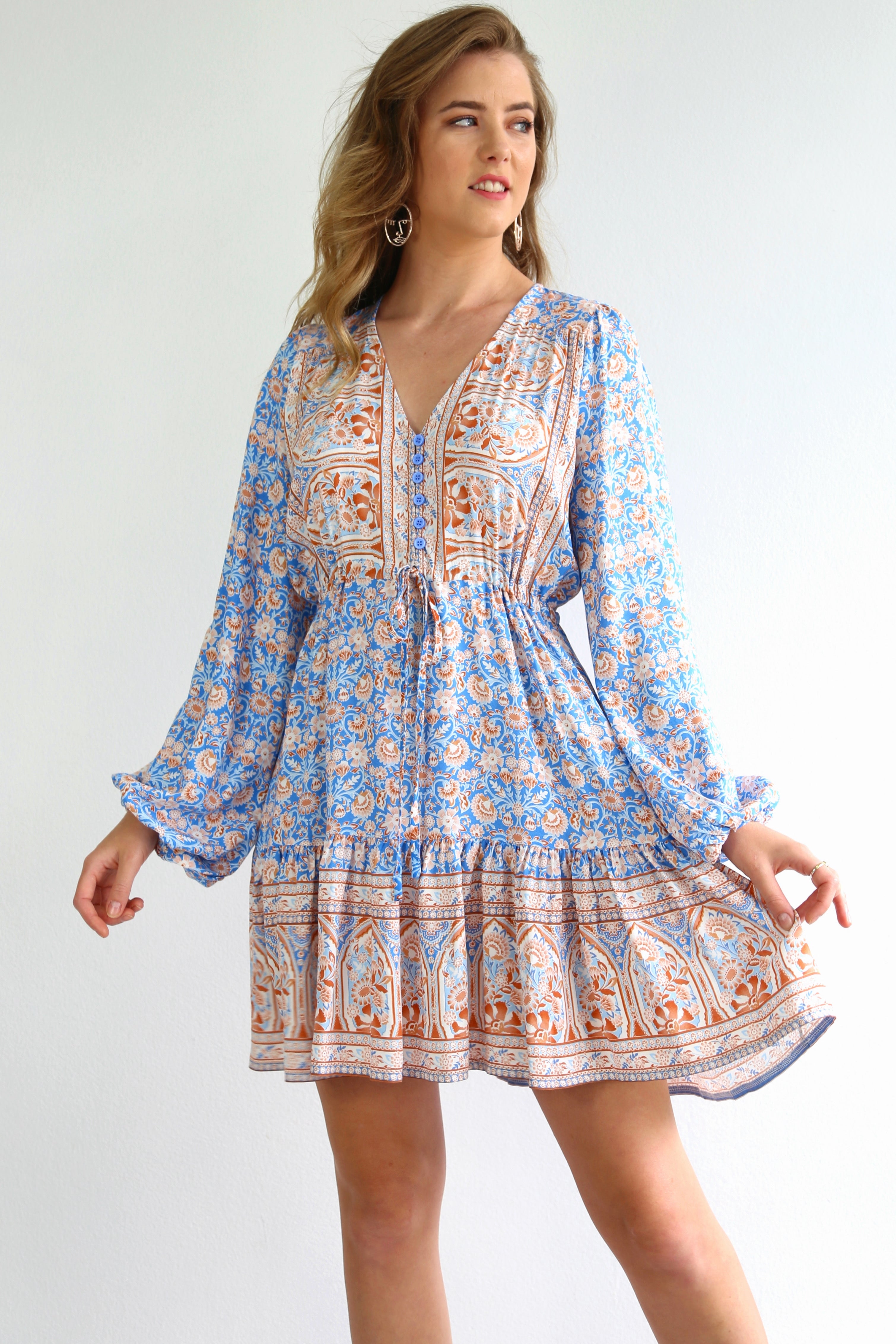 If you LOVE blues, with browns you cannot go past this dress!