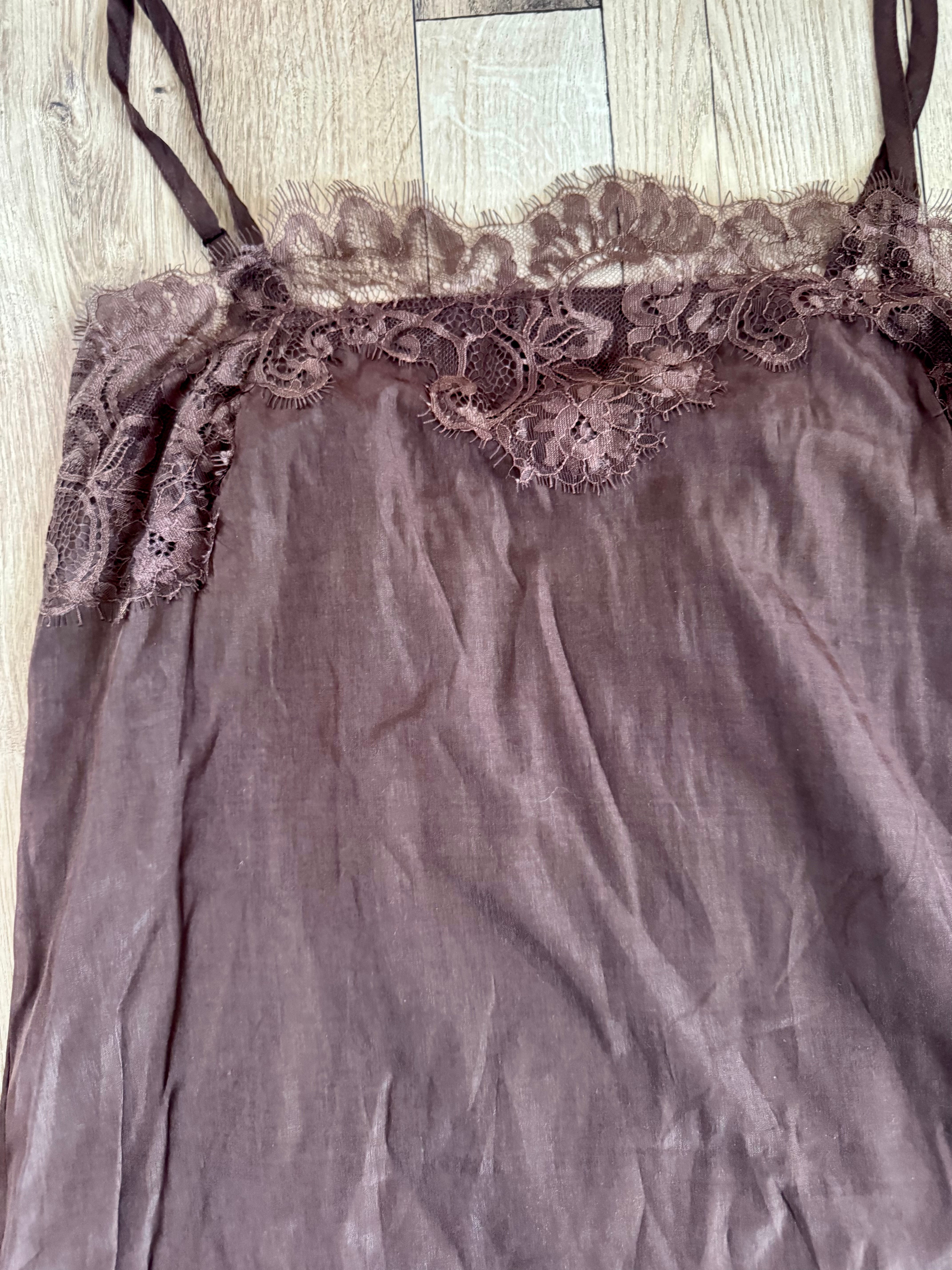 Crafted from a light, silky-feel cupro fabric, it features delicate lace trim along the bust and hem, adding a soft romantic touch. With two subtle side splits for added movement and allure, this dress is the perfect blend of comfort and style.
