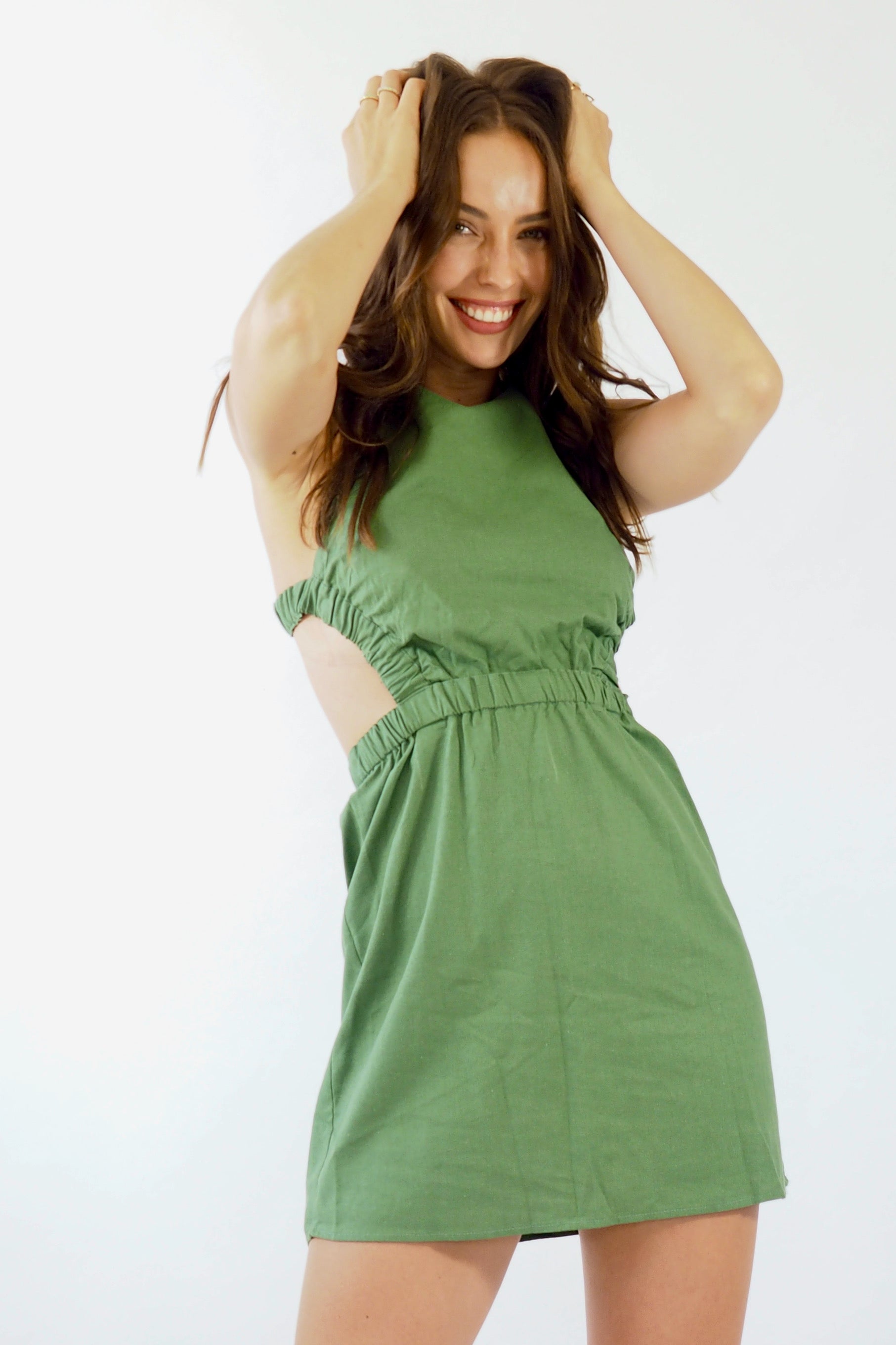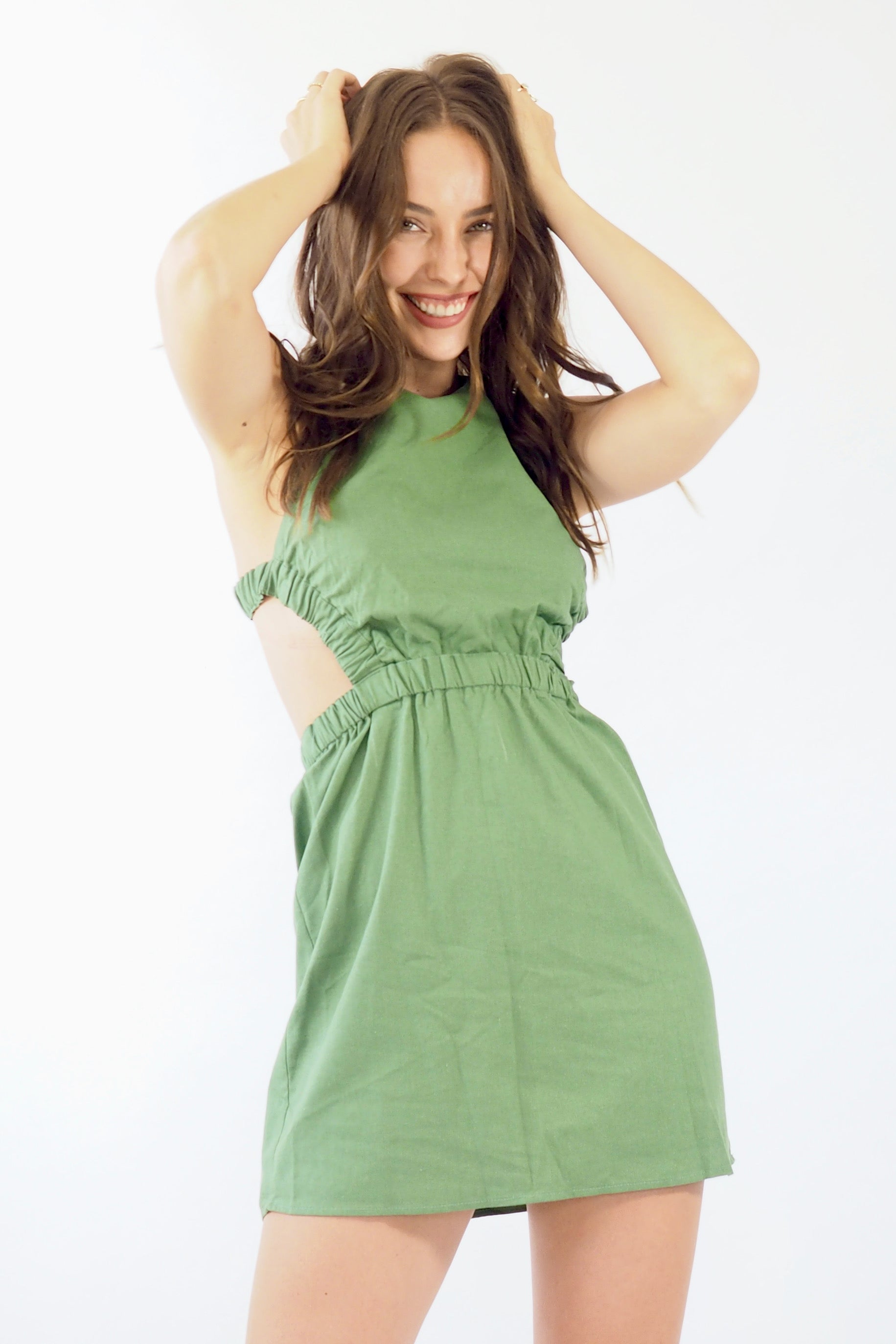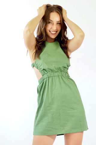 The Milla Backless Mini Dress features a cut out at the side and an elastic criss cross across the back.