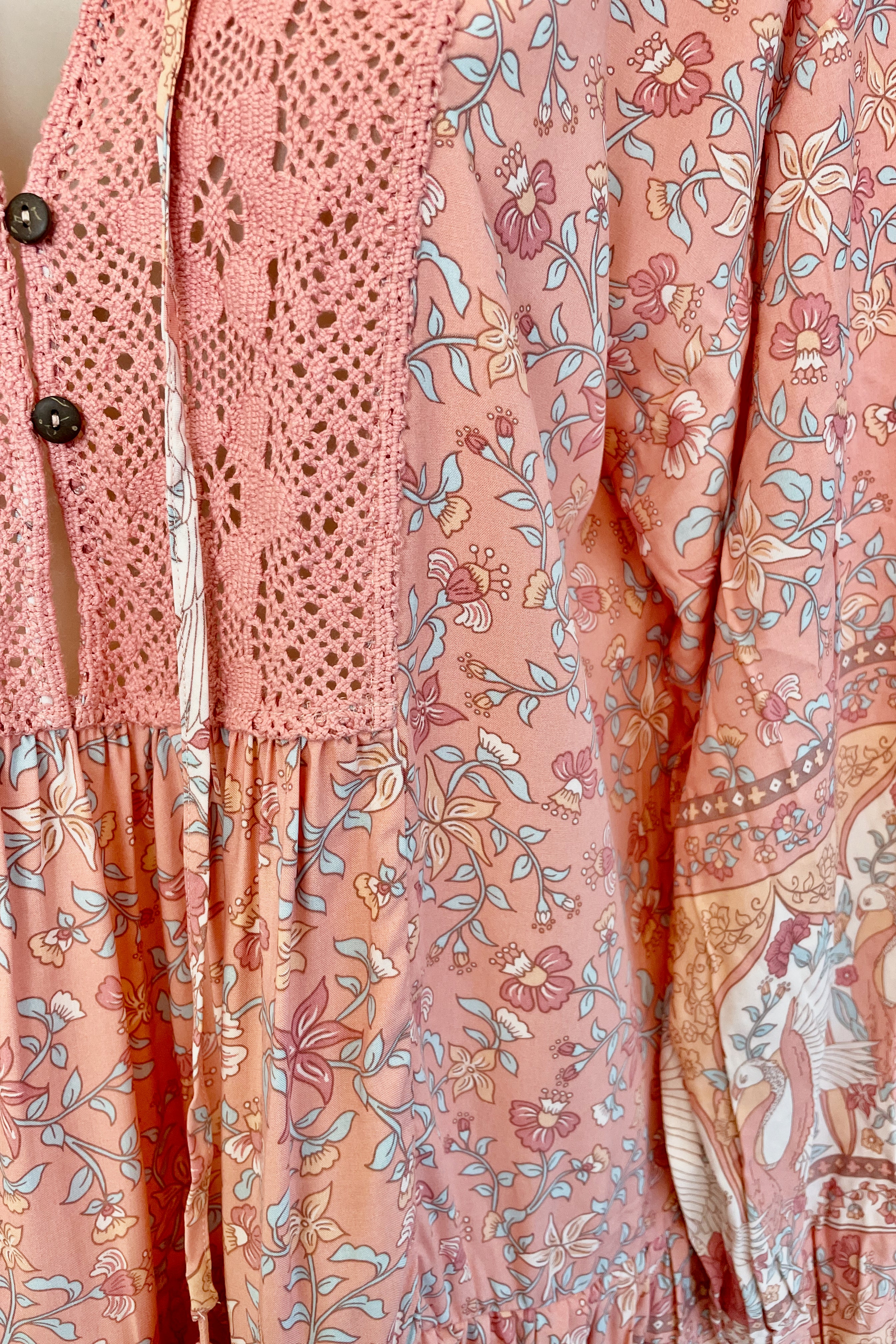 The Mini dress features a stunning pink crochet detail around the neck line, two coconut buttons, and who doesn't love Pockets!