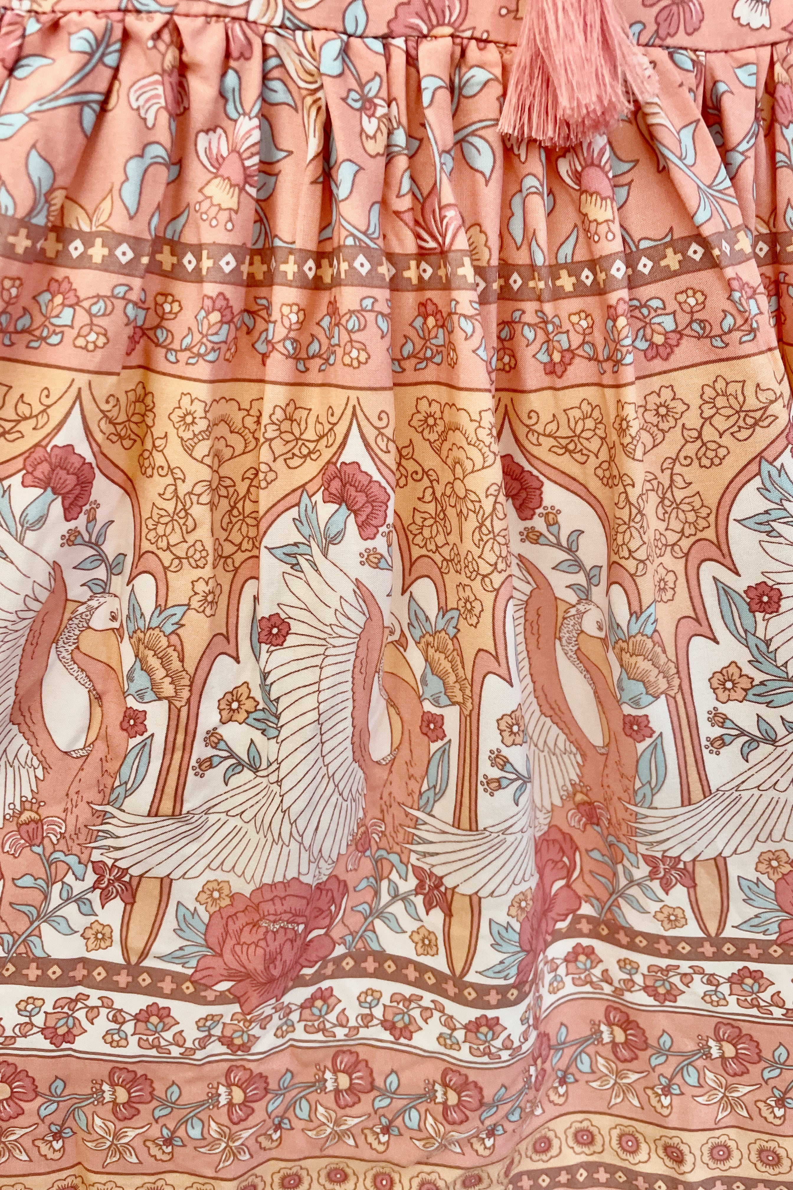 The fabric is a stunning Dusty Pink/Peach with flowers and peacocks on the bottom trim.