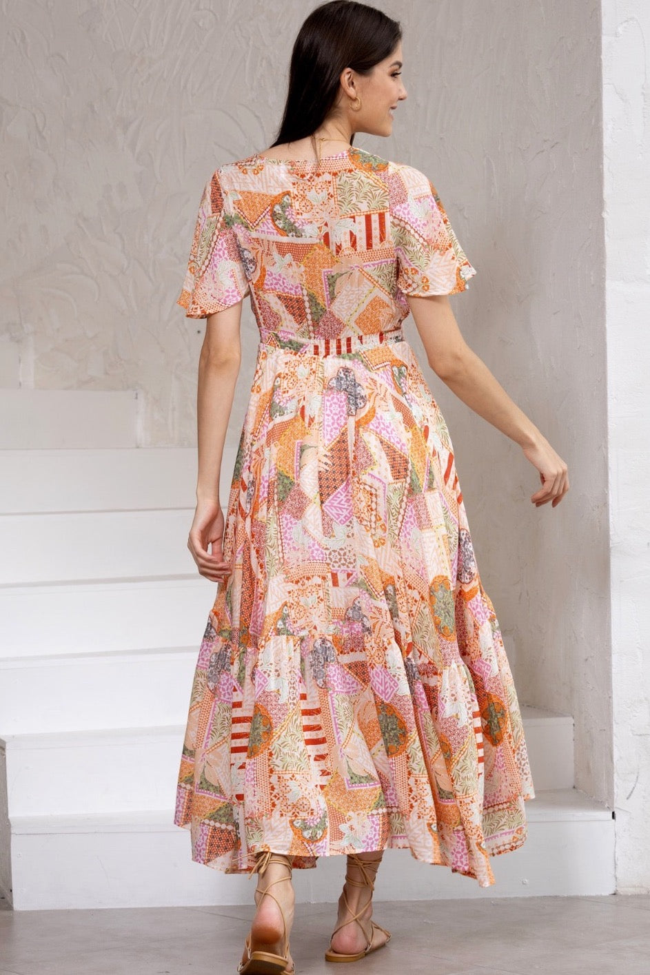 Everything about this Maxi scream perfection. The 'Pari Maxi Dress' is an orange base with pops of pink, brown, greens and red. The maxi features a mid butterfly sleeve a button down bust and is a flattering shape.