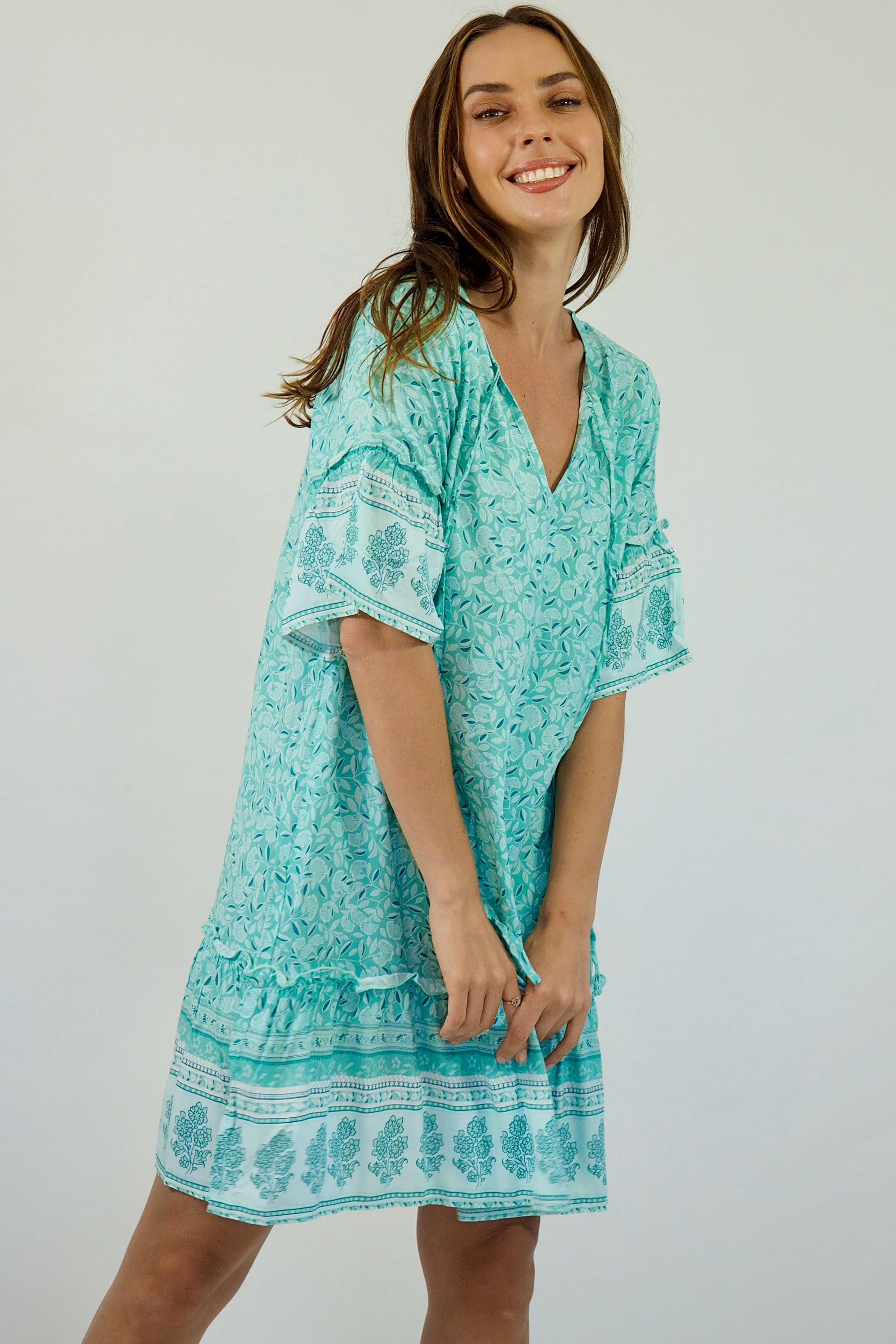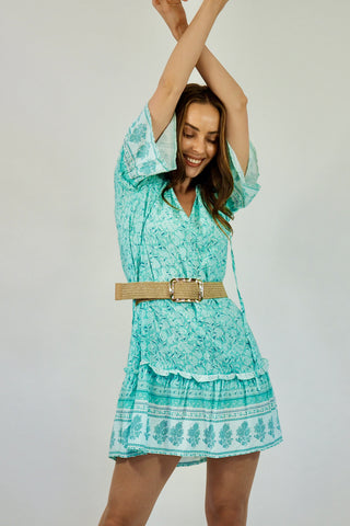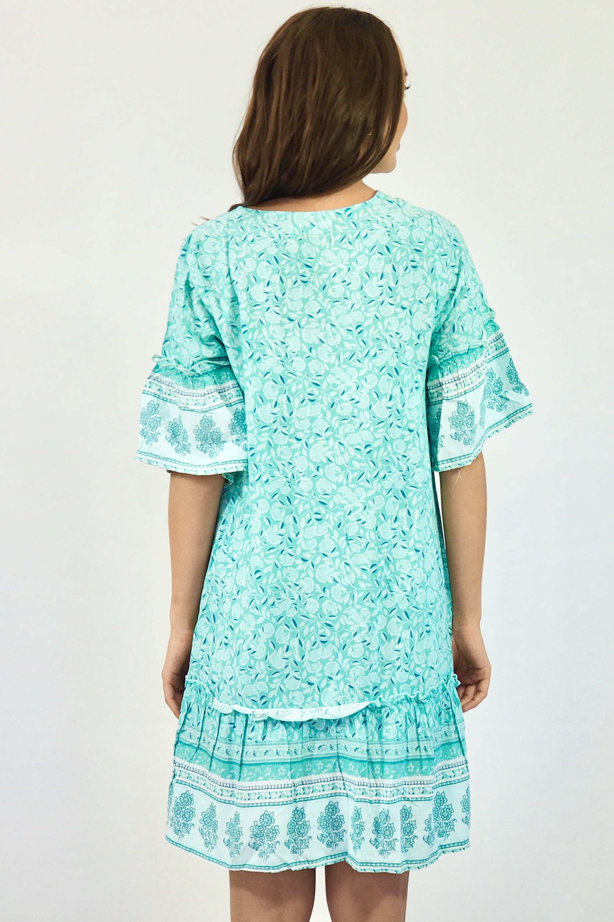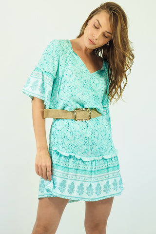 The Remi Dress/Top features a ruffle sleeve, a ruffle on the bottom hem, and is the perfect Mint.