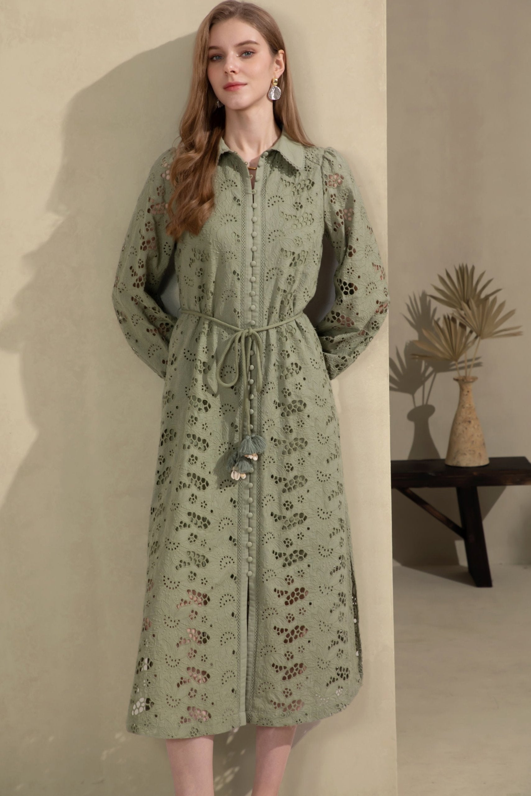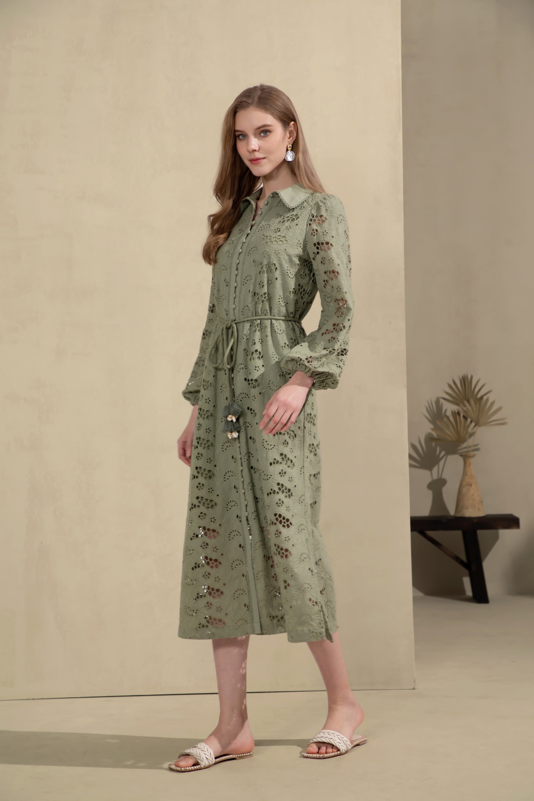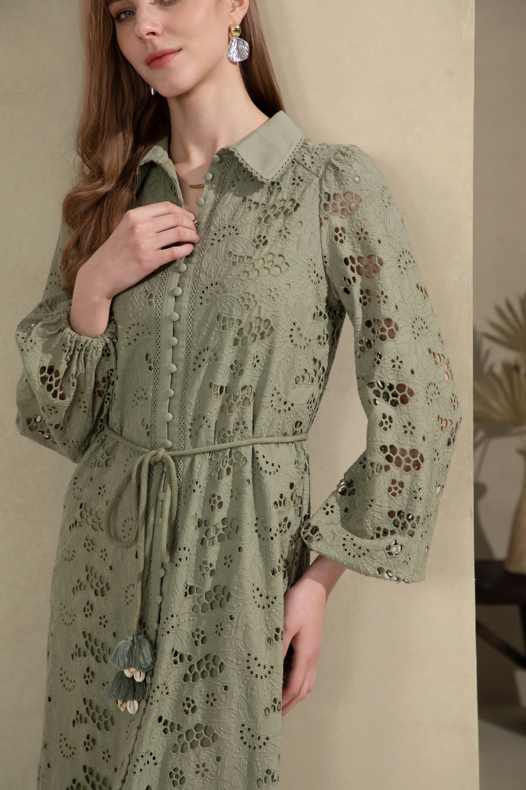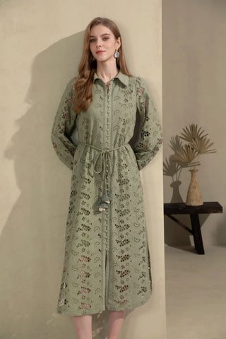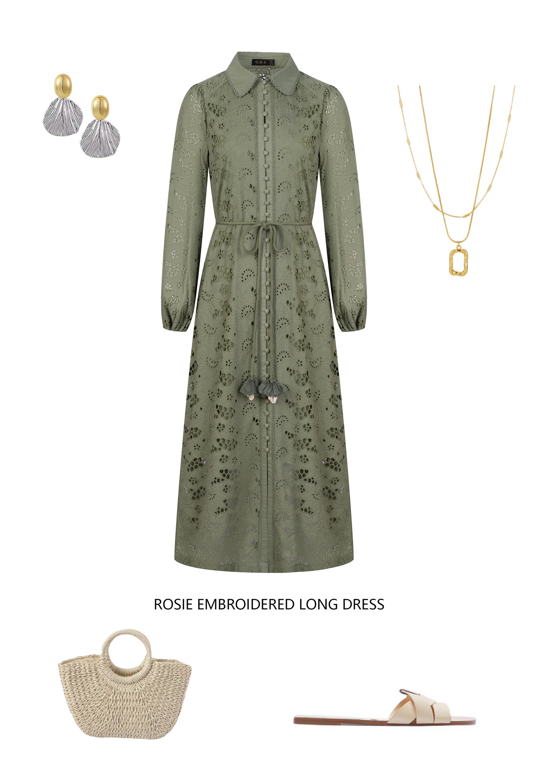 Imagine wearing this elegant dress to a charming outdoor garden party. The long, flowing silhouette and intricate embroidery perfectly complement the natural beauty of a garden setting. Surrounded by blooming flowers and lush greenery, you'll feel effortlessly chic and comfortable. The breathable cotton fabric keeps you cool, while the elegant design ensures you stand out in style.