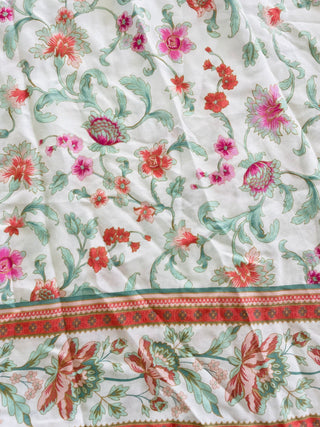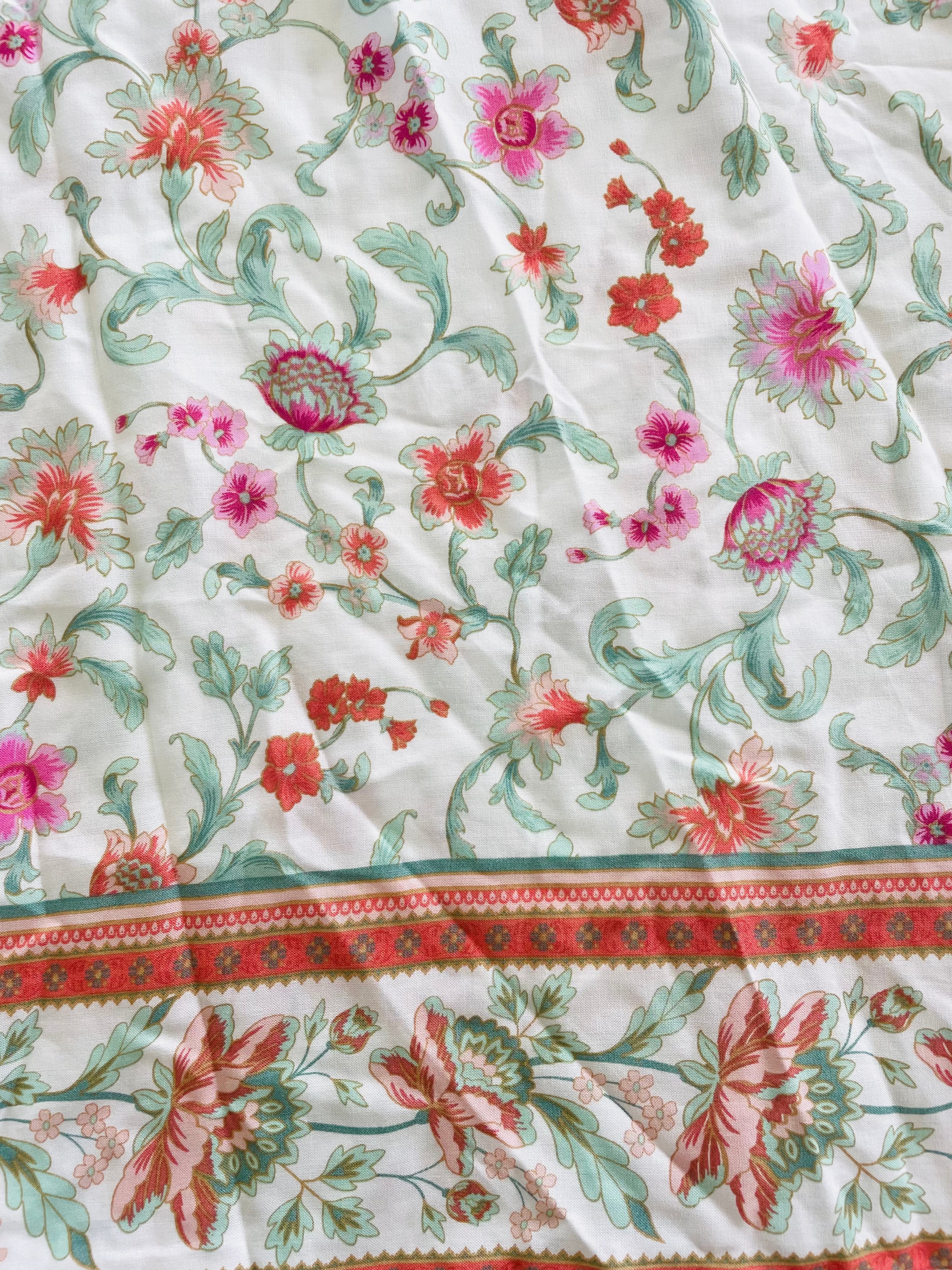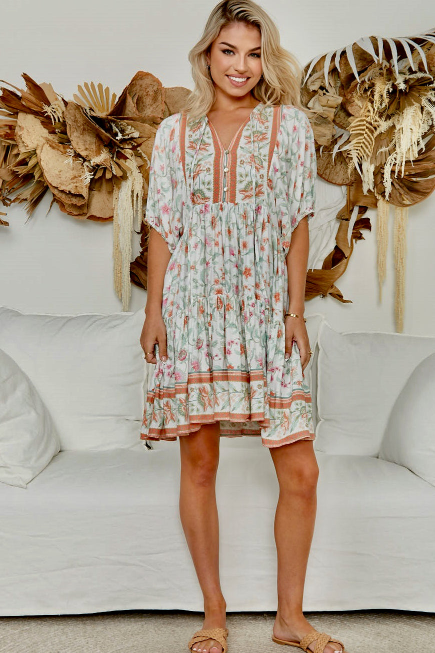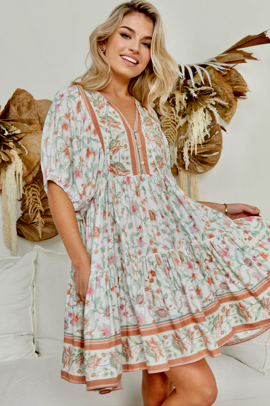 The midi dress features a beautiful boarder print neckline with piping detailing around the bust. The pattern is a gorgeous soft orange, pinks and greens with a pretty floral pattern. We love to pair this boho beauty with boots for a casual outing or sneakers for a day of shopping. Wear as a relaxed fit dress or team with a belt.