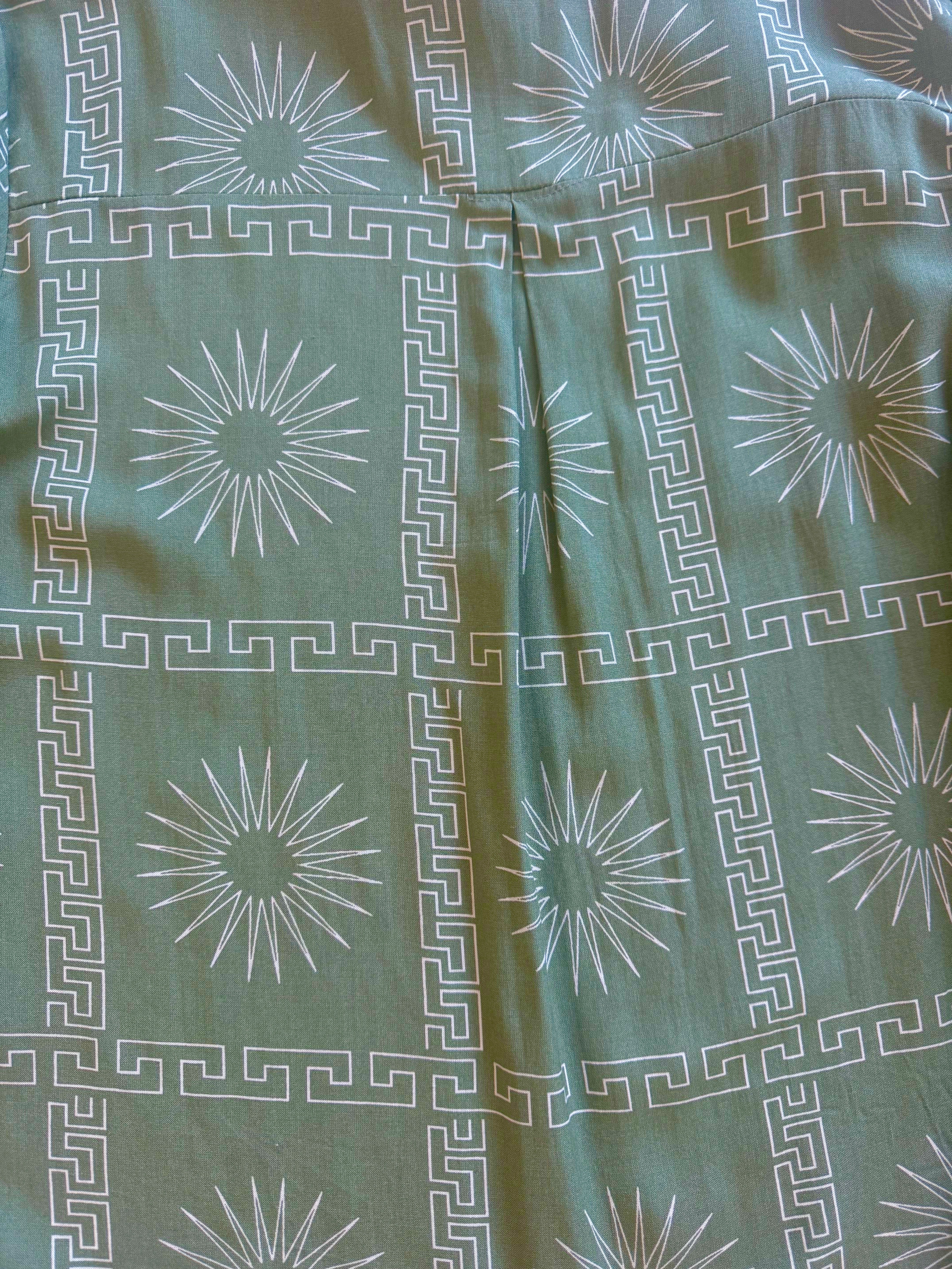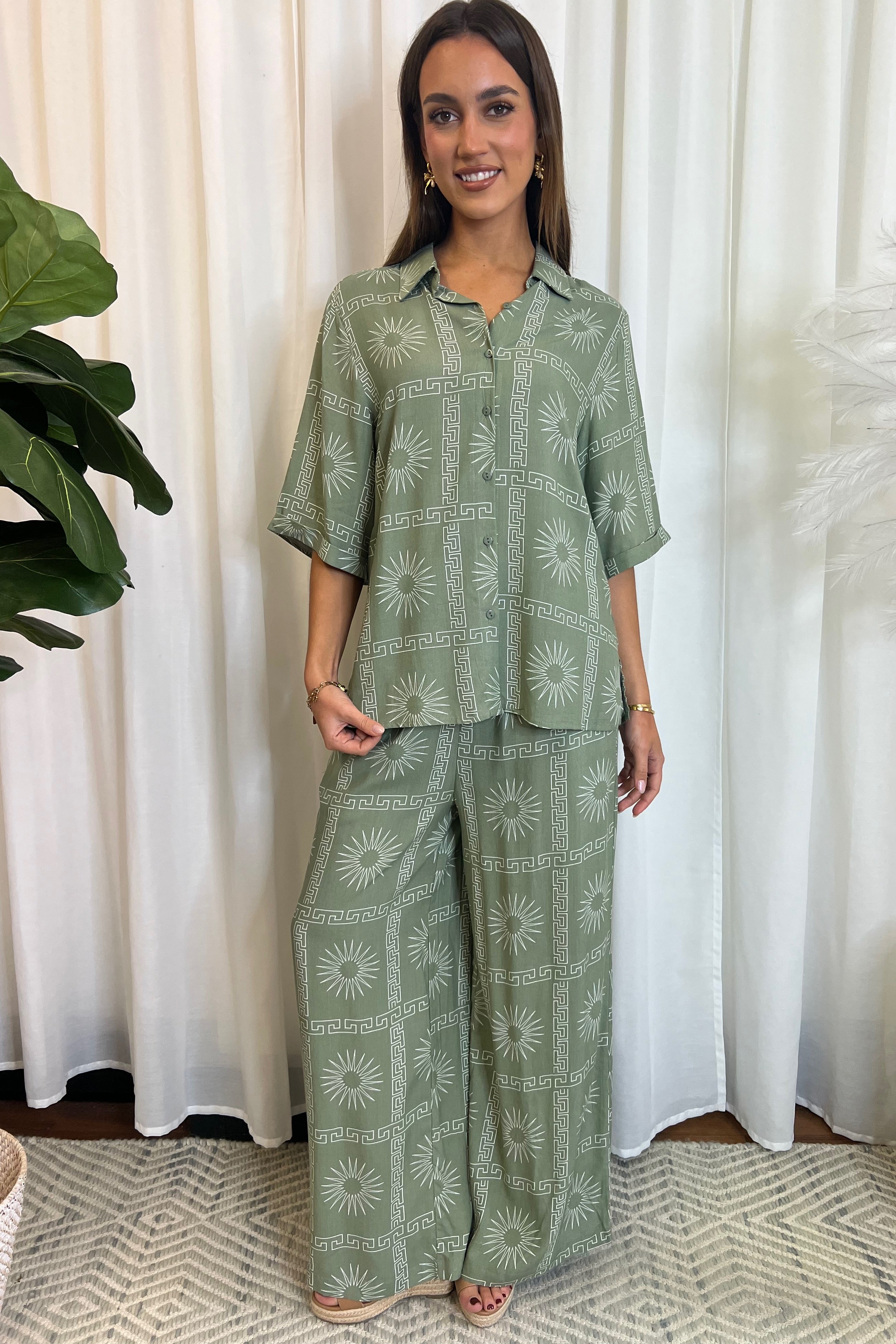 This gorgeous set includes a shirt and long pants that features a khaki base with a white sun print that is so much fun!