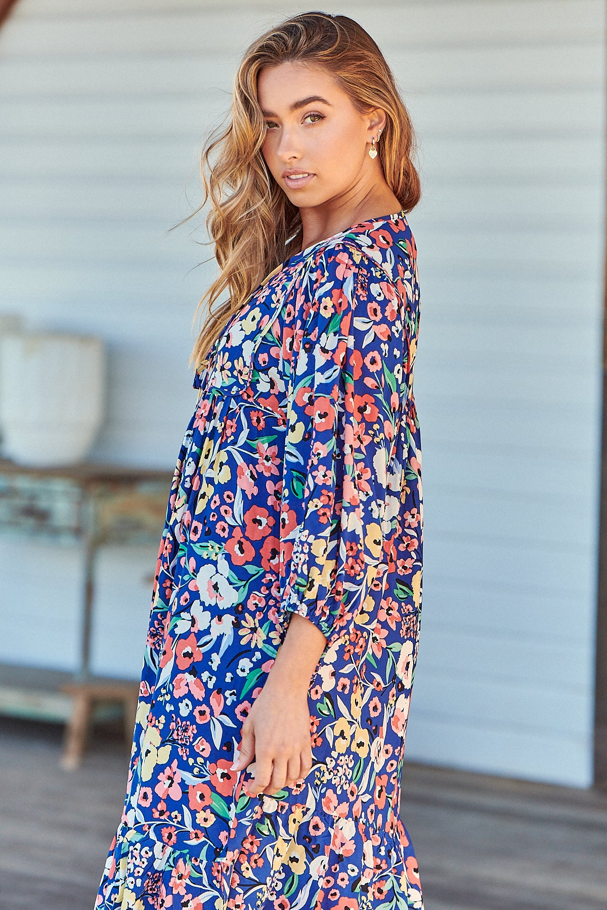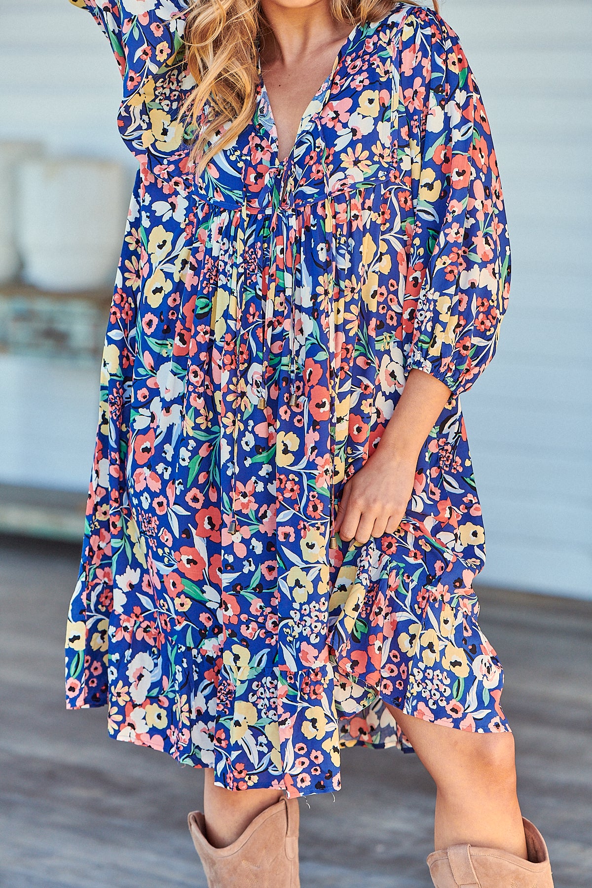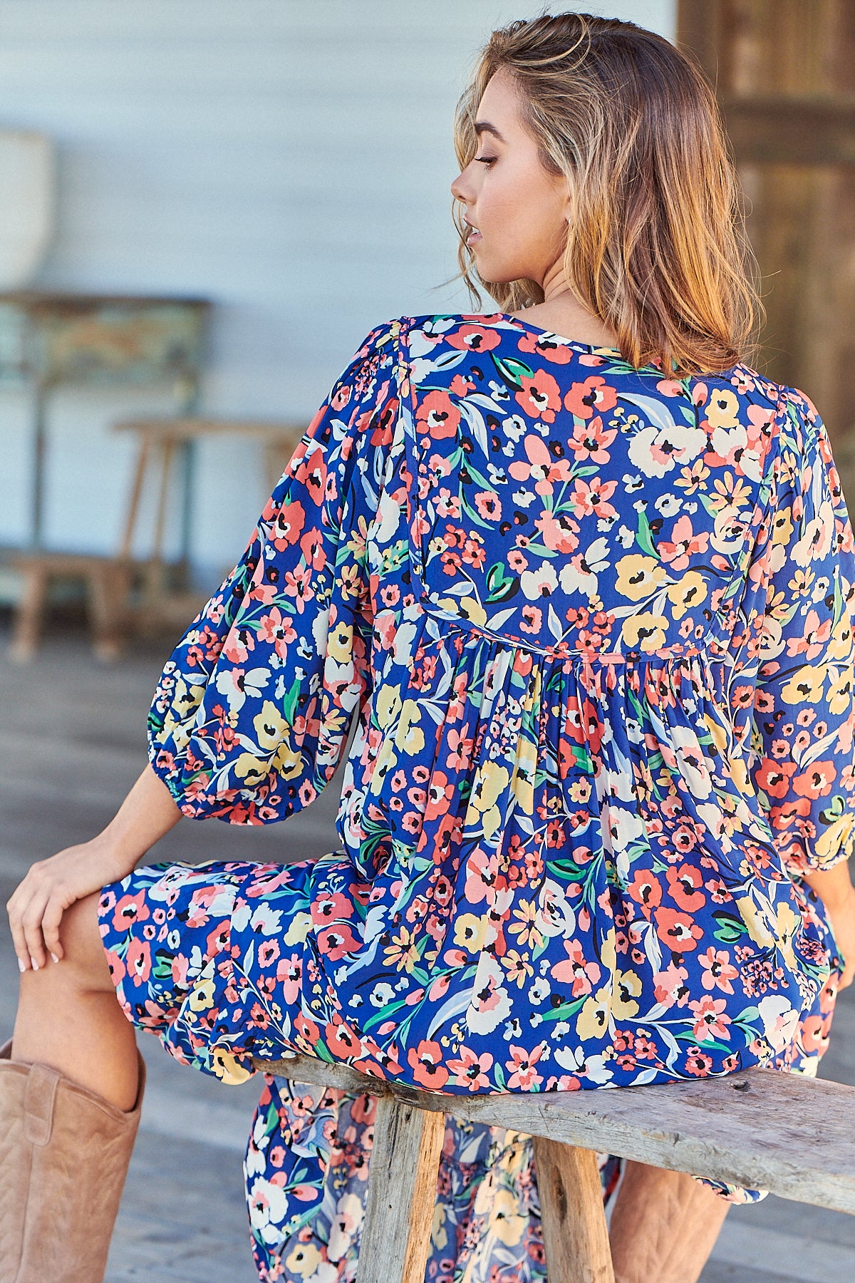Simply stunning this mini dress featured in a dramatic, flowing design with a yoked neckline and floaty silhouette.