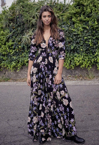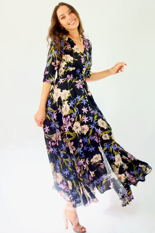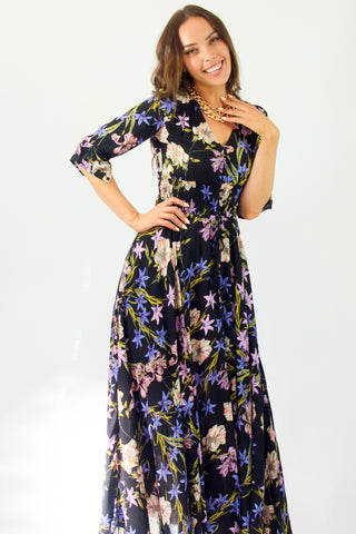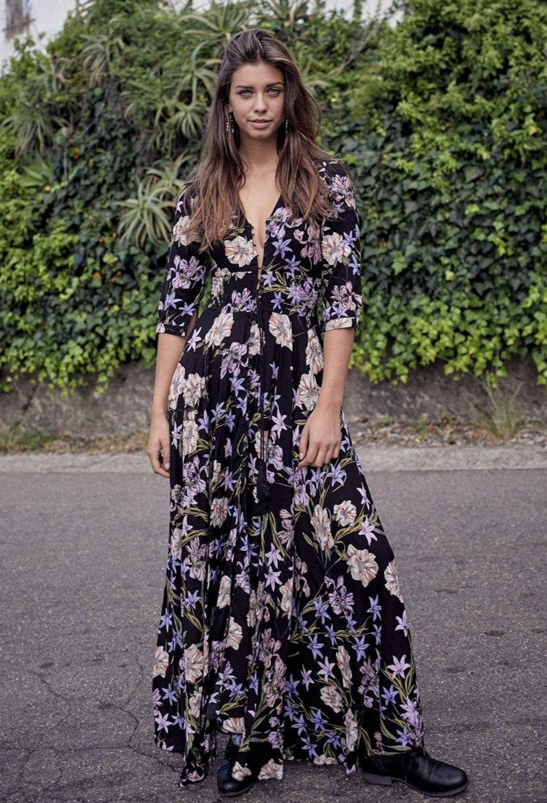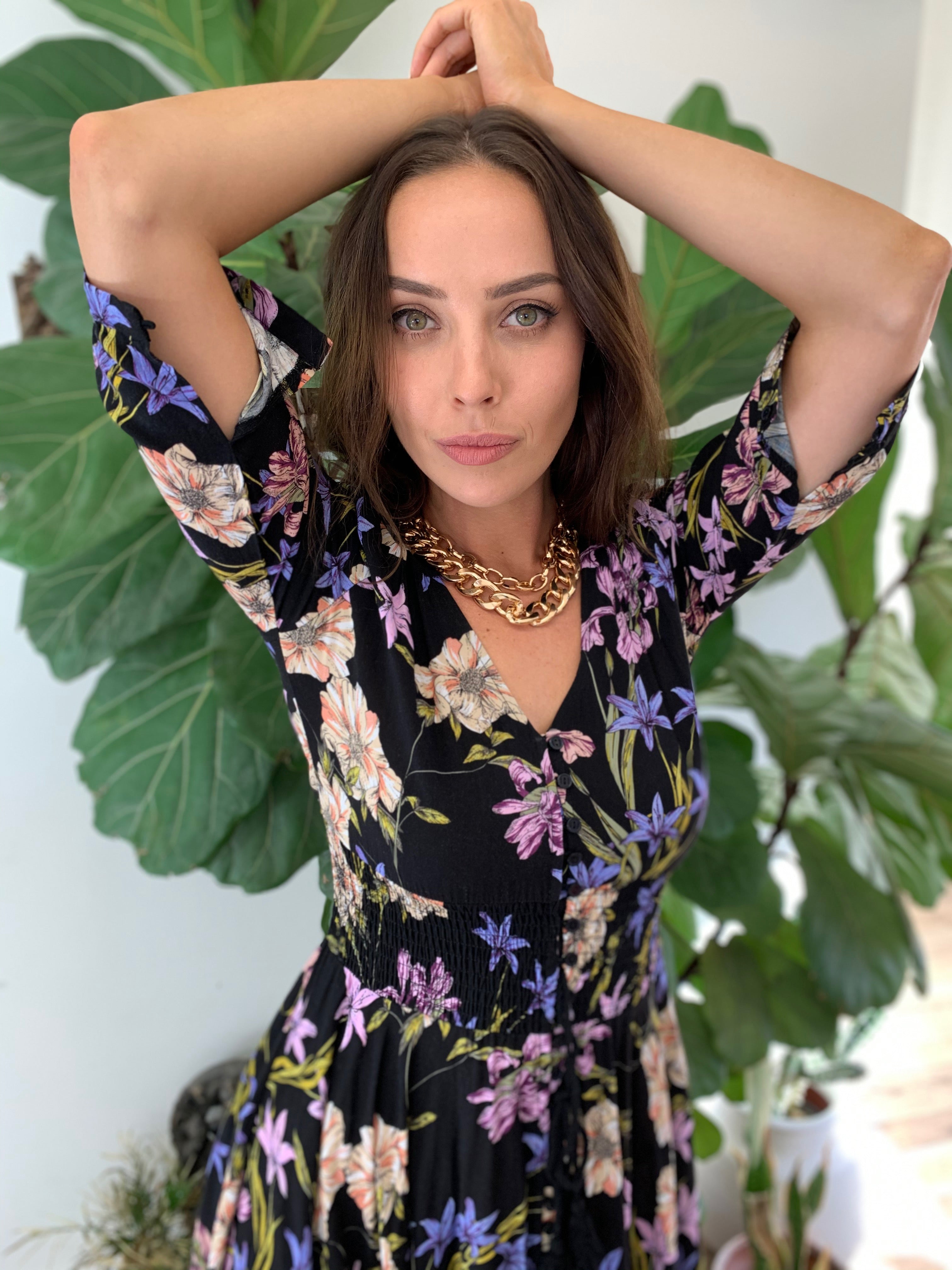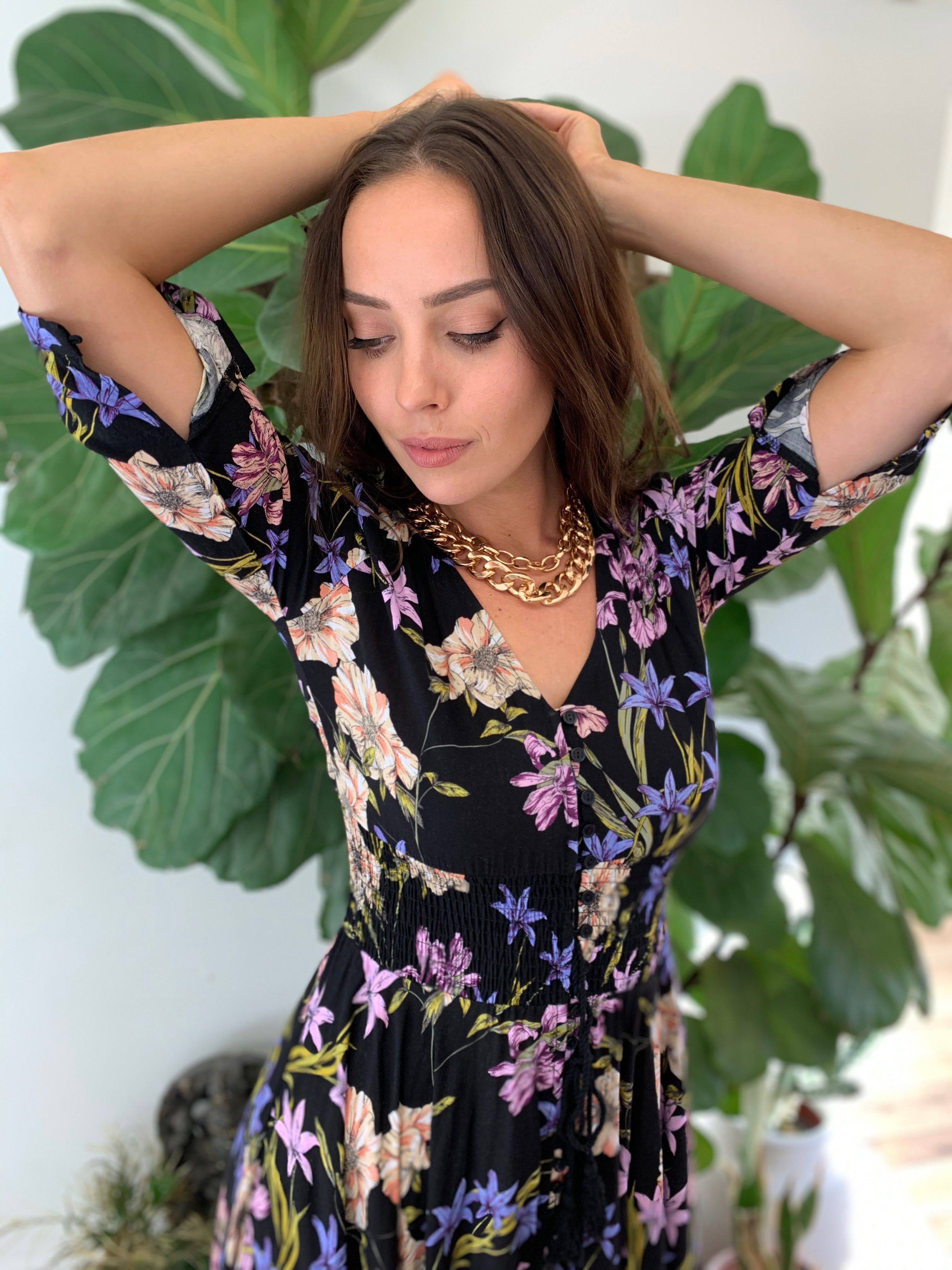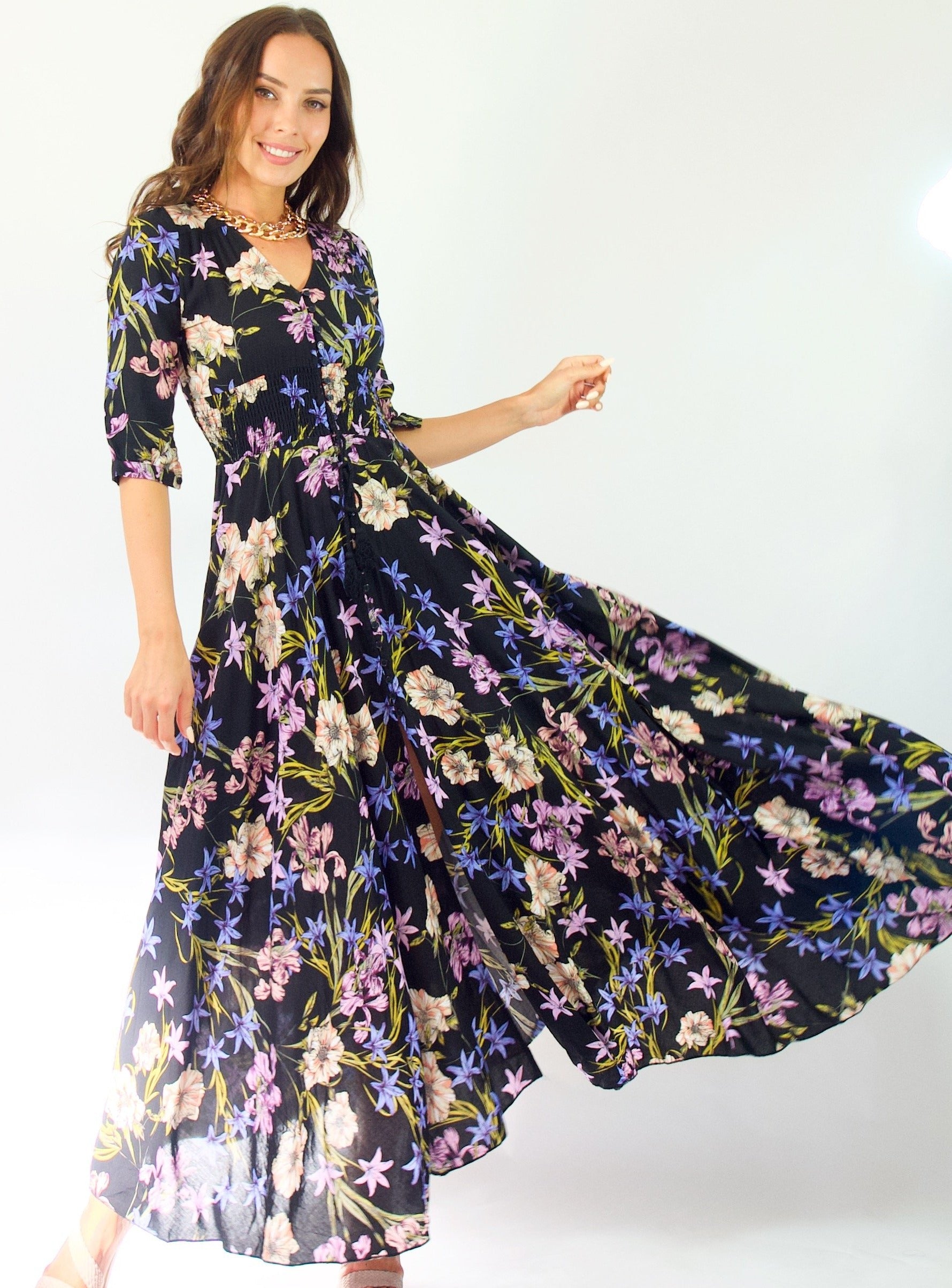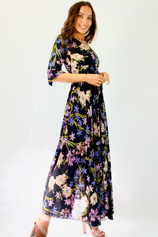 Our enchanting 'Zahalia Maxi Dress' is a black base with gorgeous pops of Pink's, purple's, orange's and green's.