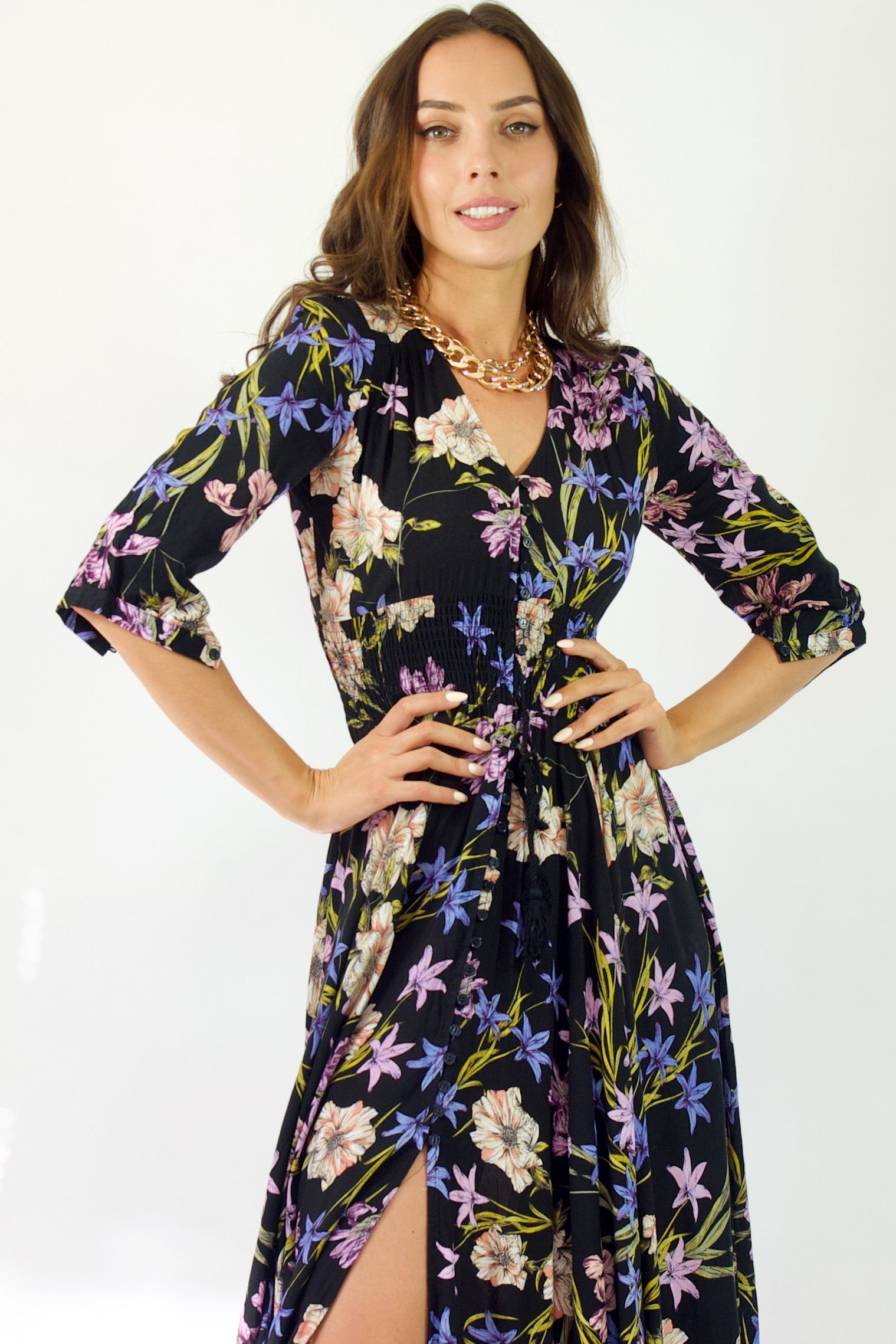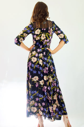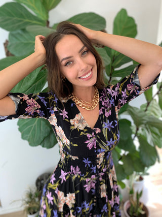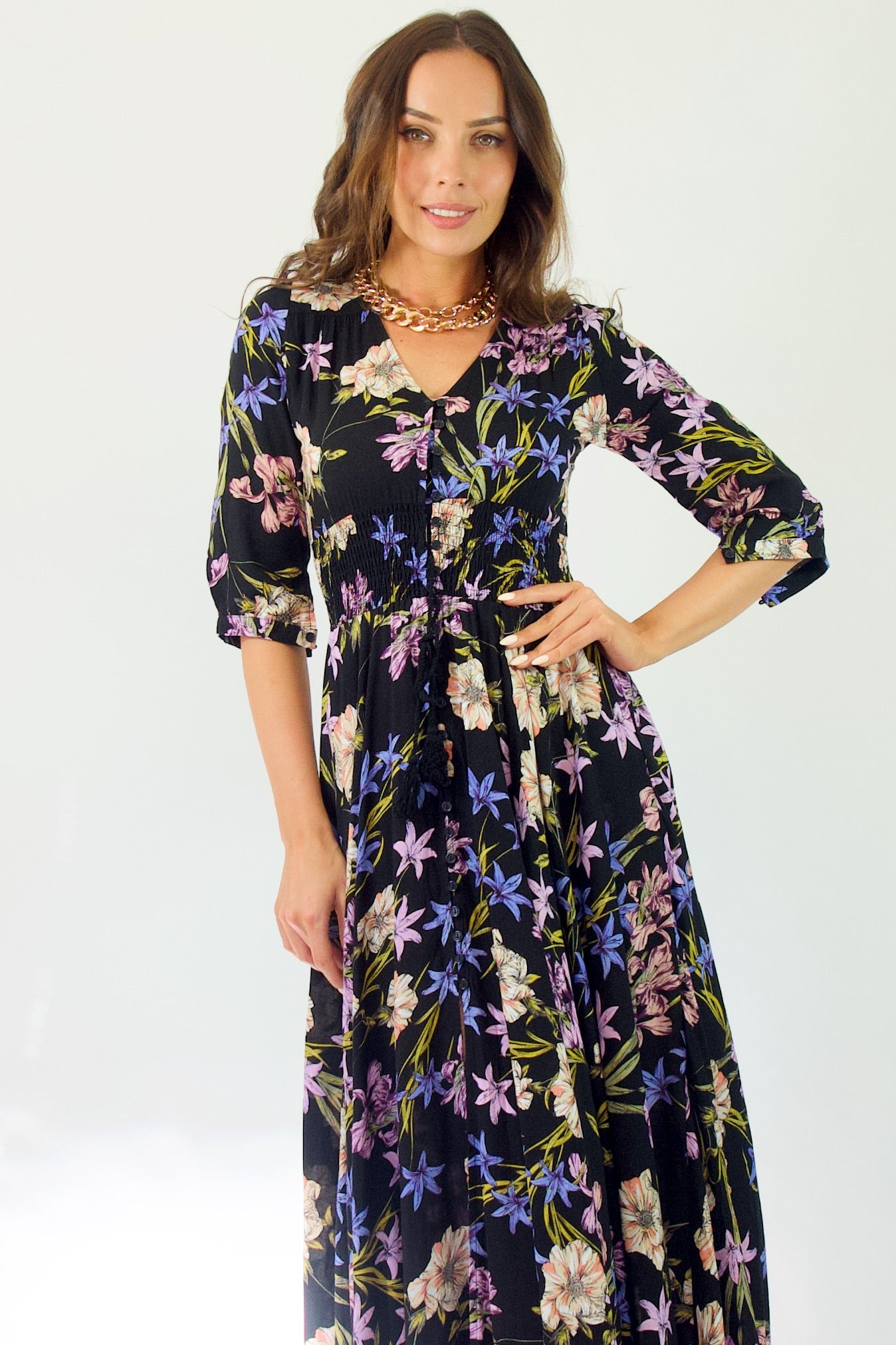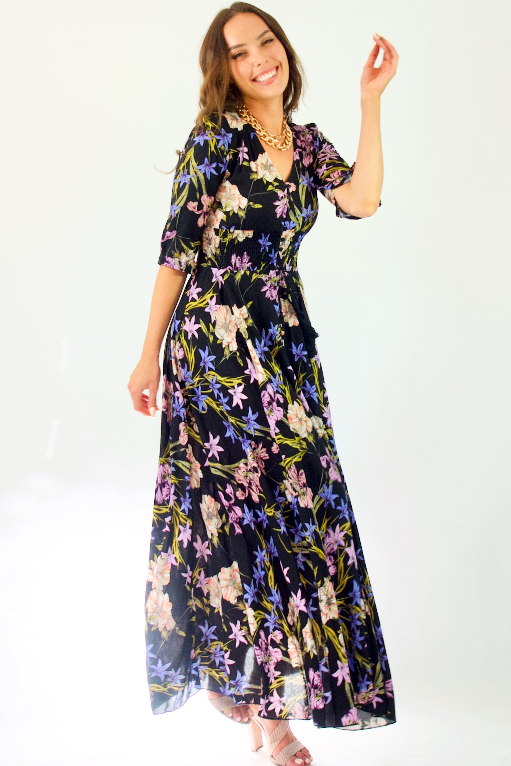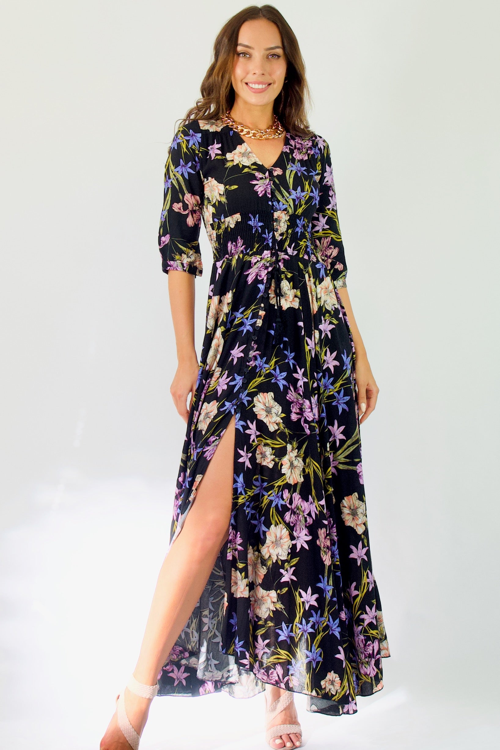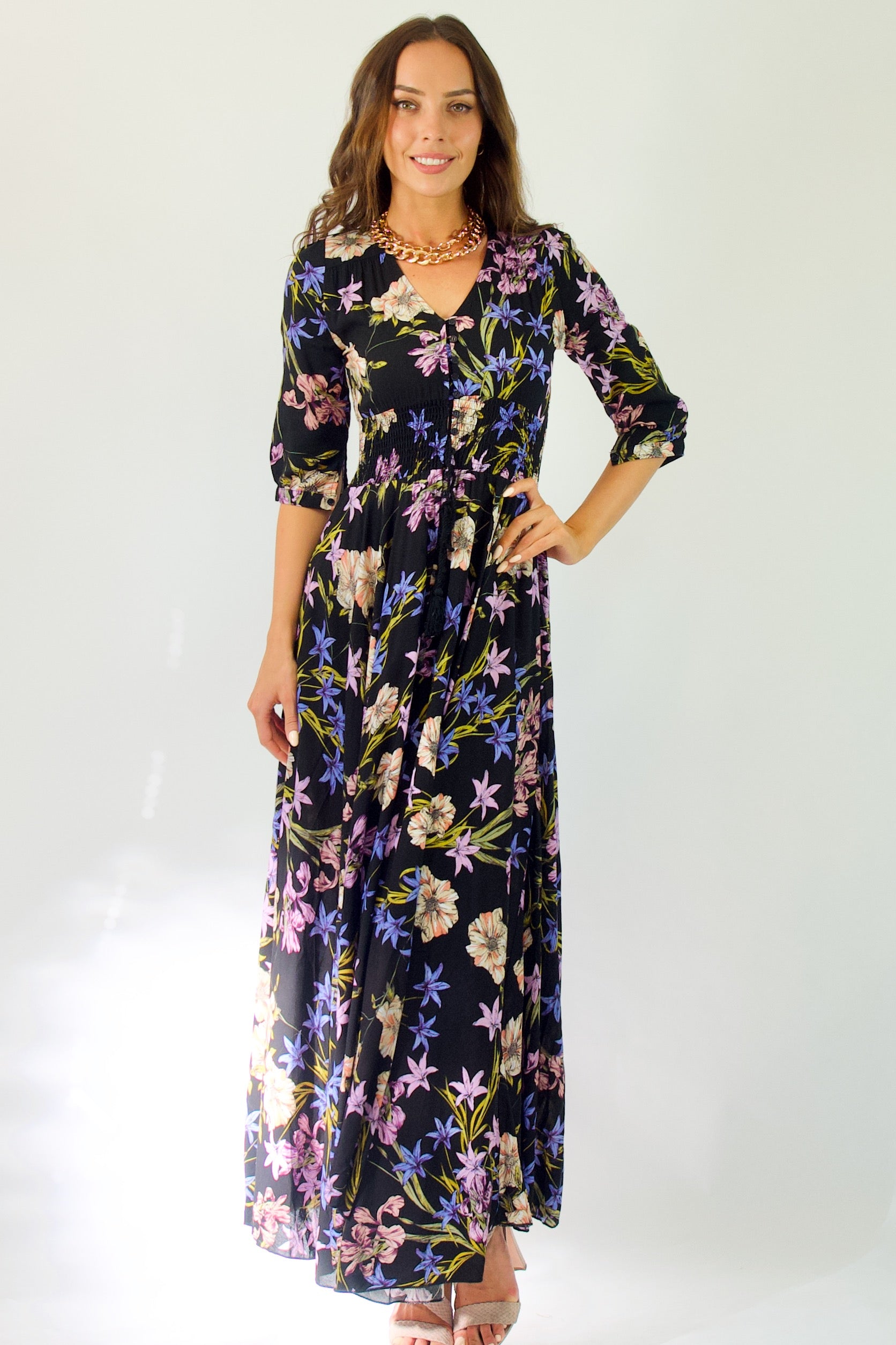 Our enchanting 'Zahalia Maxi Dress' is a black base with gorgeous pops of Pink's, purple's, orange's and green's.
